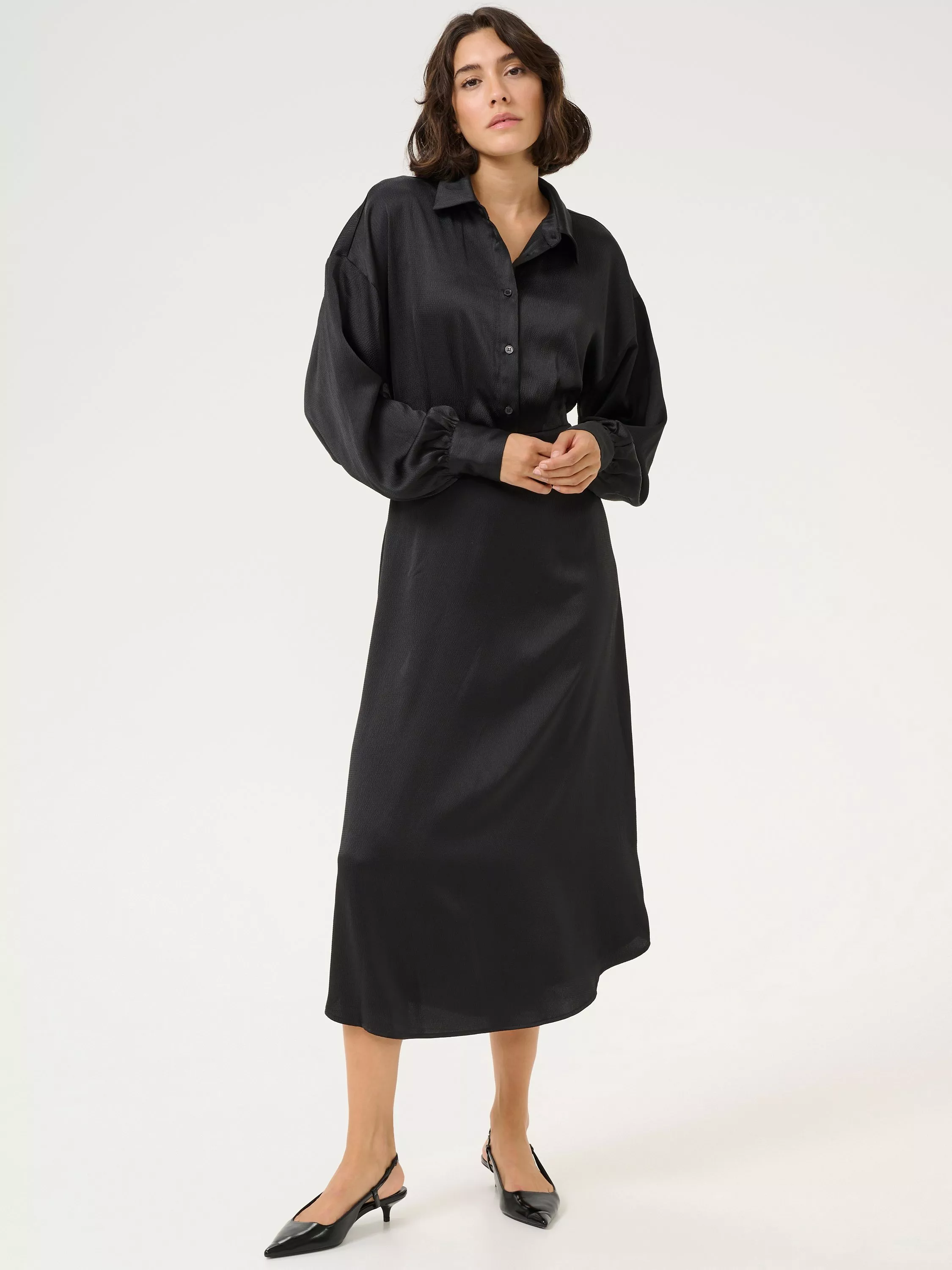 The Donna shirt dress is a timeless and versatile maxi dress made in a soft satin fabric. It has a spread collar and buttons down to the waistline, and it has a casual fit with a drop waist and drop shoulders. The sleeves are long and loose-fitting with wide, buttoned cuffs, and the dress comes down to the ankles.