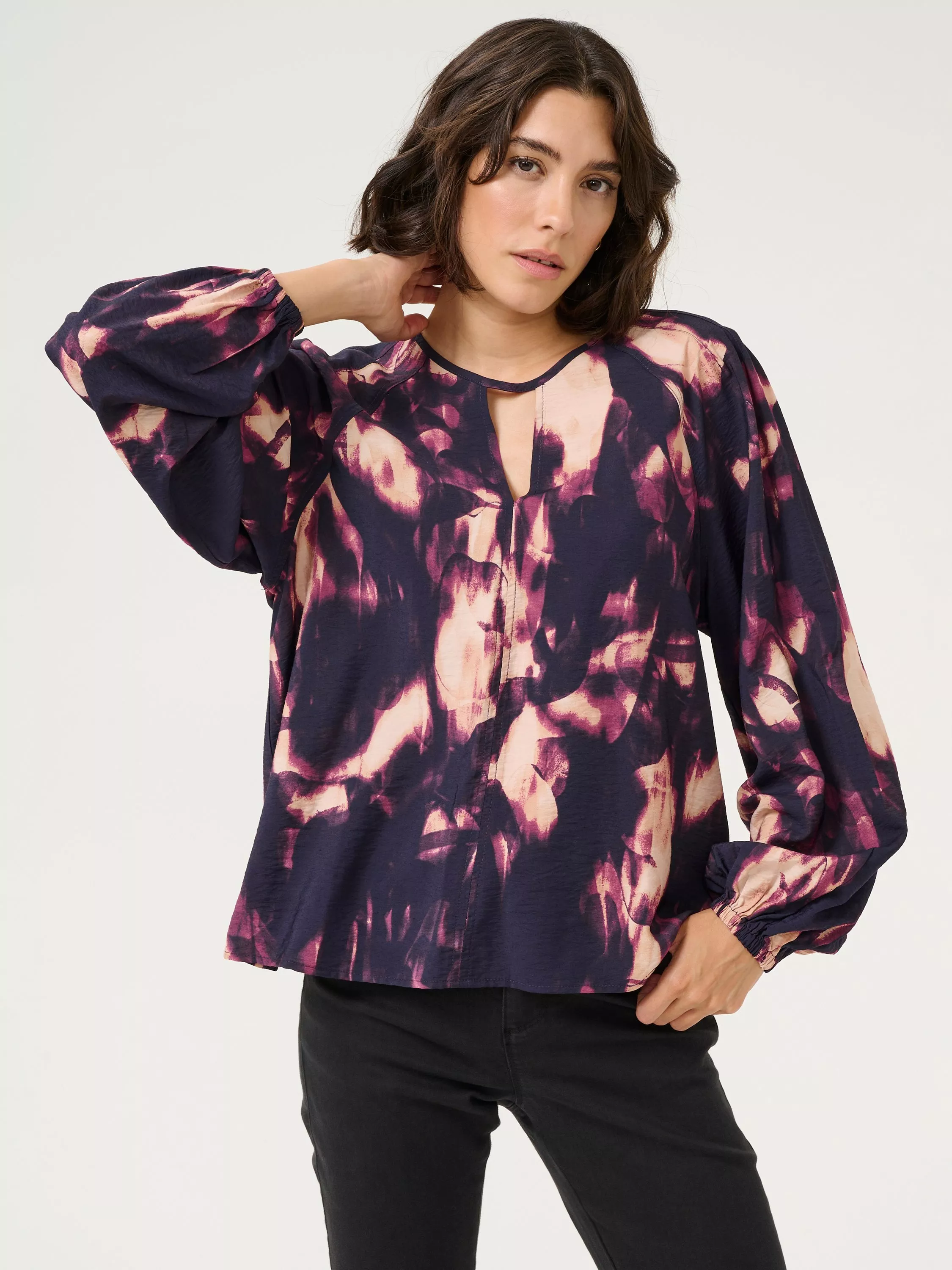 The dunora blouse is a versatile style, that will look great with both pants, jeans, and a skirt. It has a round neck with a V coutout at the front and a button fastening at the back. The sleeves are long and voluminous raglan sleeves, and they are gathered in an elastic edge.
