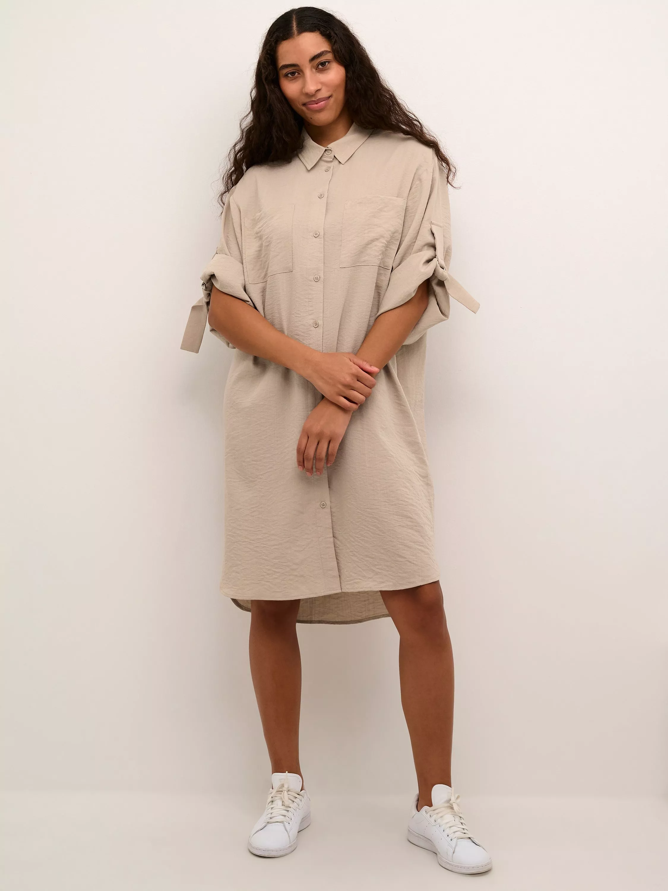 The Elenor shirt dress is a cool and casual style. It has a spread collar and button fastening, and it has a casual fit with drop shoulders. The sleeves are wide and cropped, and they have sleeve tabs with a D-ring fastening. The dress has patch chest pockets, comes down to the knees, and it has a back yoke with a box pleat.