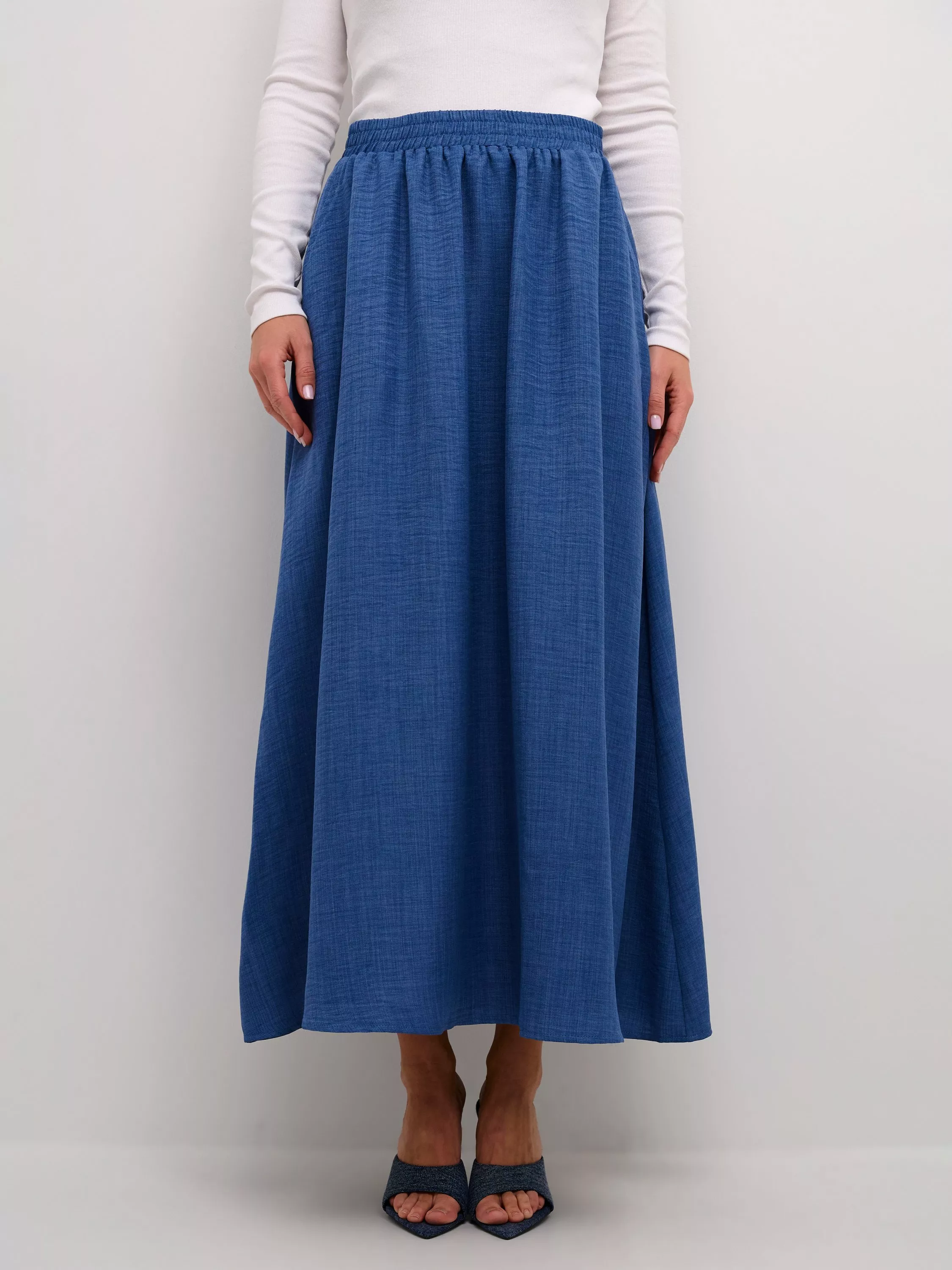 The ellen maxi skirt is a versatile everyday style, that will look good with any kind of top. It is high-waisted with an elastic waistband, and it has seamed side pockets. The skirt comes down to the ankles, and it has a flattering A-line silhouette.