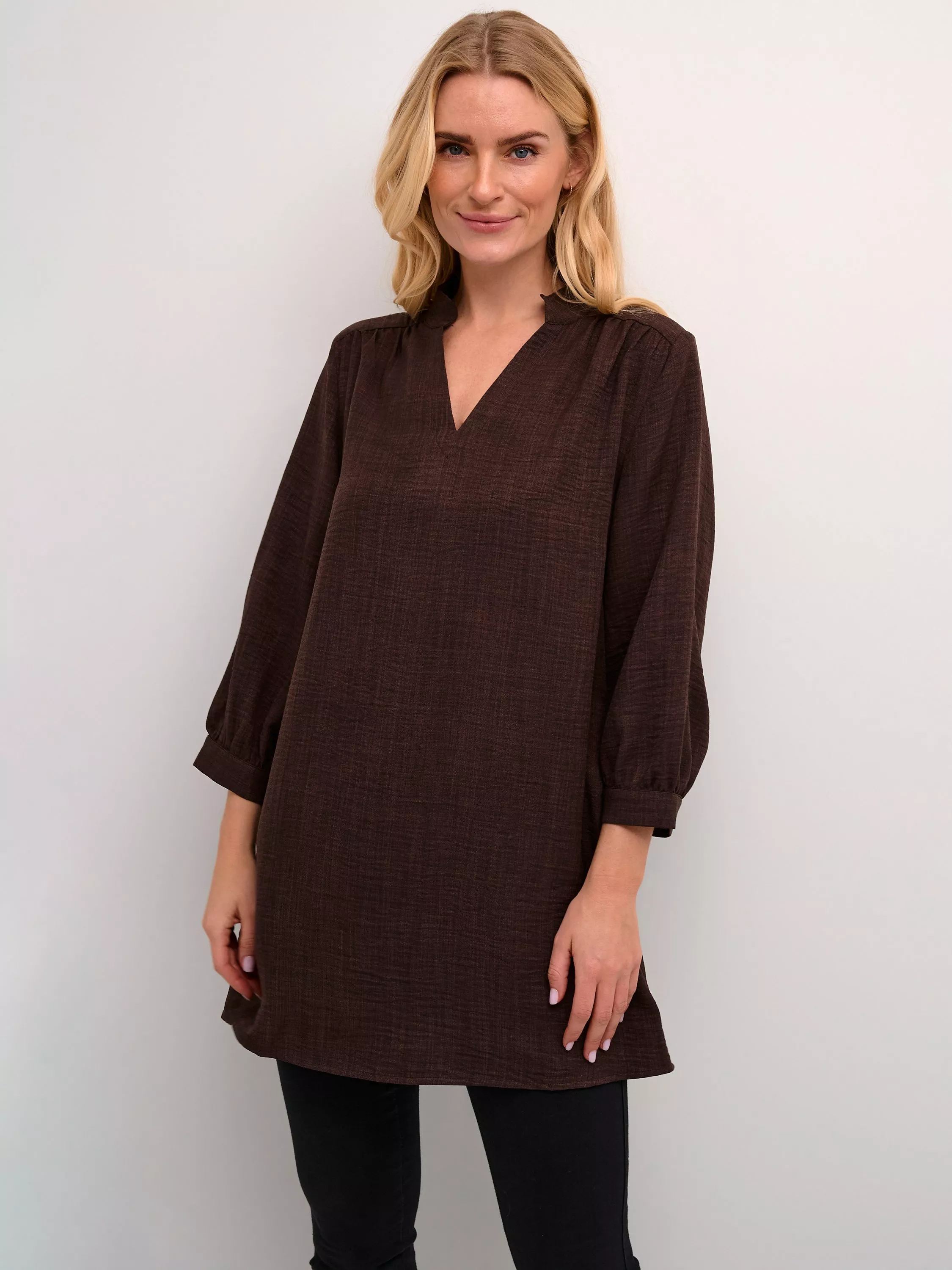 The ellen tunic is a simple and casual top, that can be styled in lots of different ways. It has a V-notch neck with a band collar, and it has a relaxed fit with pleats along the shoulder seams. The sleeves are 3/4 length with a loose fit and buttoned cuffs, and the tunic is cut below the hips.