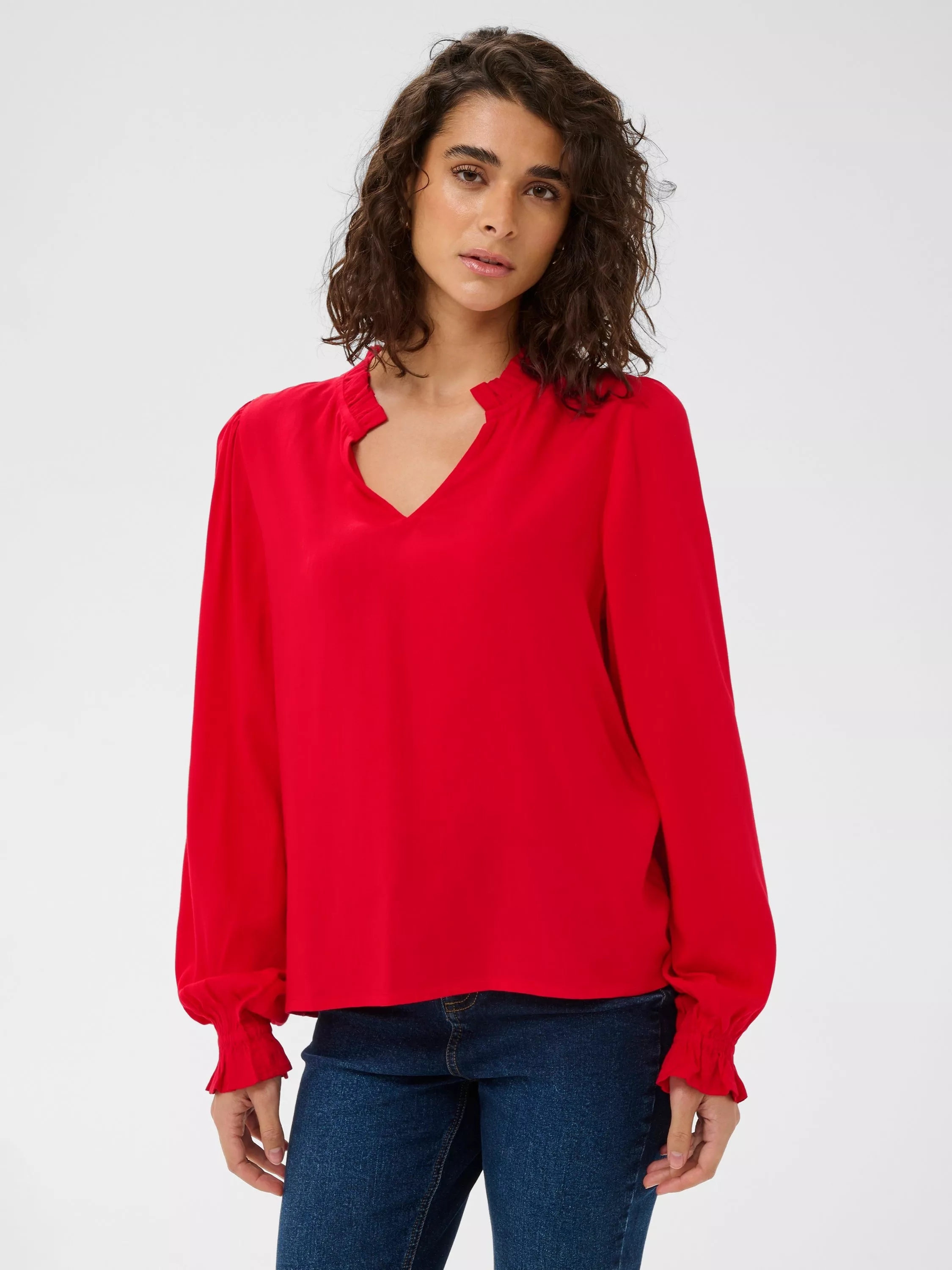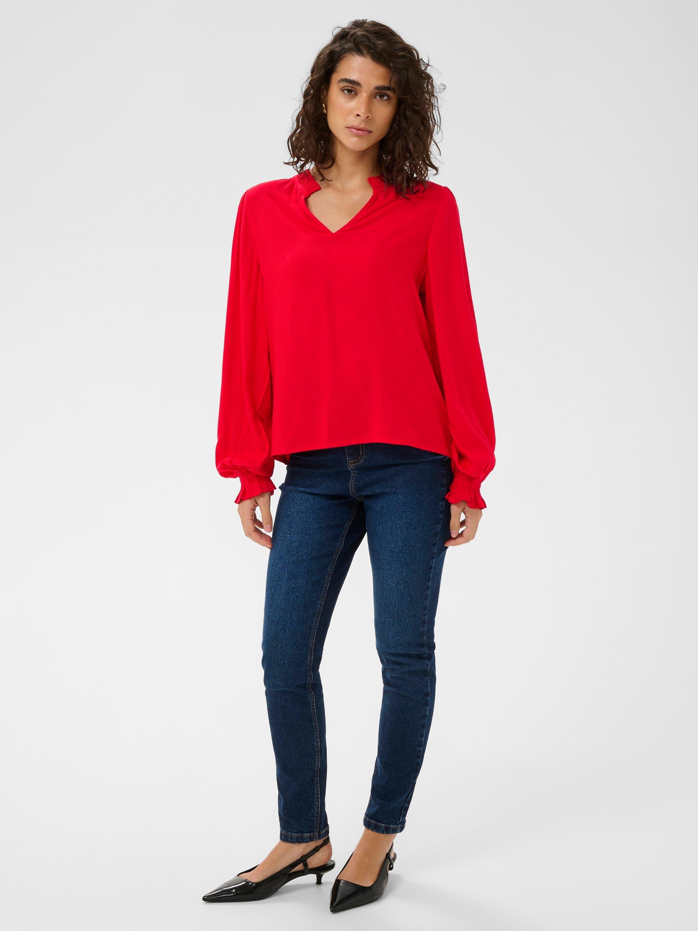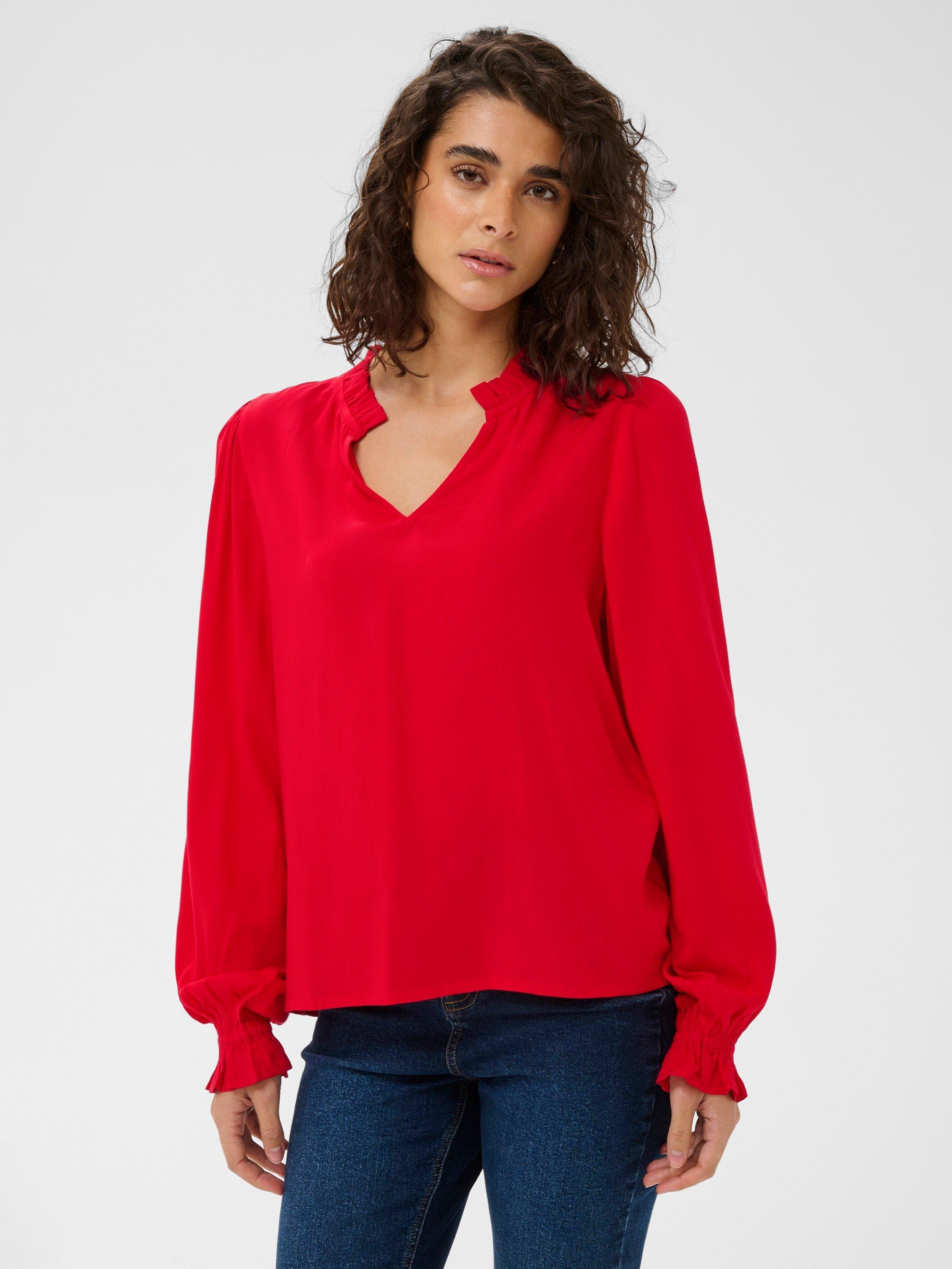 Softly draped V-neck blouse, billowy long sleeves and gathered cuffs for graceful movement, ideal for weekend outings or sophisticated office looks.