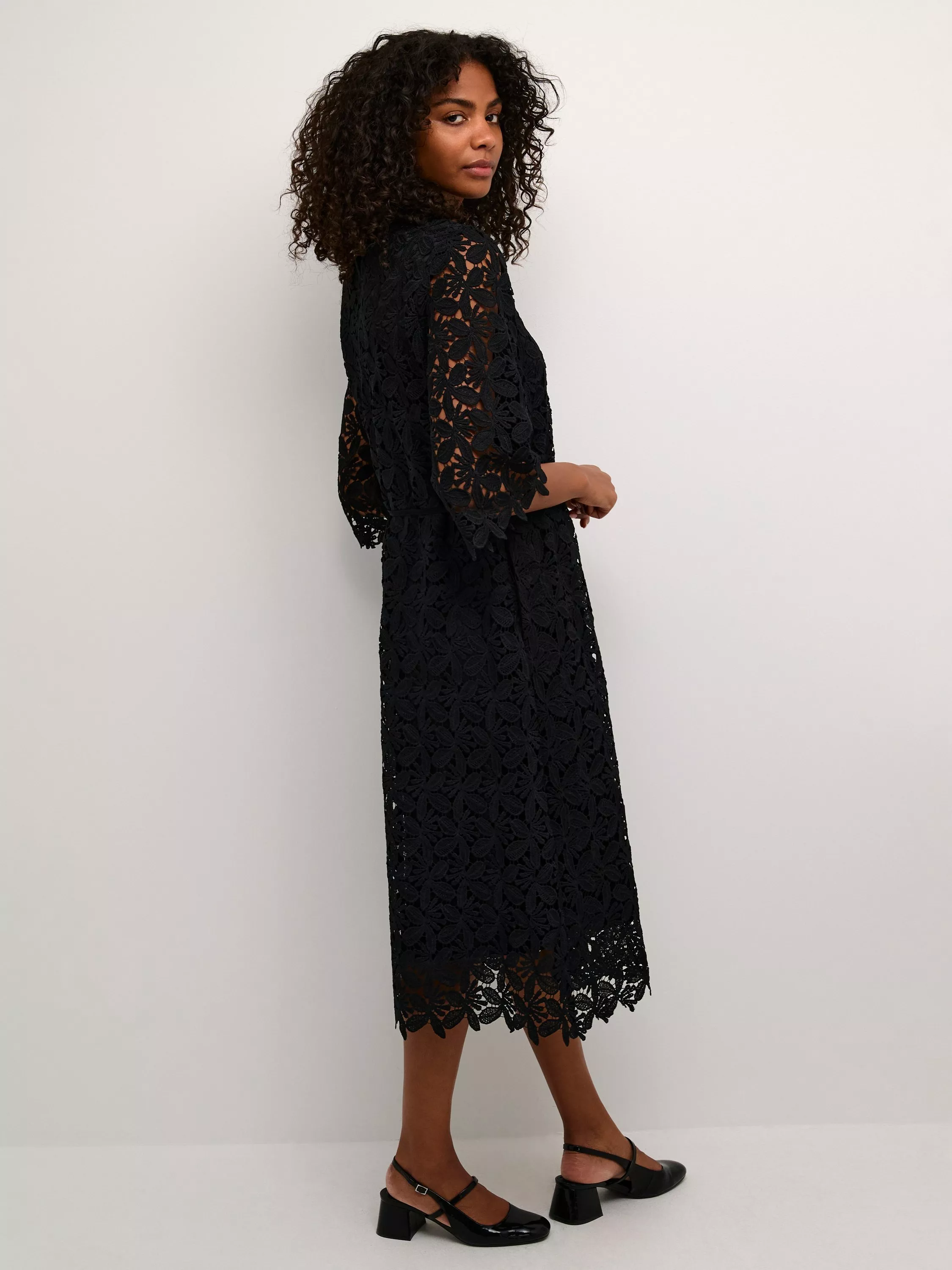 The emilia midi dress is a feminine and elegant style that you can wear on any occasion. It has a round neck and a button fastening at the back, and it has a regular fit with a tying belt at the waist. The sleeves are 3/4 length with a straight fit, and the dress is made in a beautiful lace fabric with a sleeveless lining.