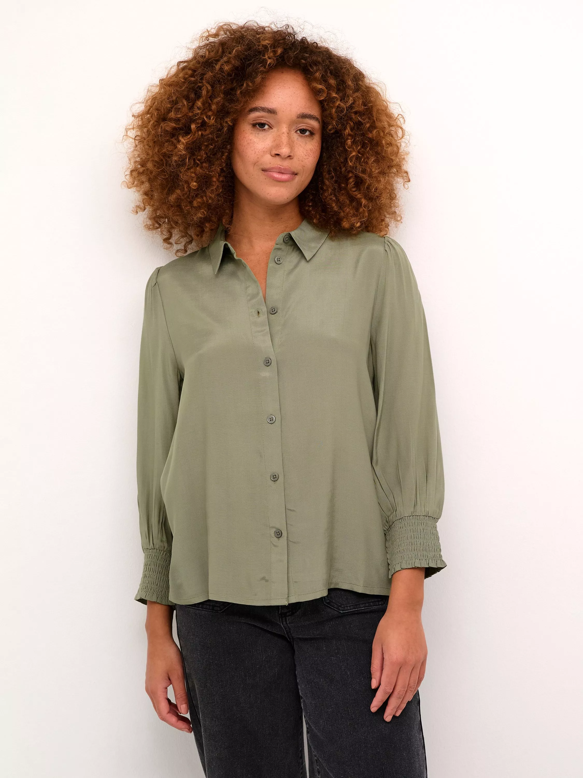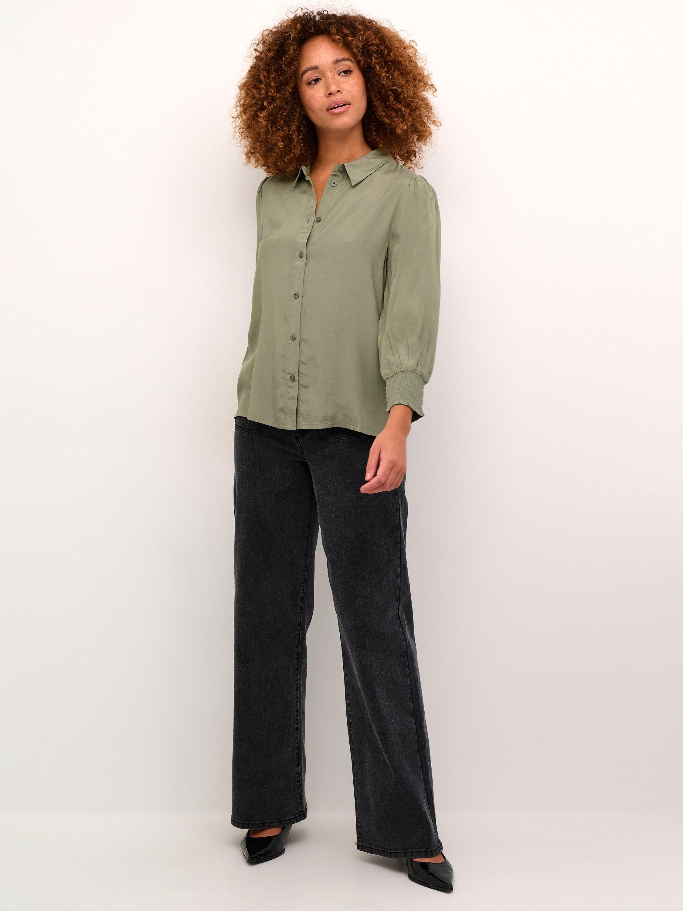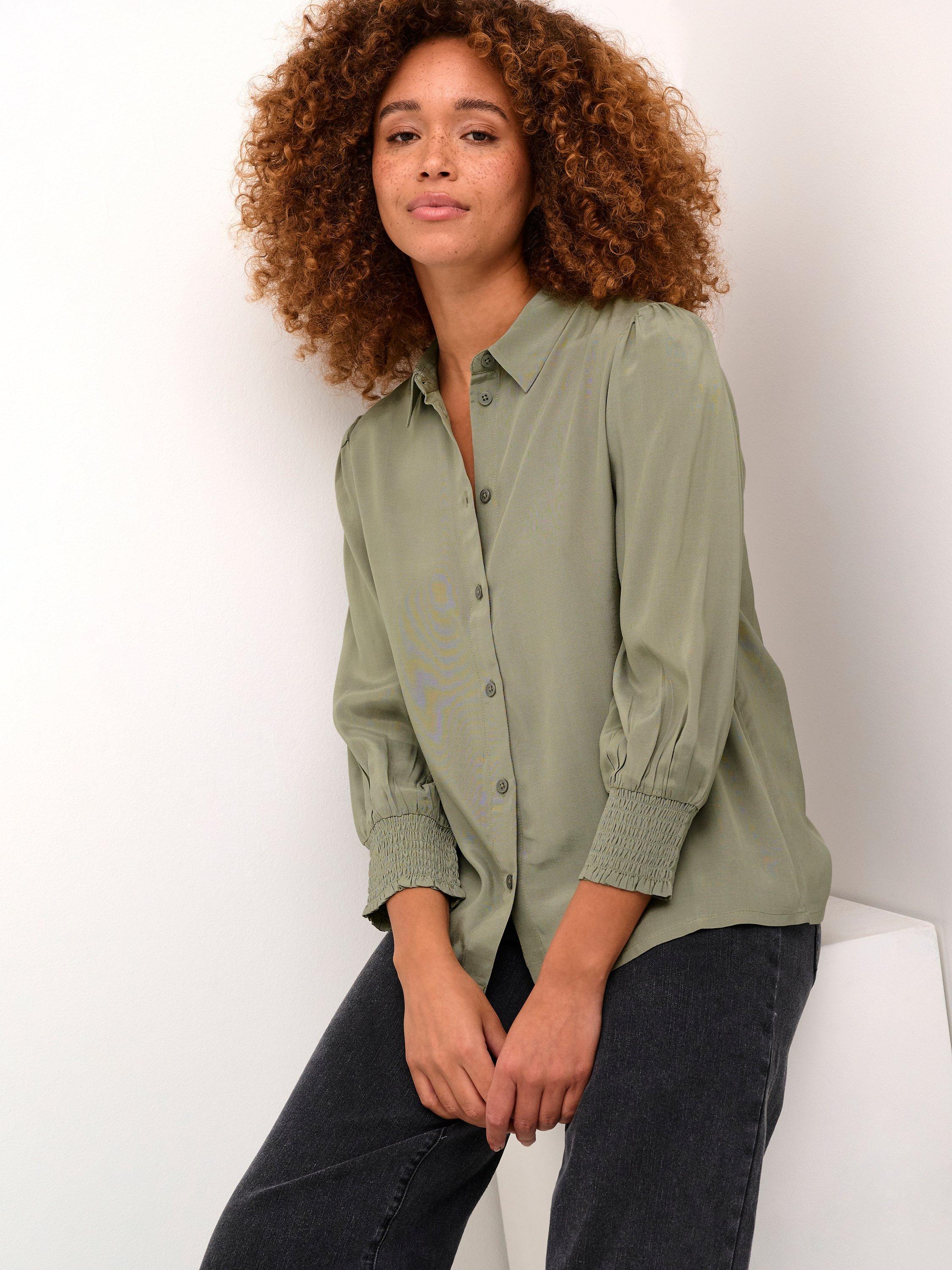 The emine shirt is a simple top that is easy to style, and it will go great with both pants, jeans, and a skirt. It has a spread collar and button fastening, and it has a regular fit. The sleeves are 3/4 length with a loose fit, and they are gathered in wide smock cuffs.