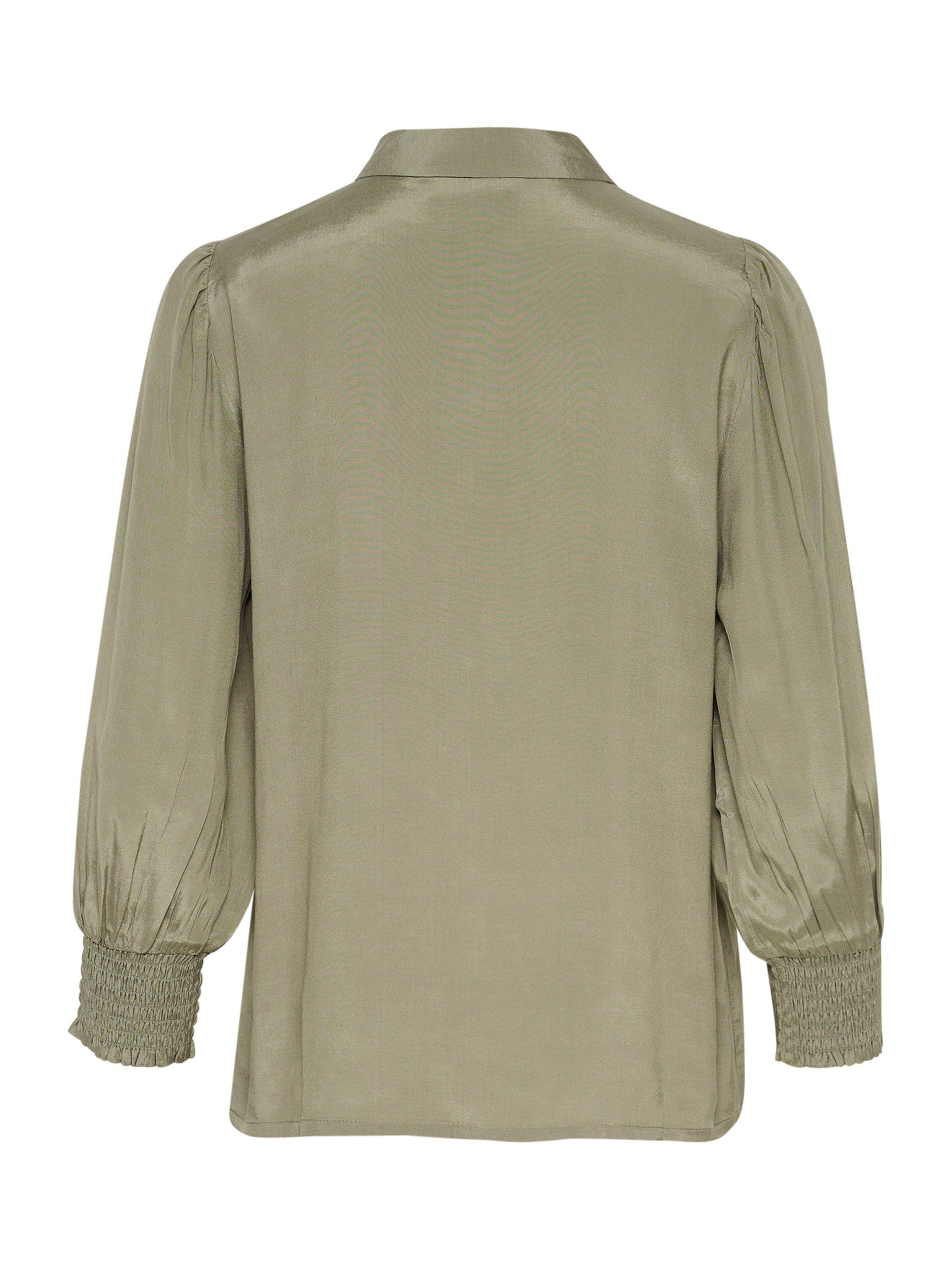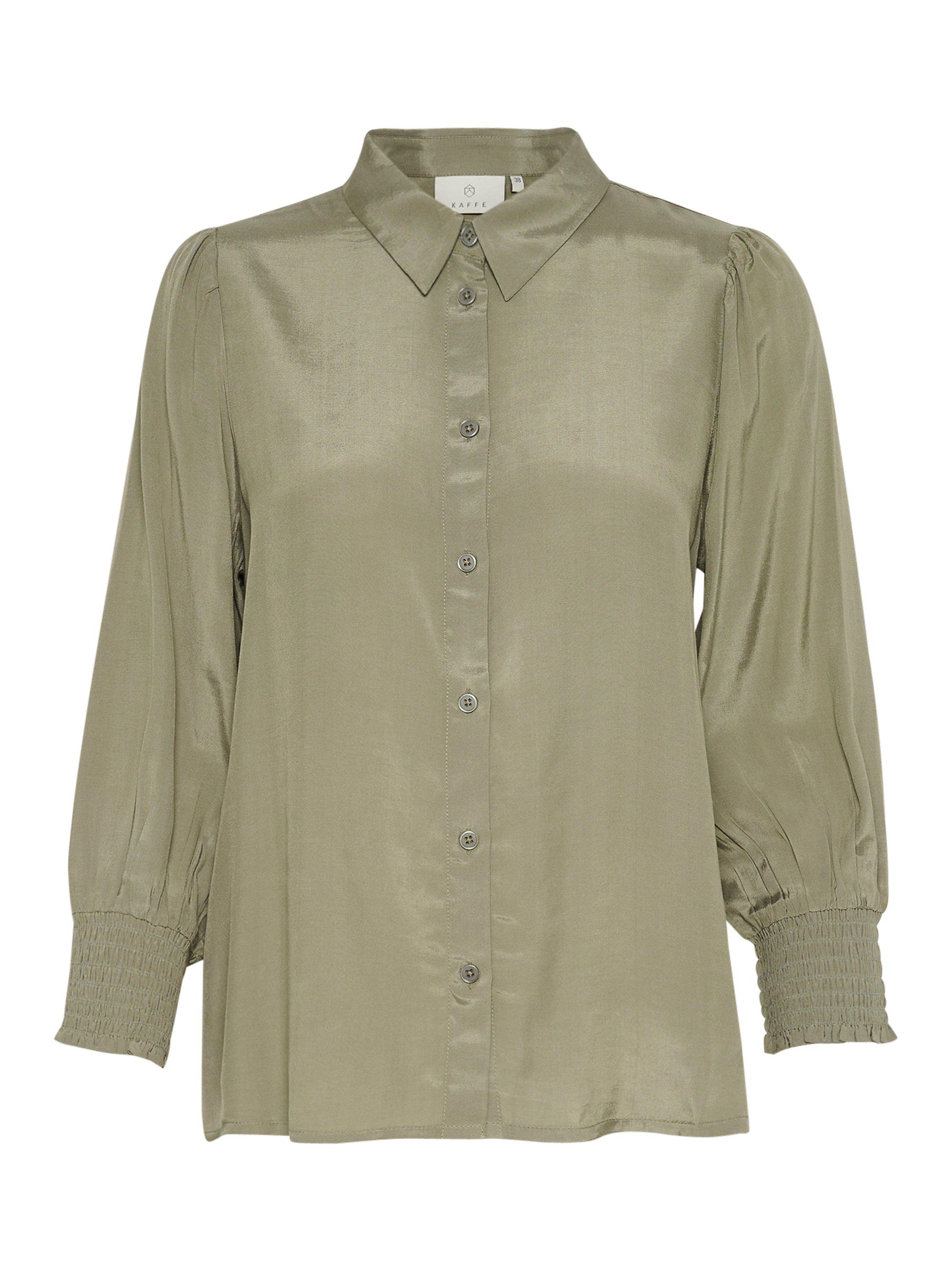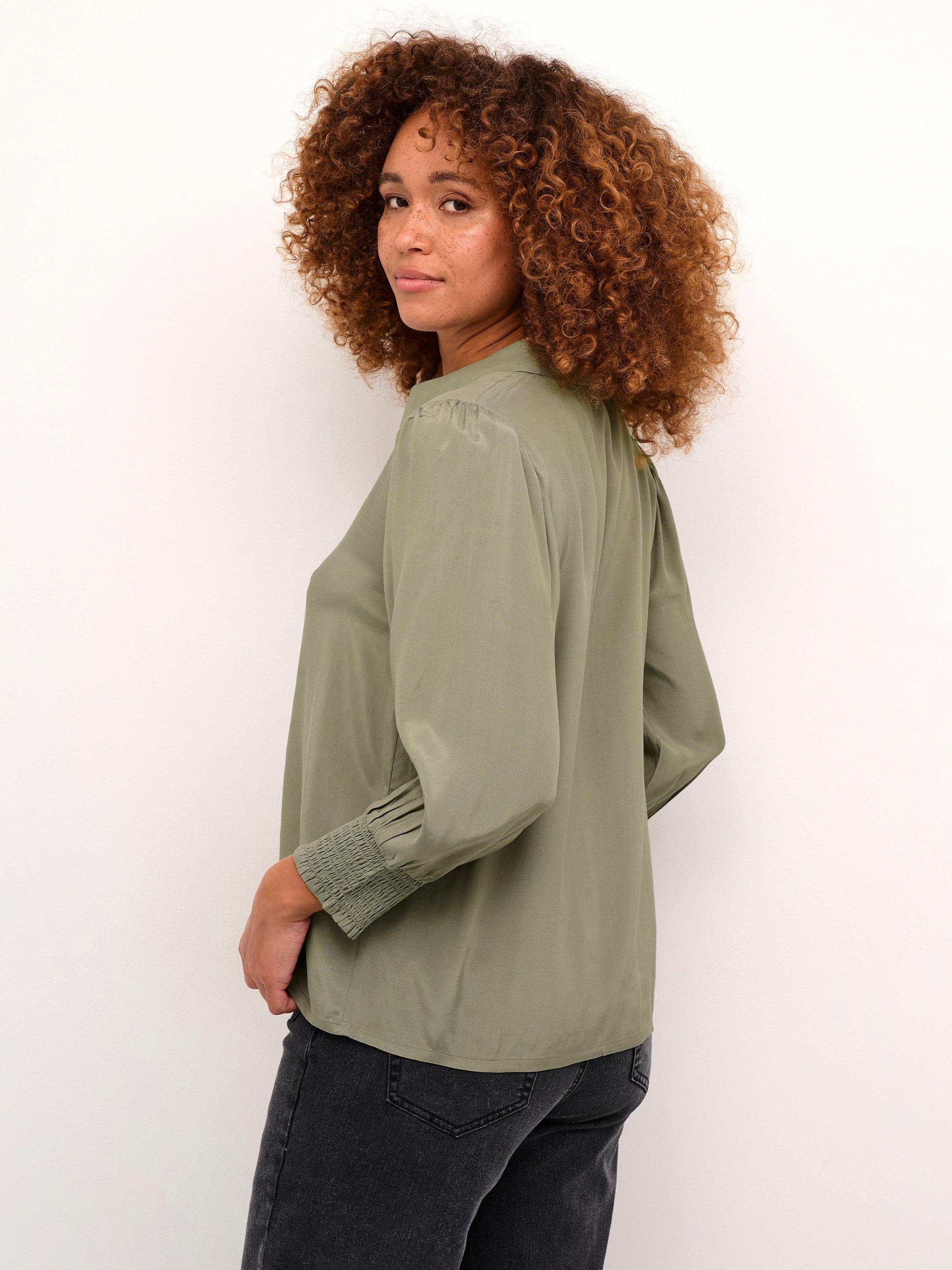The emine shirt is a simple top that is easy to style, and it will go great with both pants, jeans, and a skirt. It has a spread collar and button fastening, and it has a regular fit. The sleeves are 3/4 length with a loose fit, and they are gathered in wide smock cuffs.