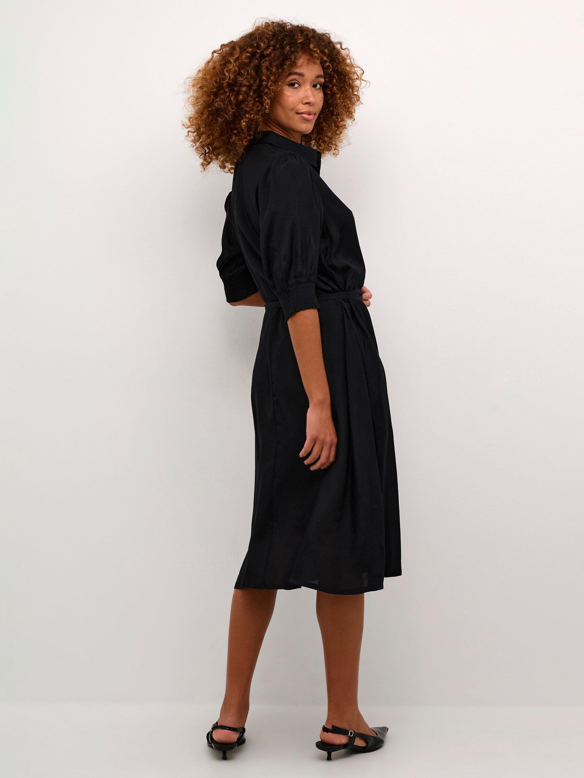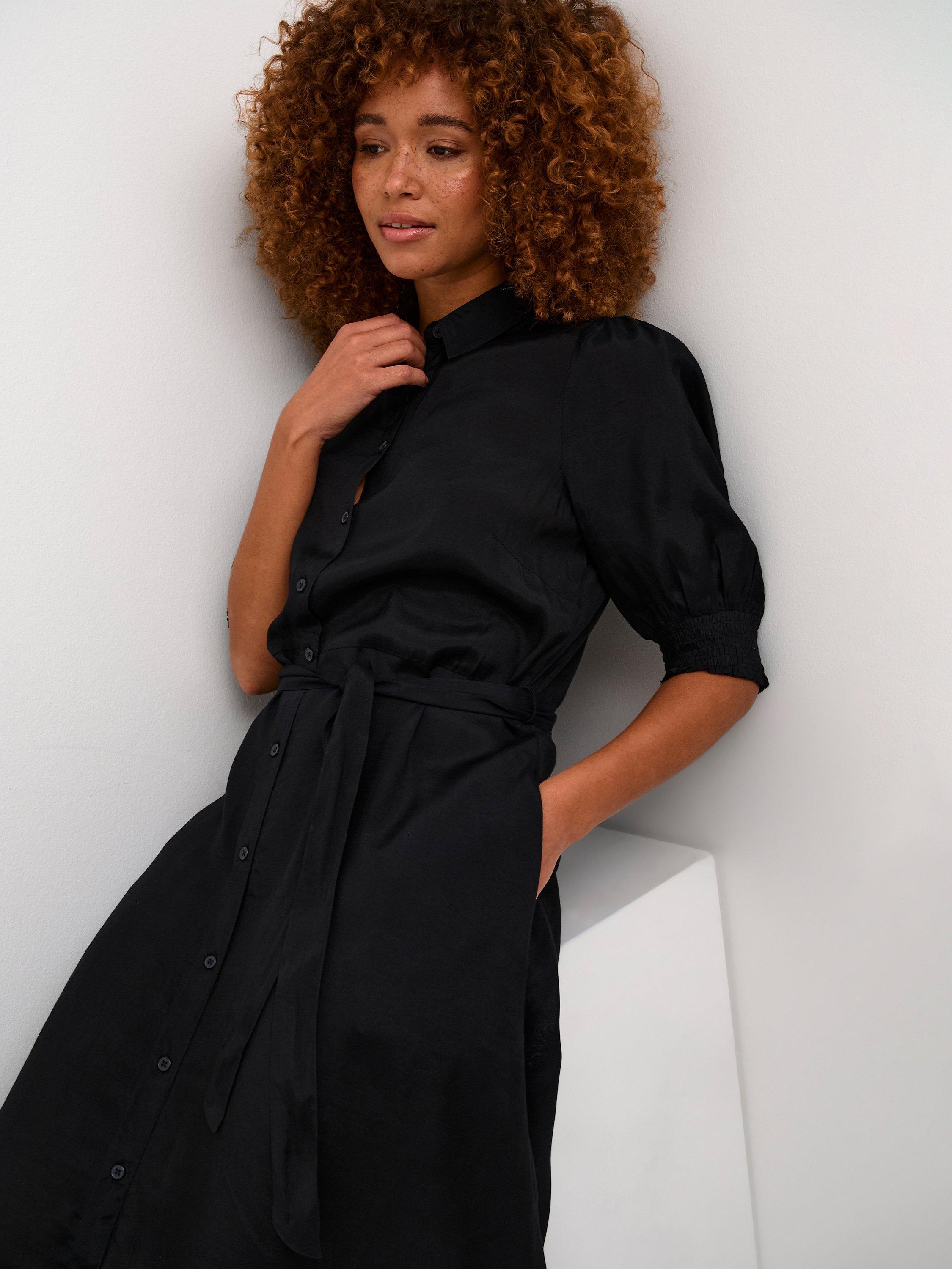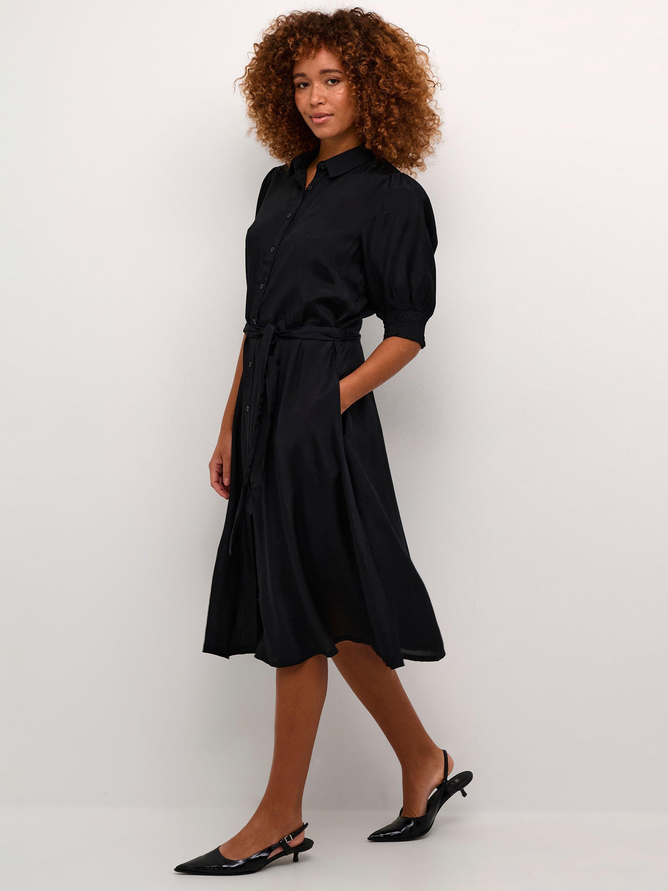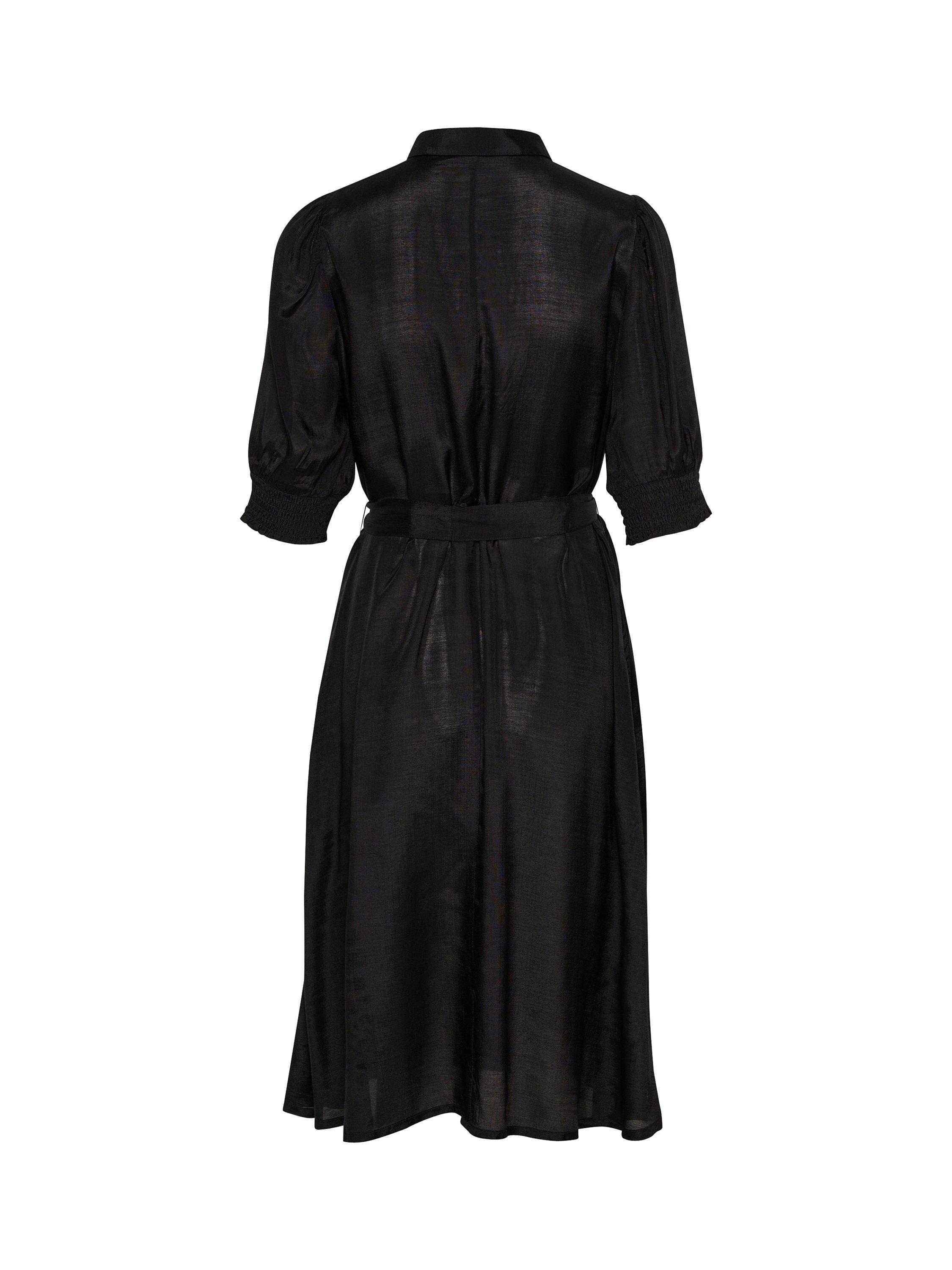 The emine shirt dress is the perfect everyday style to add to your wardrobe. It has a spread collar and buttons, and it has a regular fit with a tying belt at the waist. The sleeves are half-length with a loose fit, and they are gathered in a smock cuff. The dress has seamed side pockets, and it is cut below the knees.