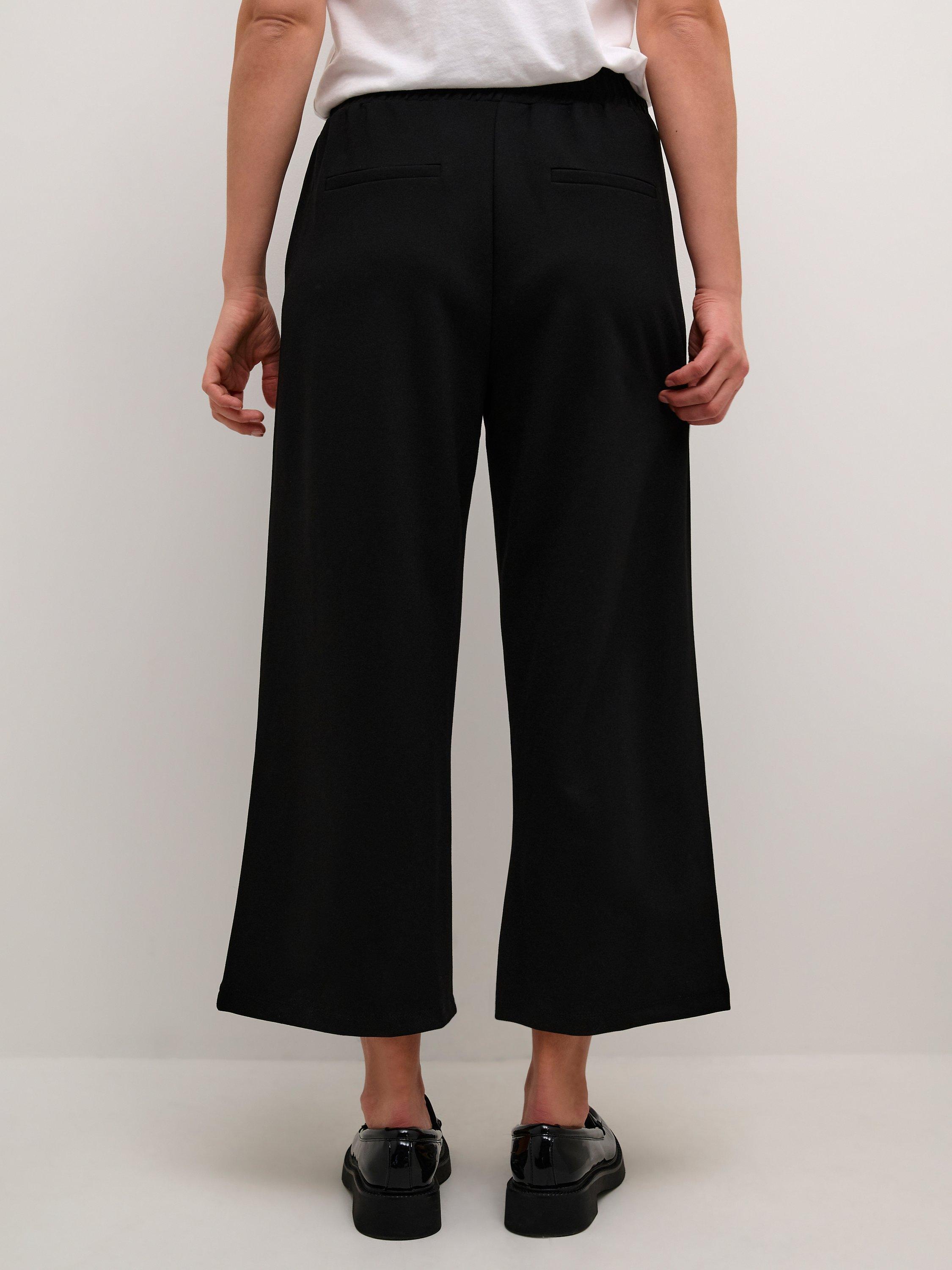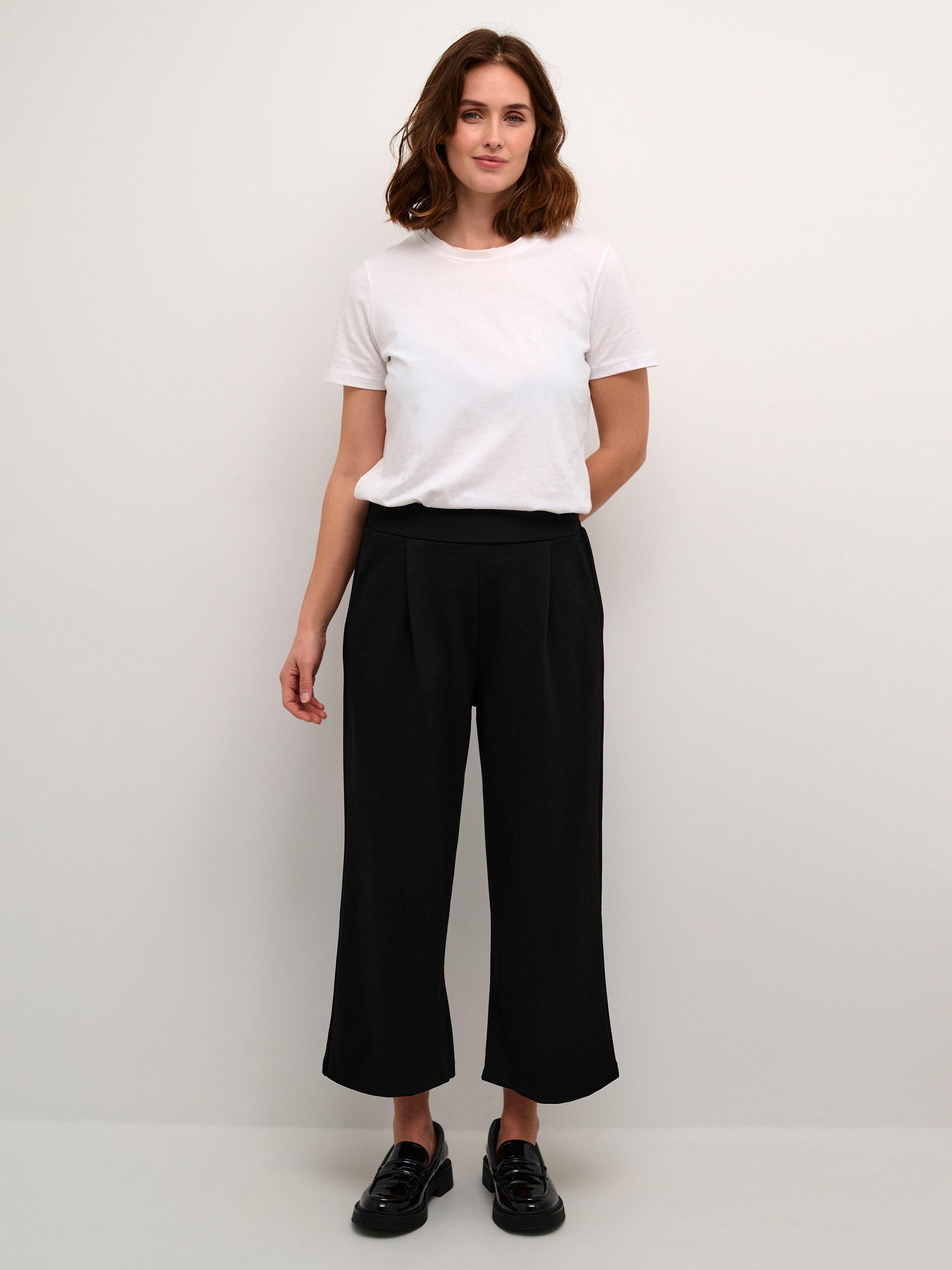 The frederikke trousers are a casual and timeless pair of trousers with lots of styling options. They have a midrise waist with an elastic waistband, and they have wide and flared legs that are cropped above the ankles. The trousers have a regular fit, and they are made with welted back pockets and seamed side pockets.
