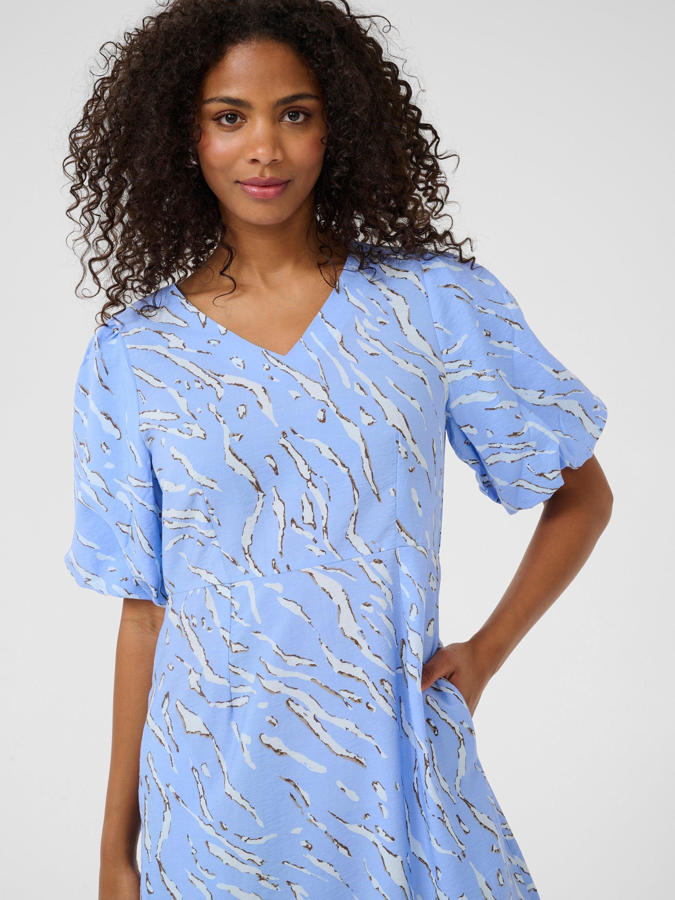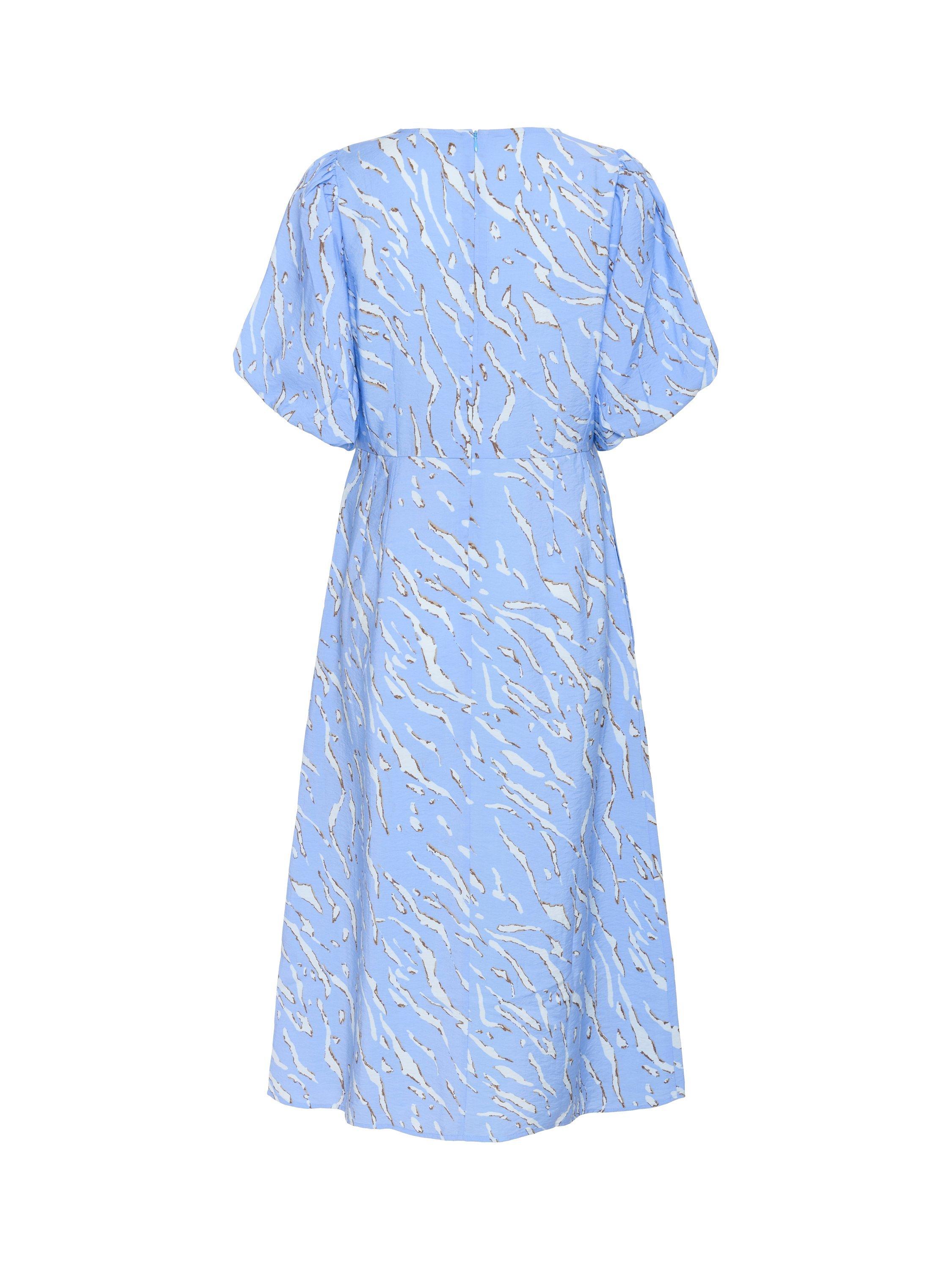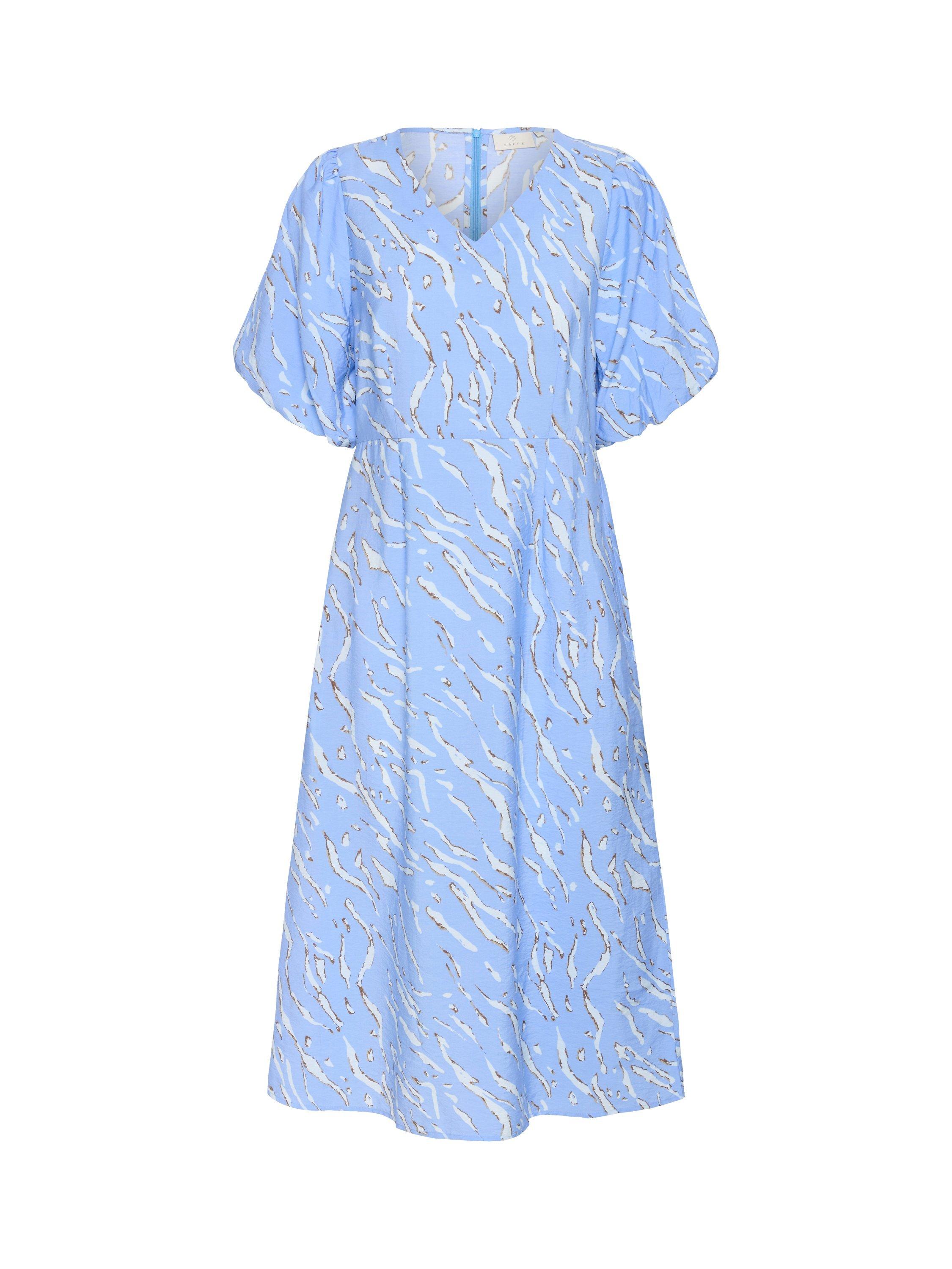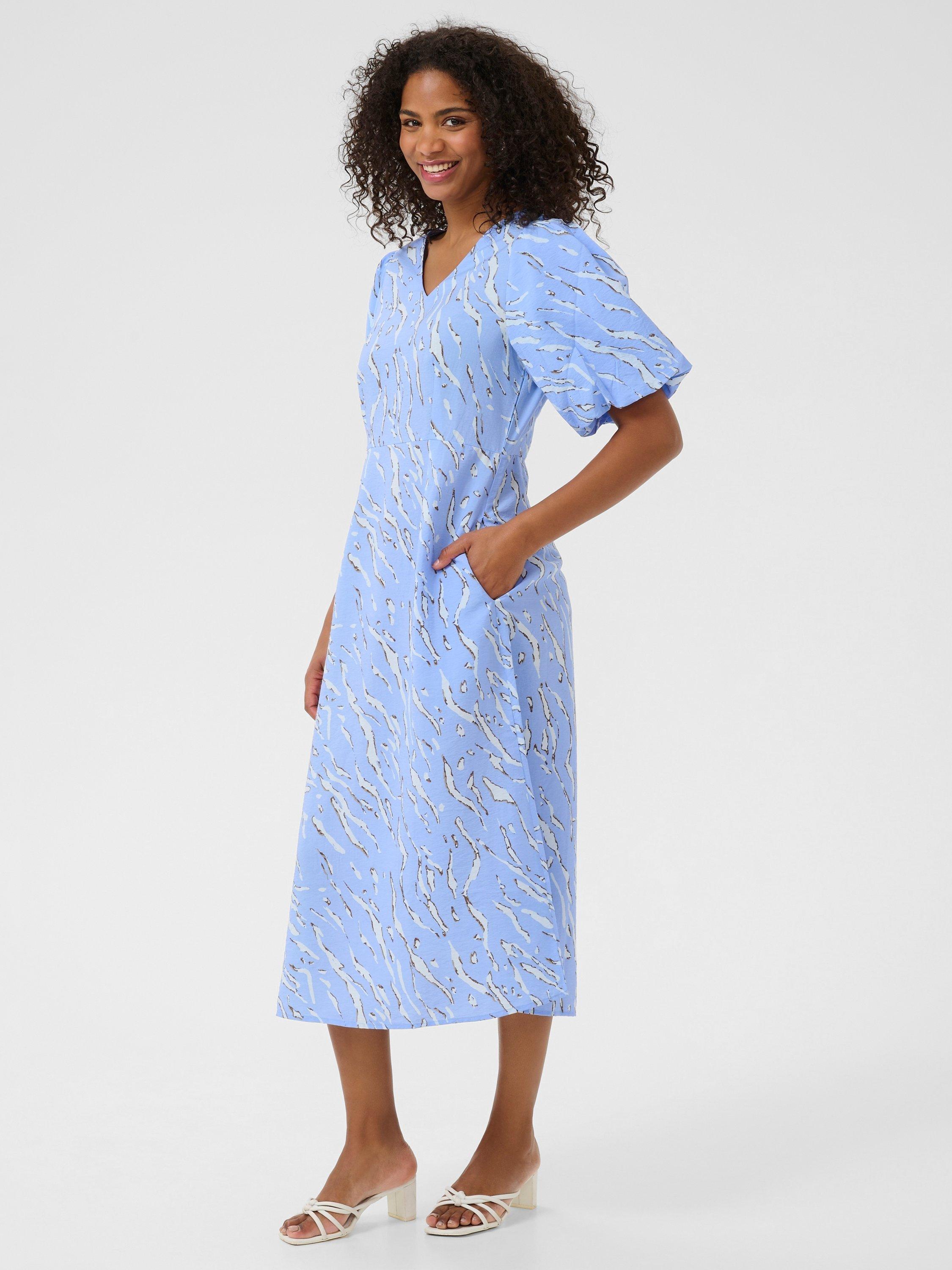 The Hannah midi dress is a flattering and versatile style in a lovely print. It has a V-neck and an invisible zipper at the back, and it has a tailored fit with a flared skirt. The sleeves are half-length balloon sleeves with elastic edges, and the dress is cut at the mid-calves.