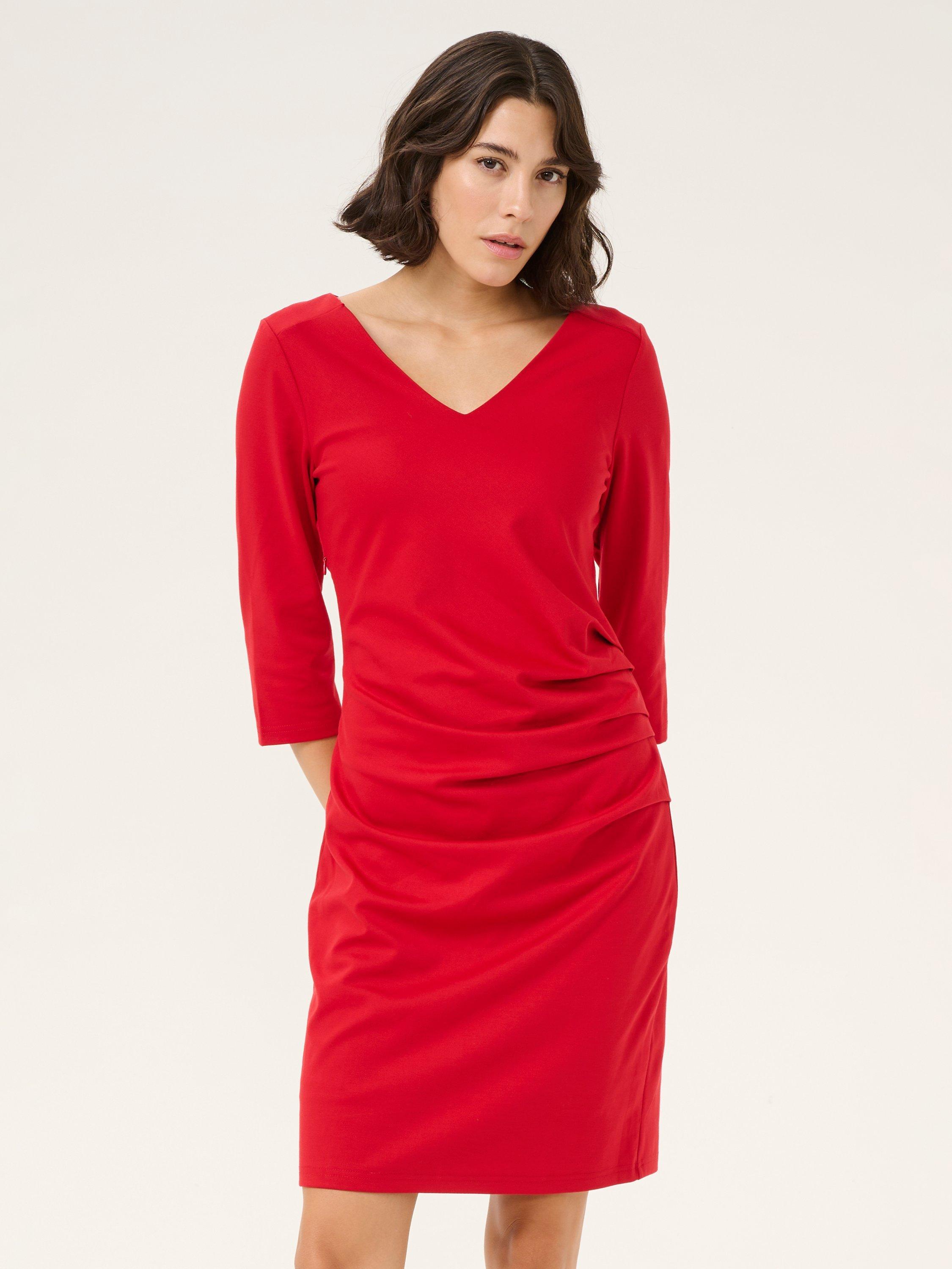 The india dress is a timeless and flattering cocktail dress, and it is a must-have in any wardrobe. It has a V-neck and a tailored fit with ruchings down the front and princess seams at the back. The sleeves are 3/4 length with a slim fit, and the dress is cut at the mid-thigh.
