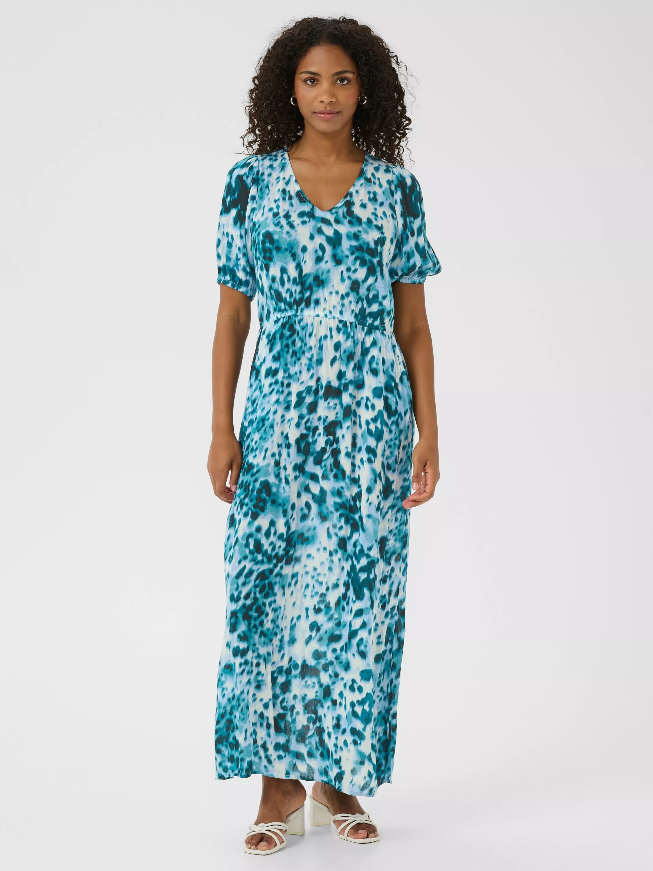 In a flattering fit that accentuates the waist, this floor-length dress from KAFFE is dreamt up from whisper-weight viscose. With a flattering v-neckline and short sleeves, this style is cloaked in a statement making teal leopard print. Perfect for any special occasion, this dress brings elegance and style to your wardrobe.