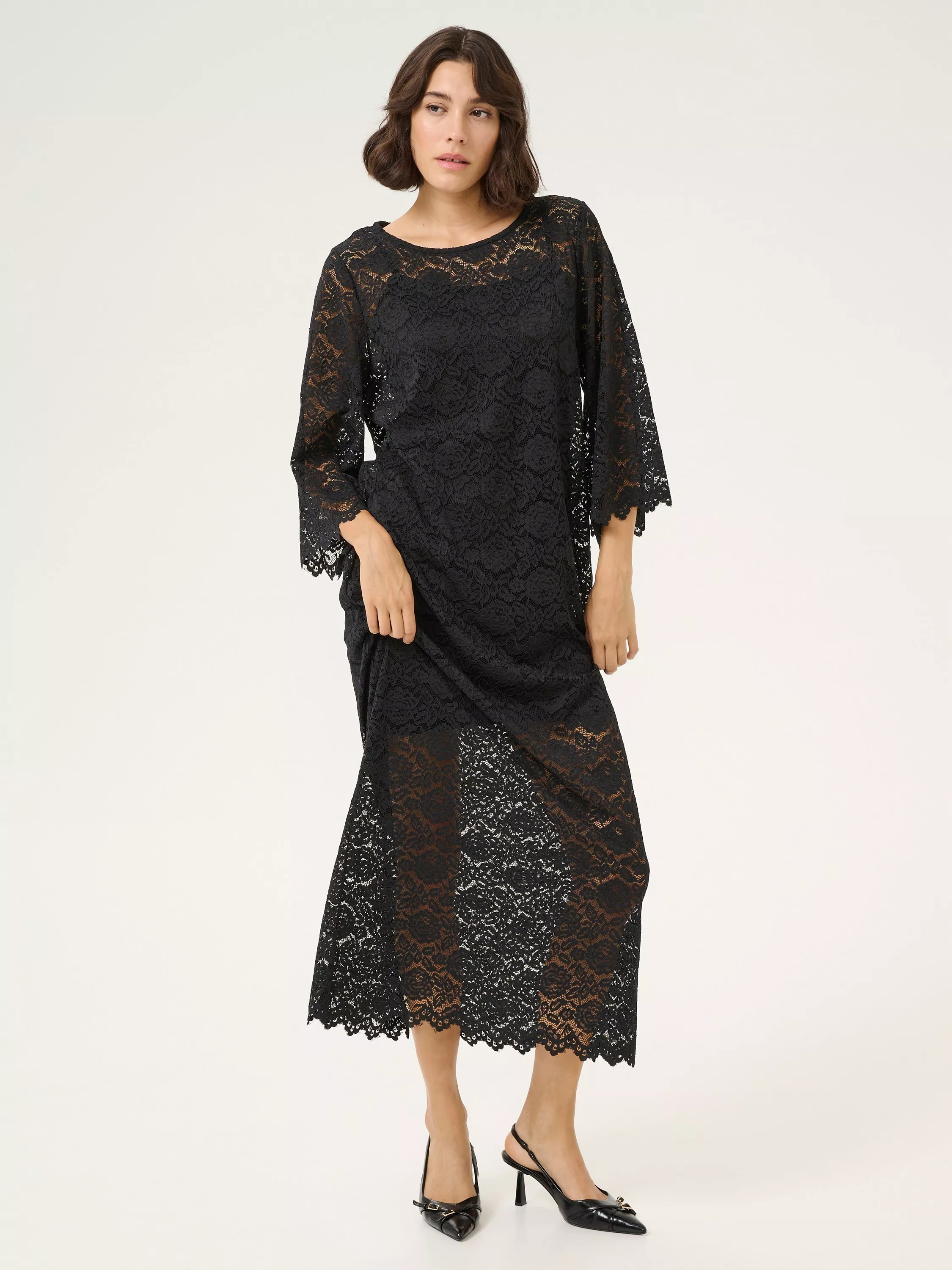 In an easy to wear A-line shape with a semi-sheer lace overlay, this floor-length dress from KAFFE is an occasionwear failsafe. Defined with a crew neck and three quarter length sleeves, accessorise minimally to let the dress truly shine.