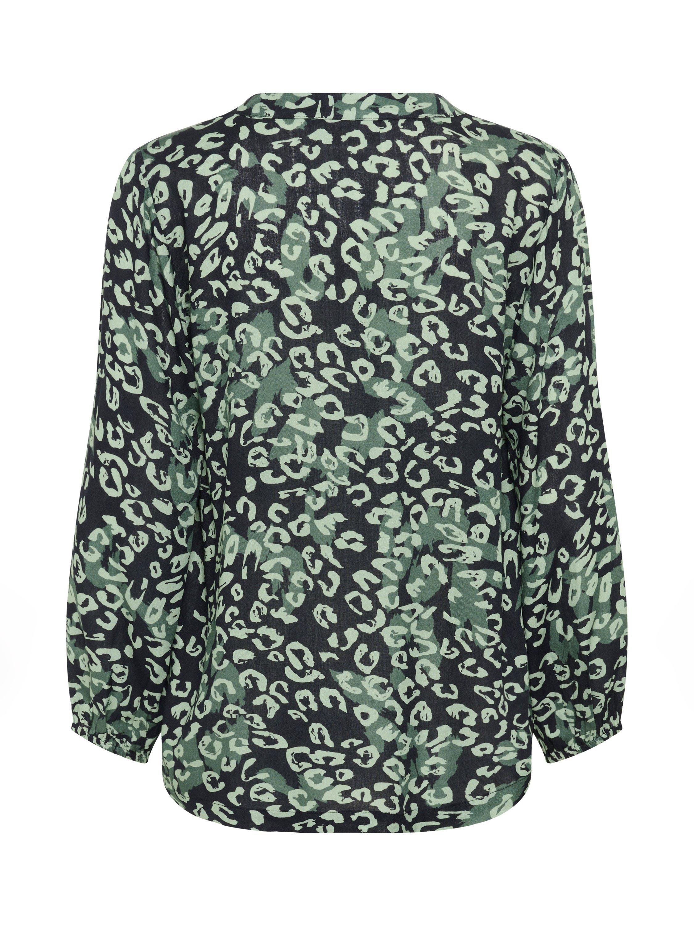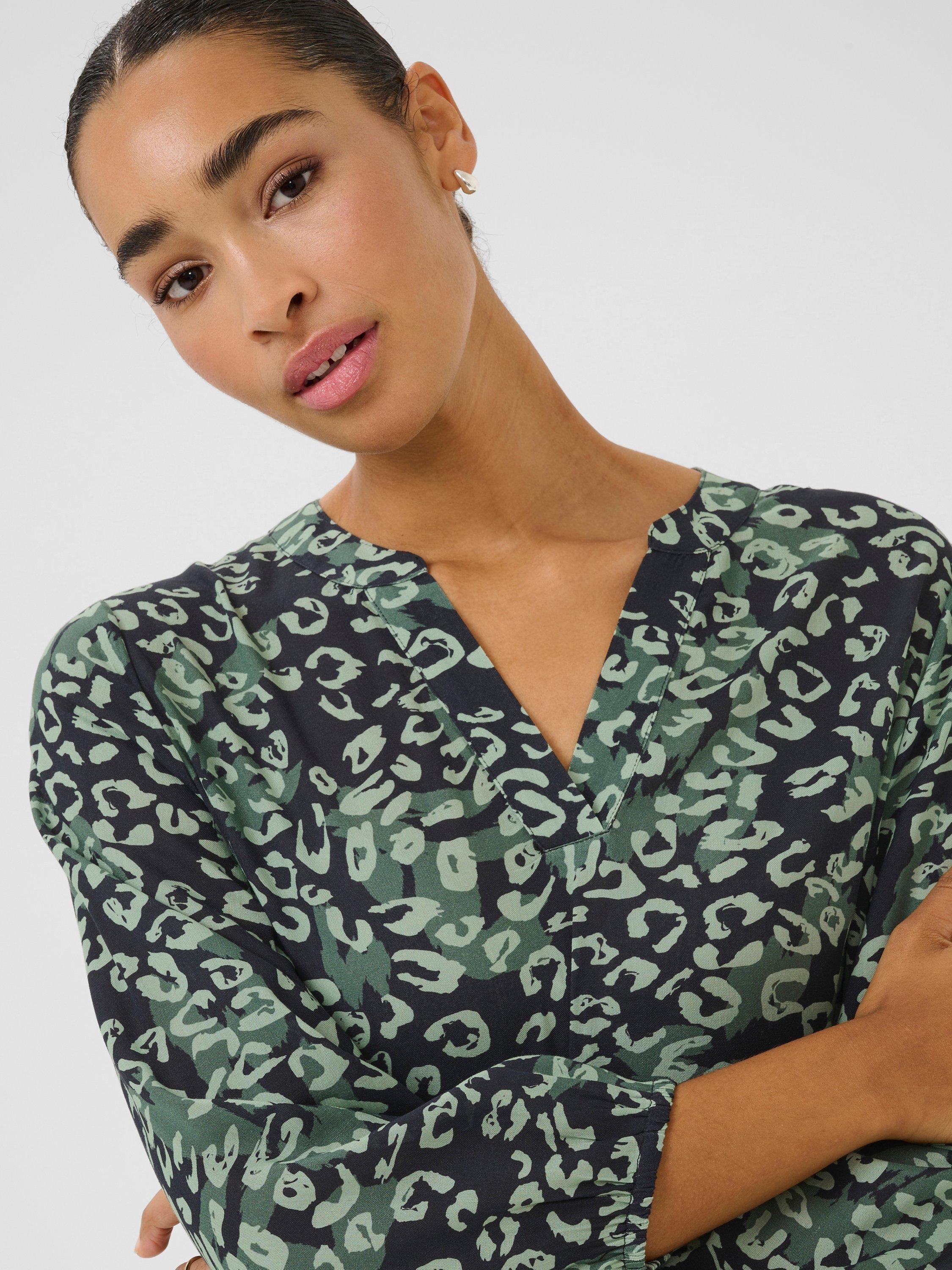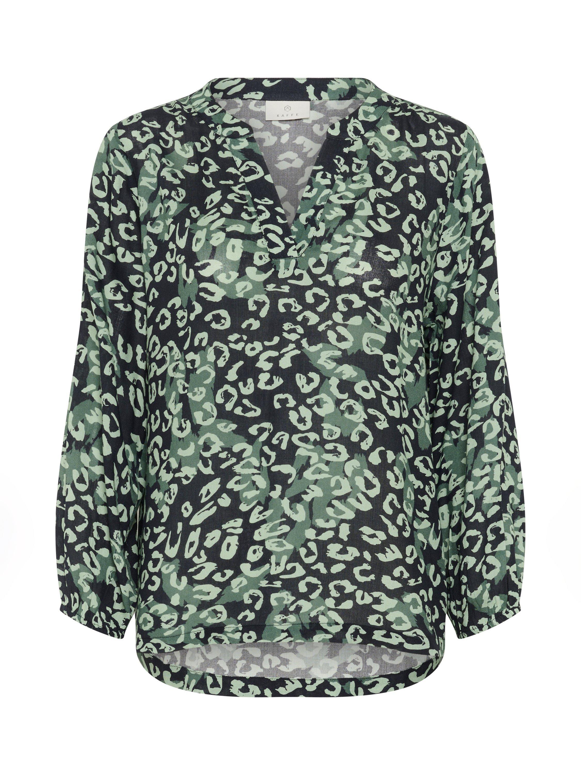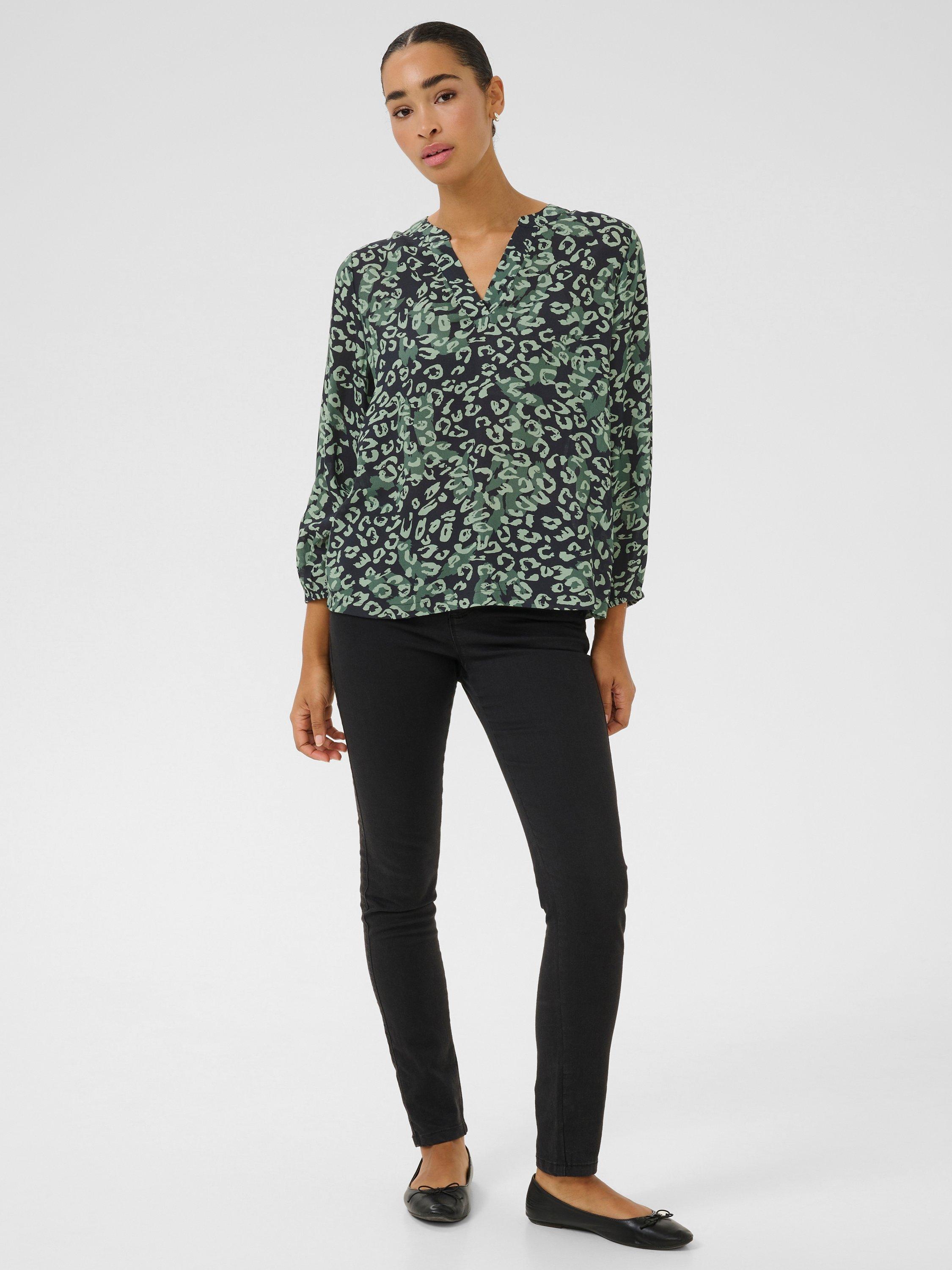 The janne blouse is a simple top that will look great with anything. It has a V-notch neck with a band collar, and it is made in a cool print. The sleeves are 3/4 length bishop sleeves with an elastic edge, and the blouse has a regular fit and is cut at the hips.