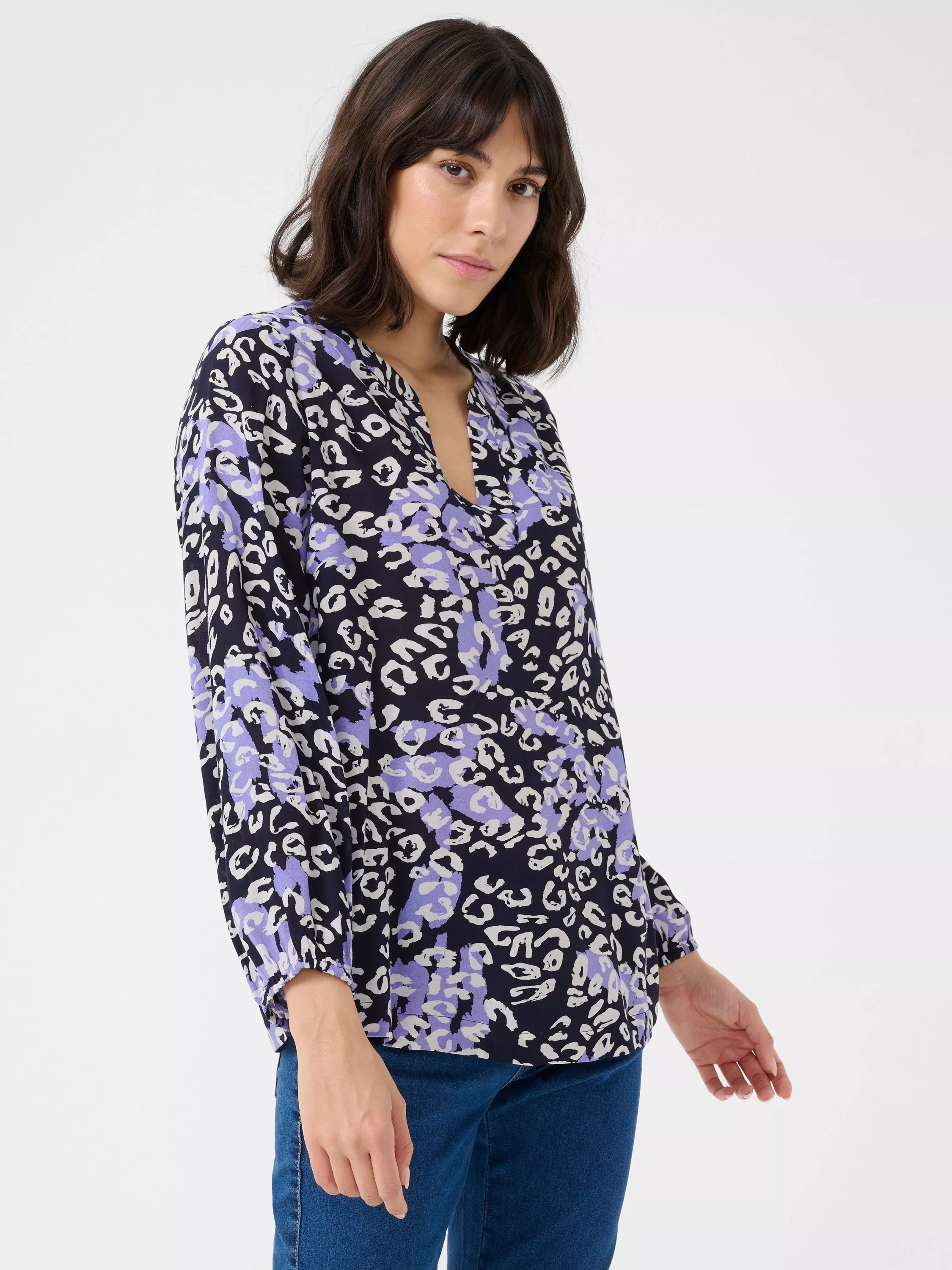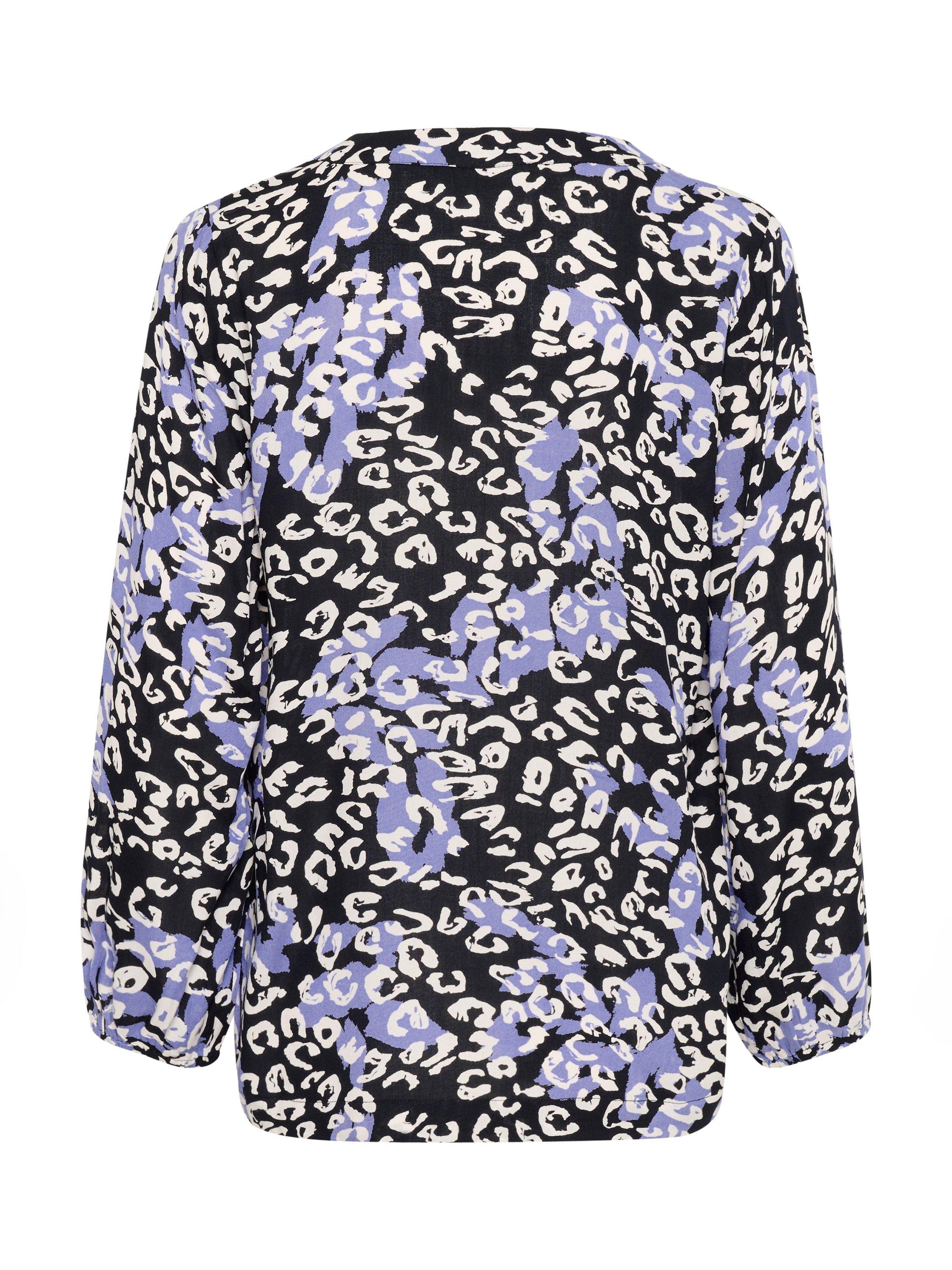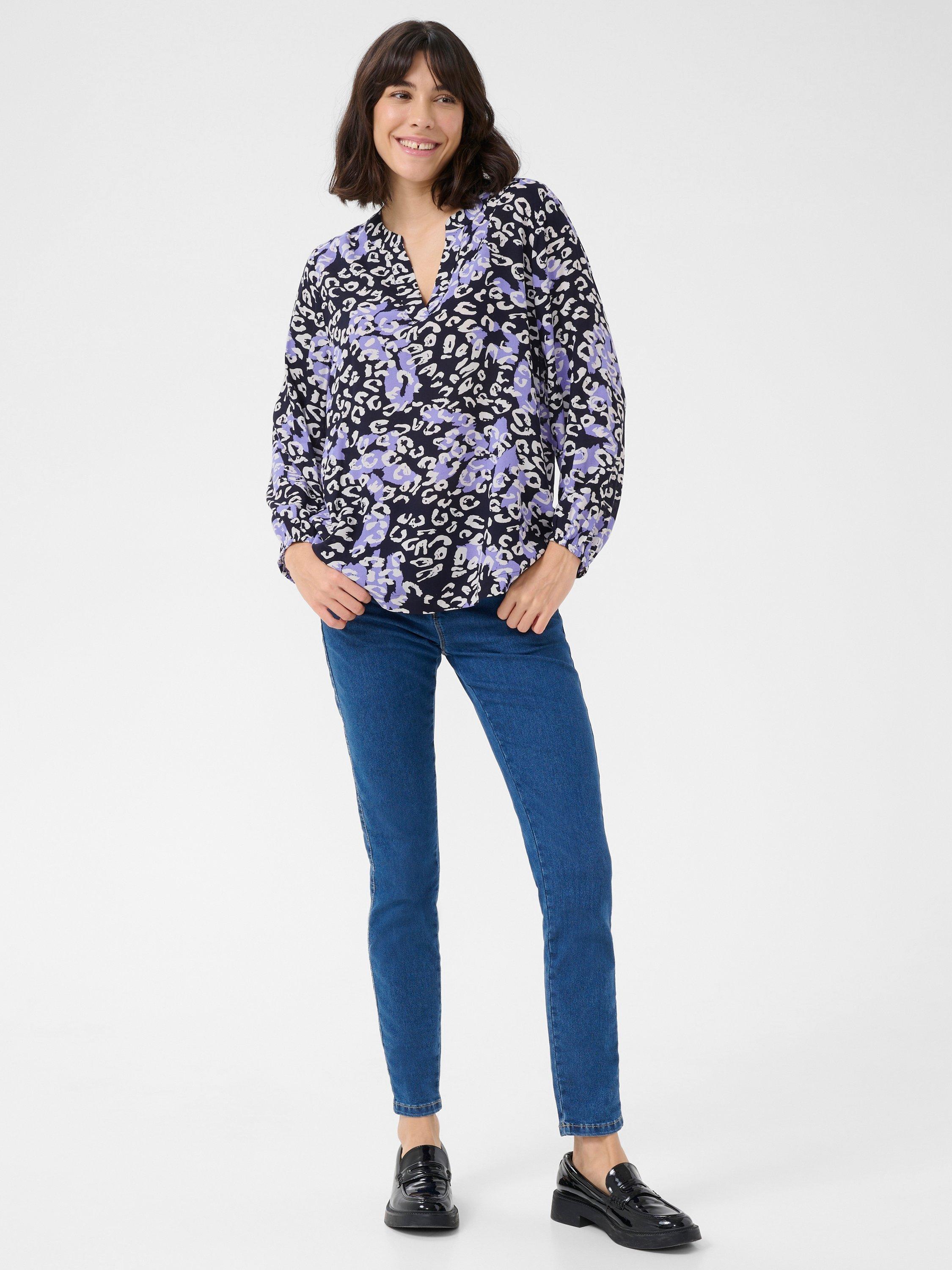 The janne blouse is a simple top that will look great with anything. It has a V-notch neck with a band collar, and it is made in a cool print. The sleeves are 3/4 length bishop sleeves with an elastic edge, and the blouse has a regular fit and is cut at the hips.