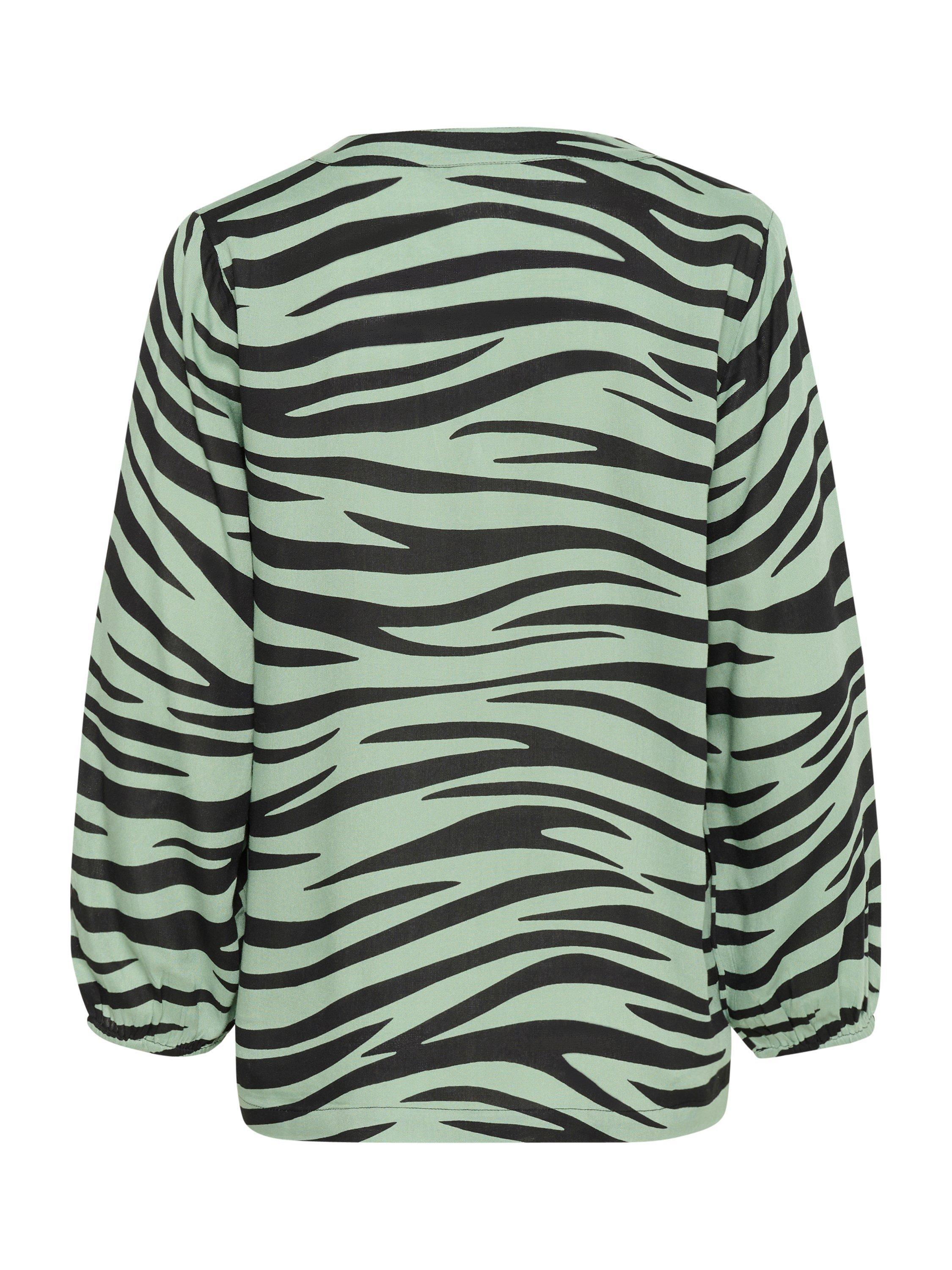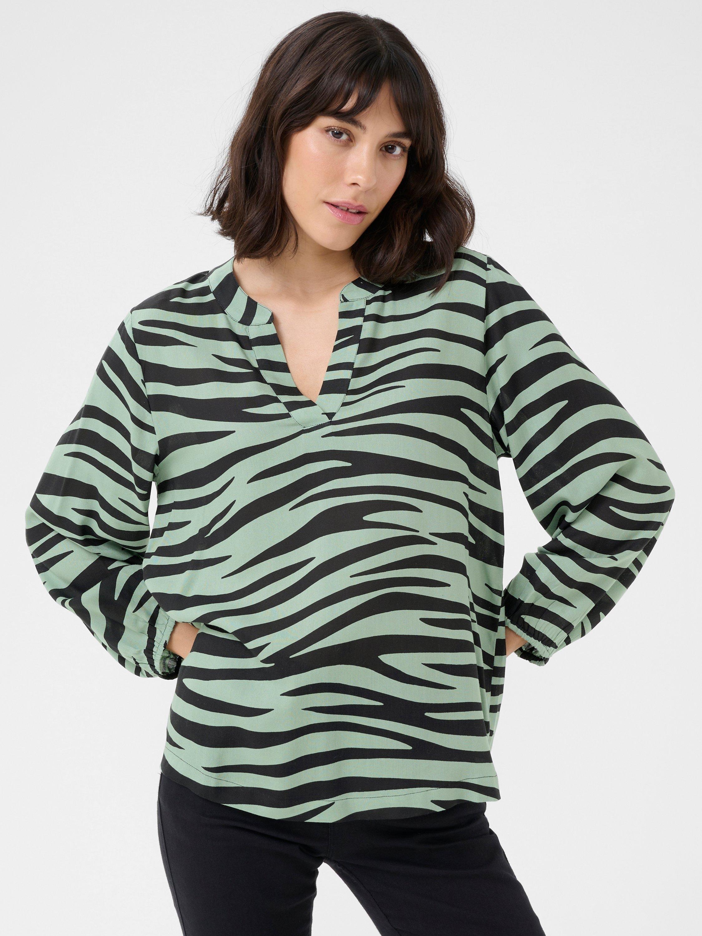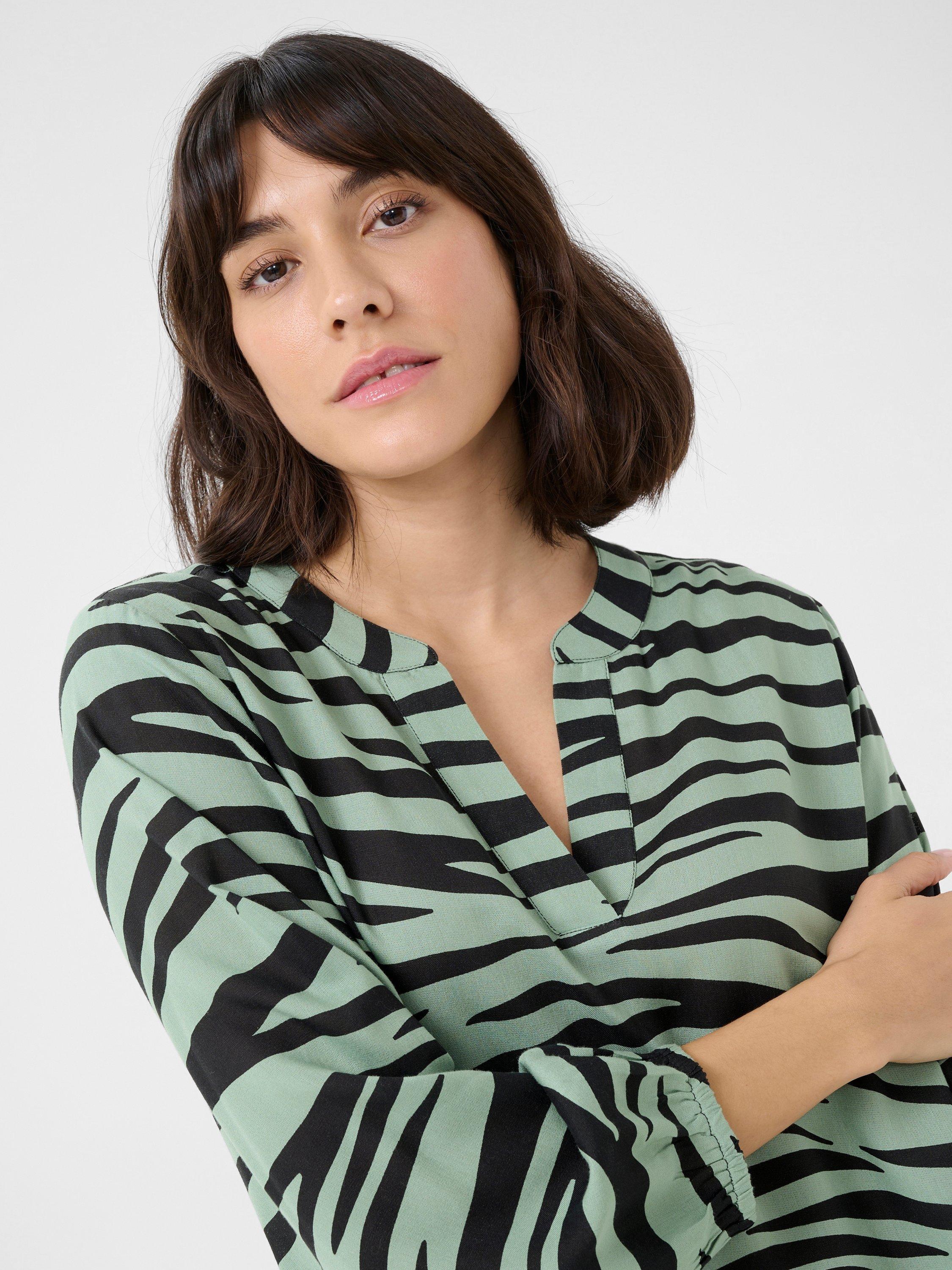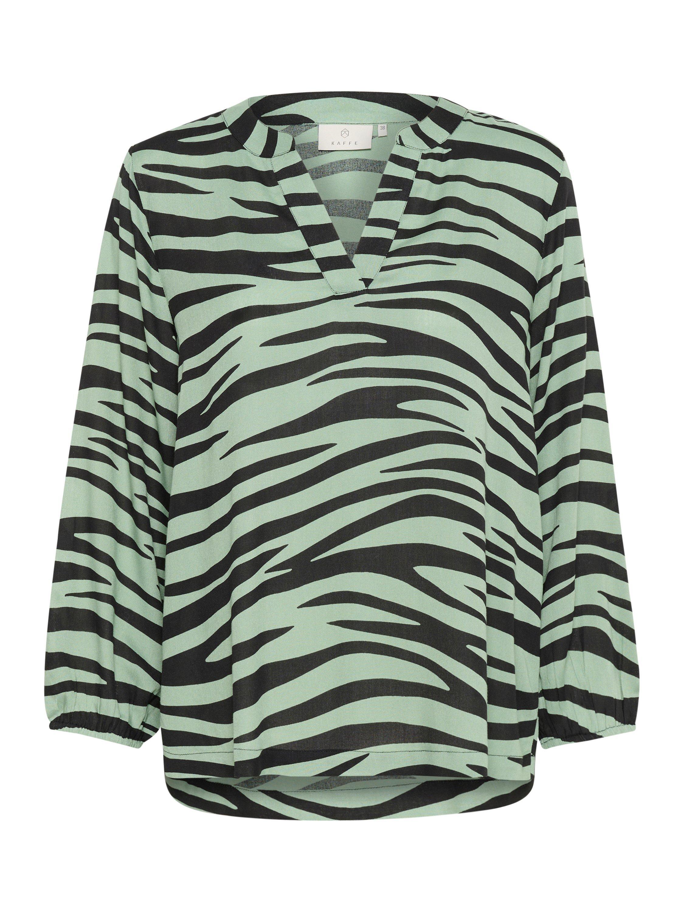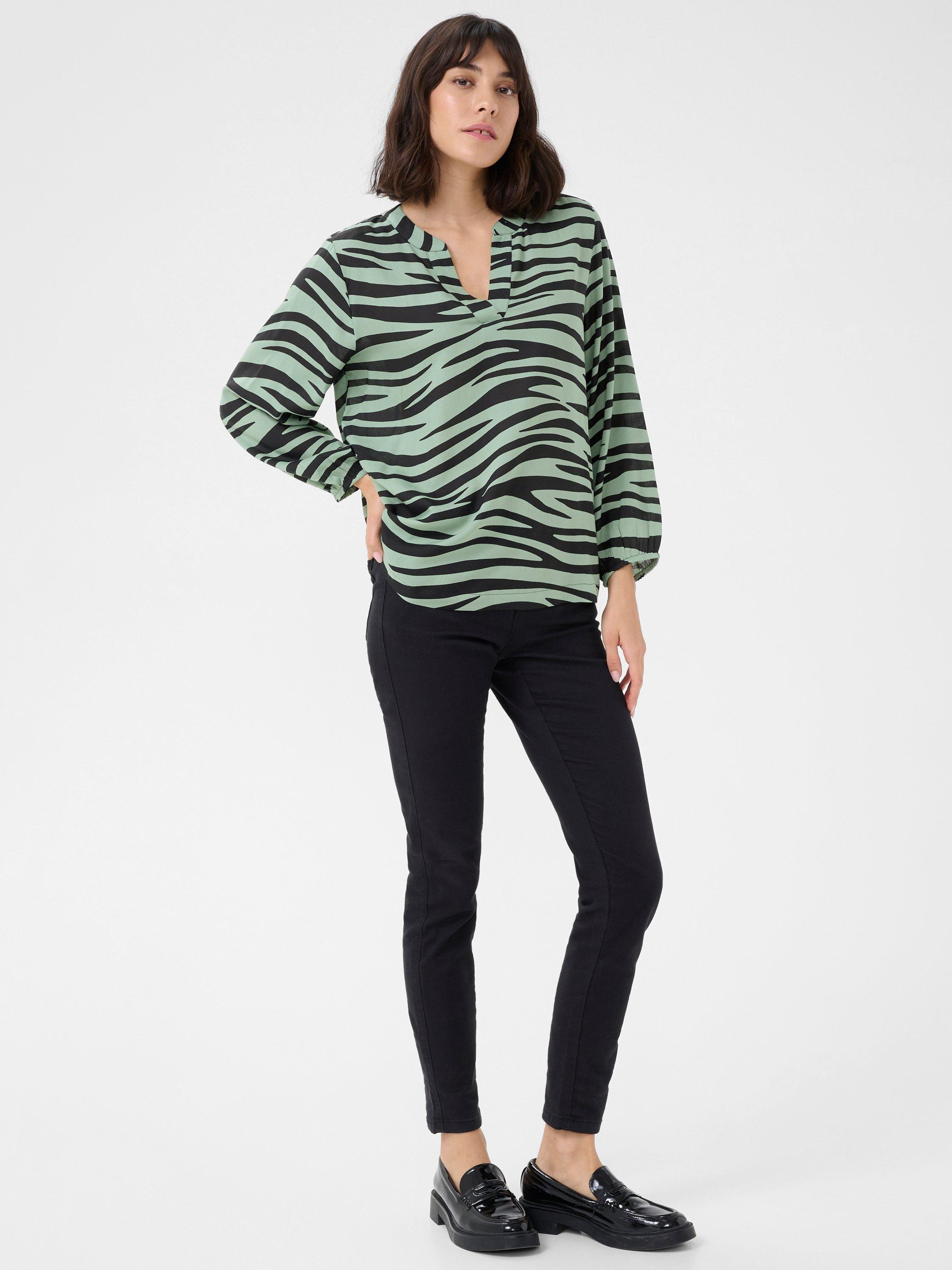The janne blouse is a simple top that will look great with anything. It has a V-notch neck with a band collar, and it is made in a cool print. The sleeves are 3/4 length bishop sleeves with an elastic edge, and the blouse has a regular fit and is cut at the hips.
