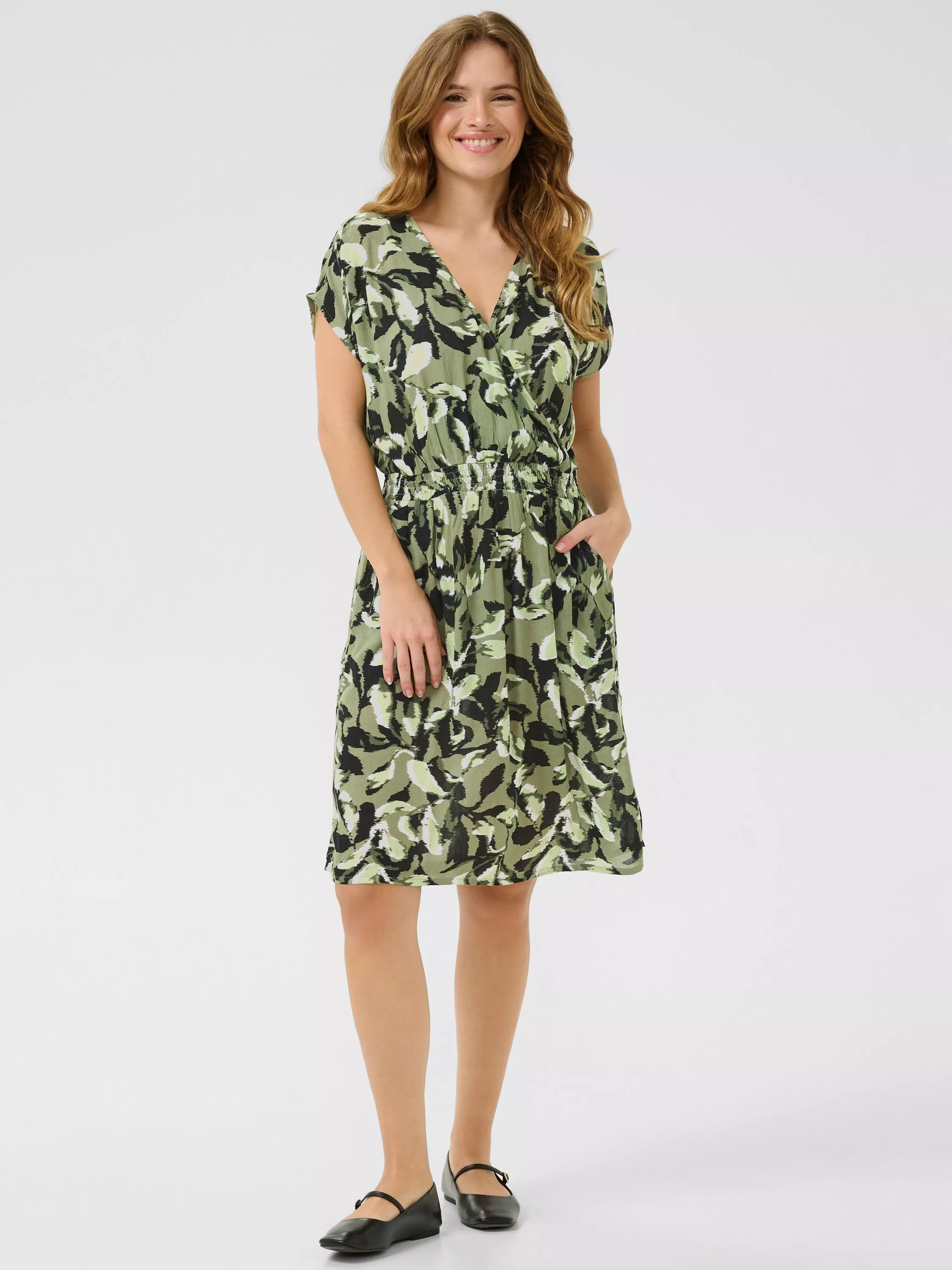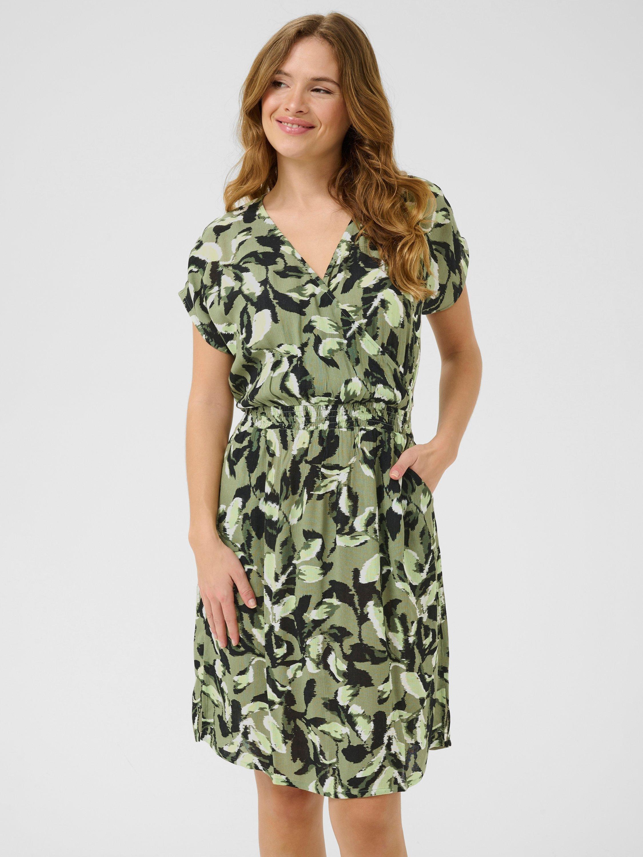 Flattering in all the right places, this knee length dress from KAFFE is made from viscose that's beloved for its weightless feel. With a universally flattering v-neckline and short sleeves, this style is printed with a leafy-inspired design.