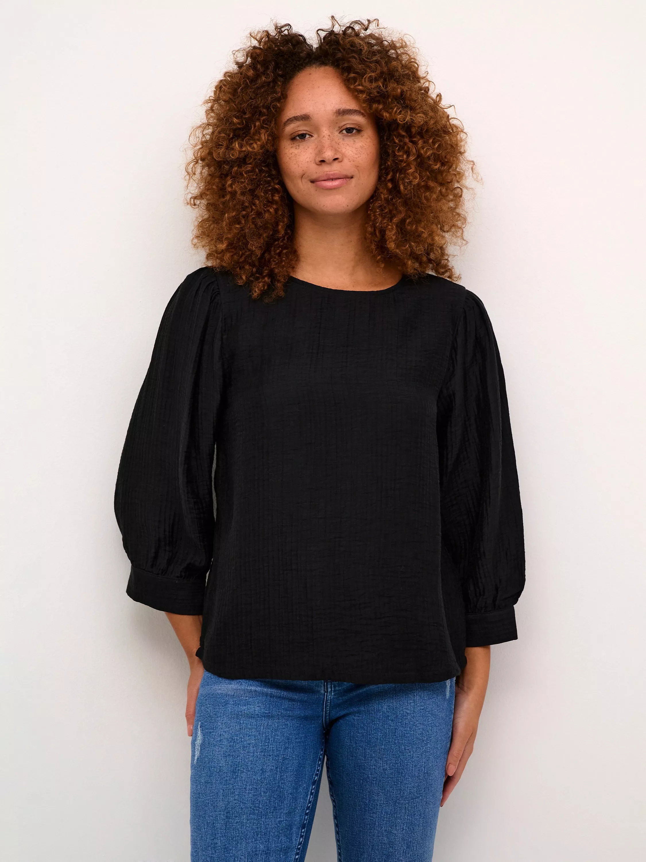 The jerome blouse is a simple and feminine everyday top, that you can wear with anything. It has a round neck with a button fastening and drop cutout at the back. The sleeves are 3/4 length with a subtle balloon shape, and they are gathered in a wide cuff. The blouse has a casual fit and is cut at the hips.