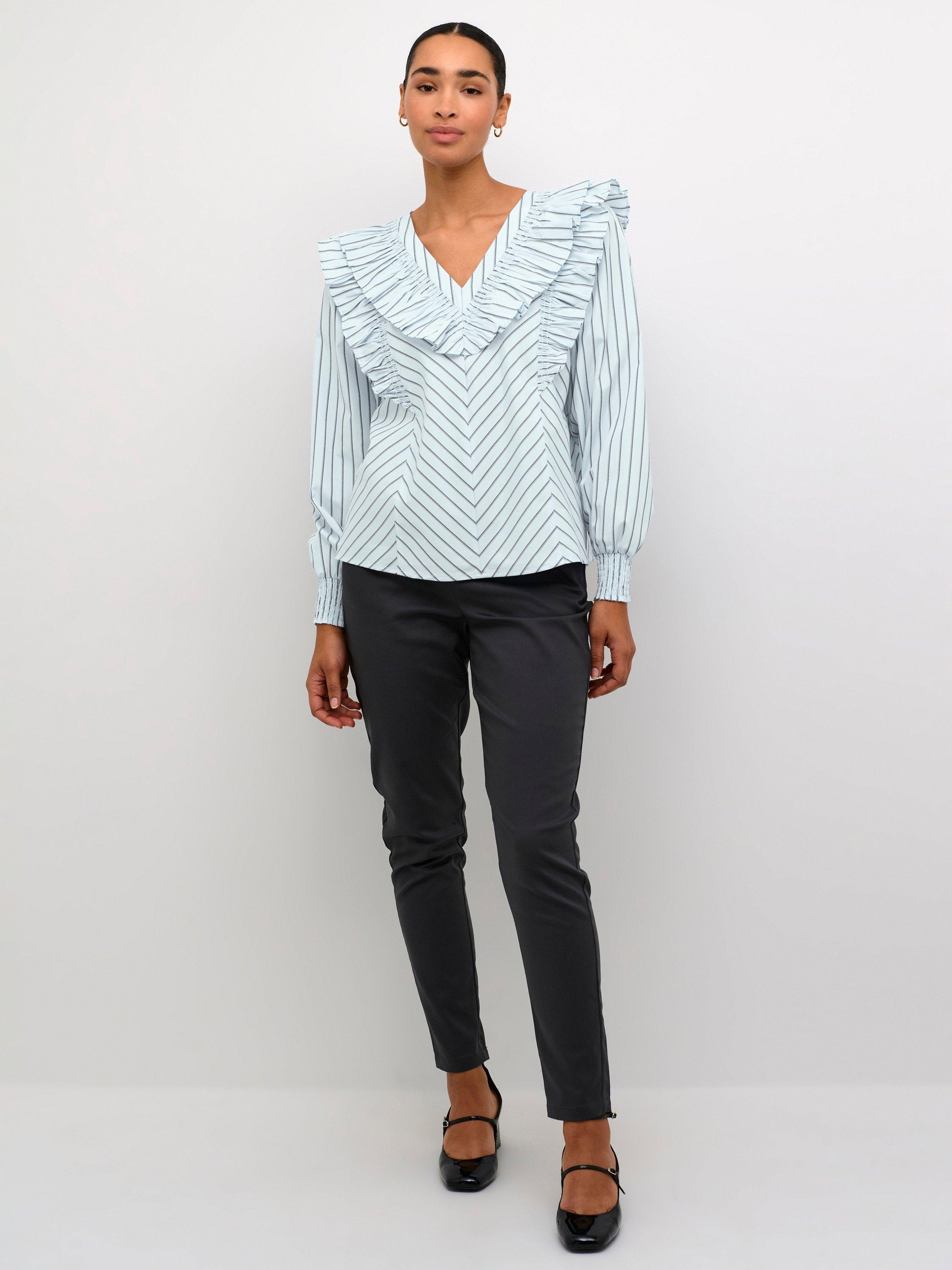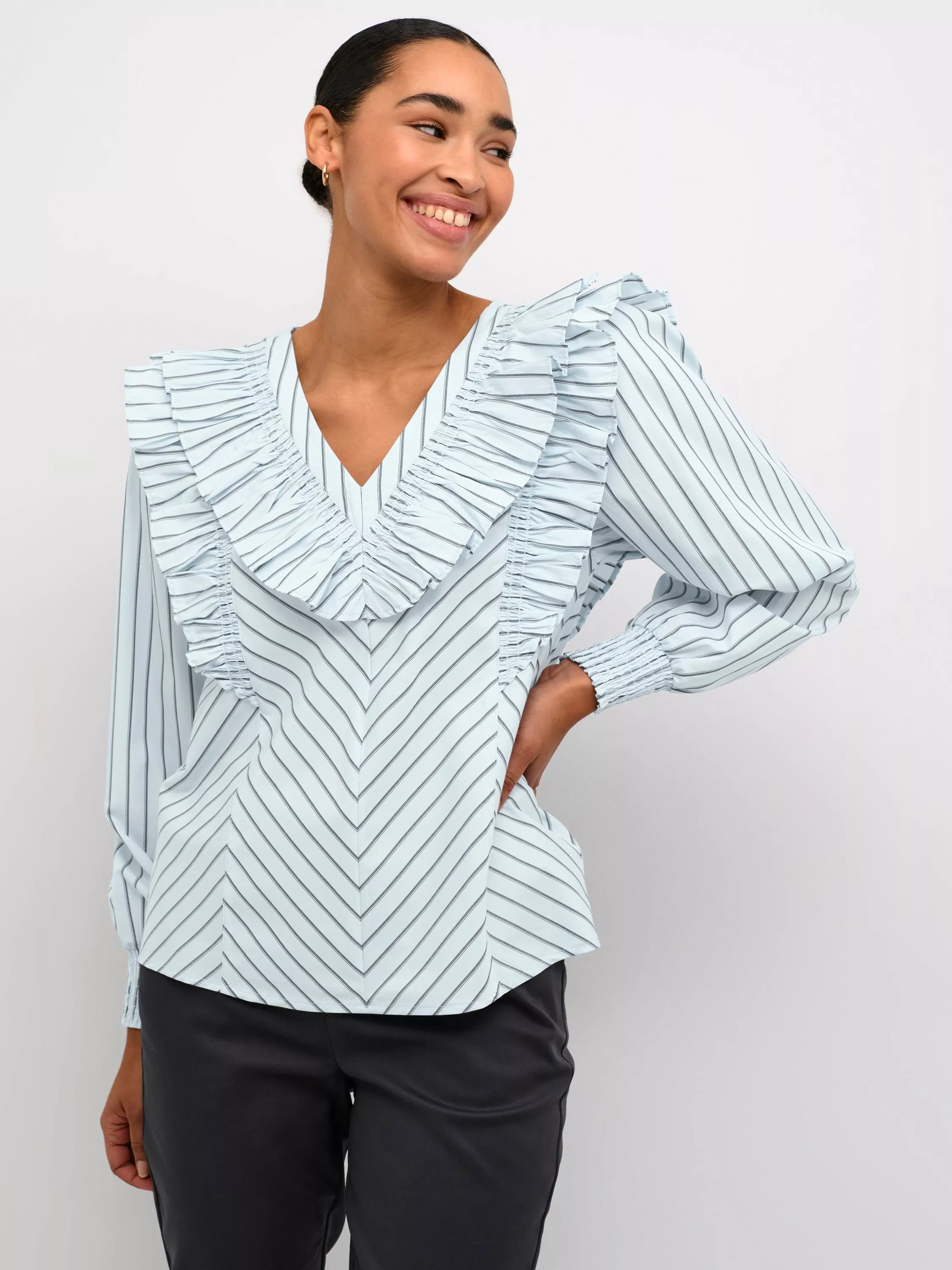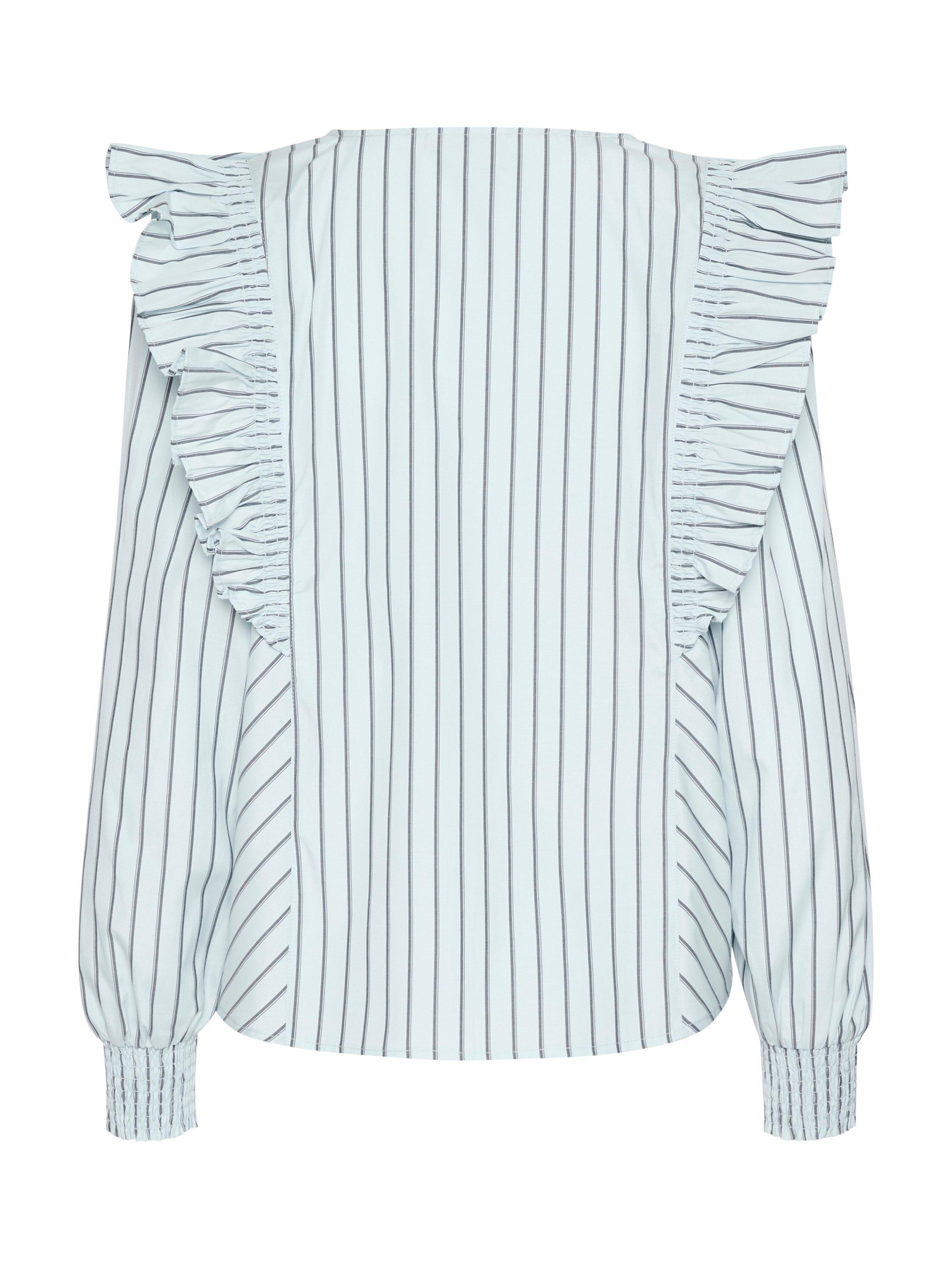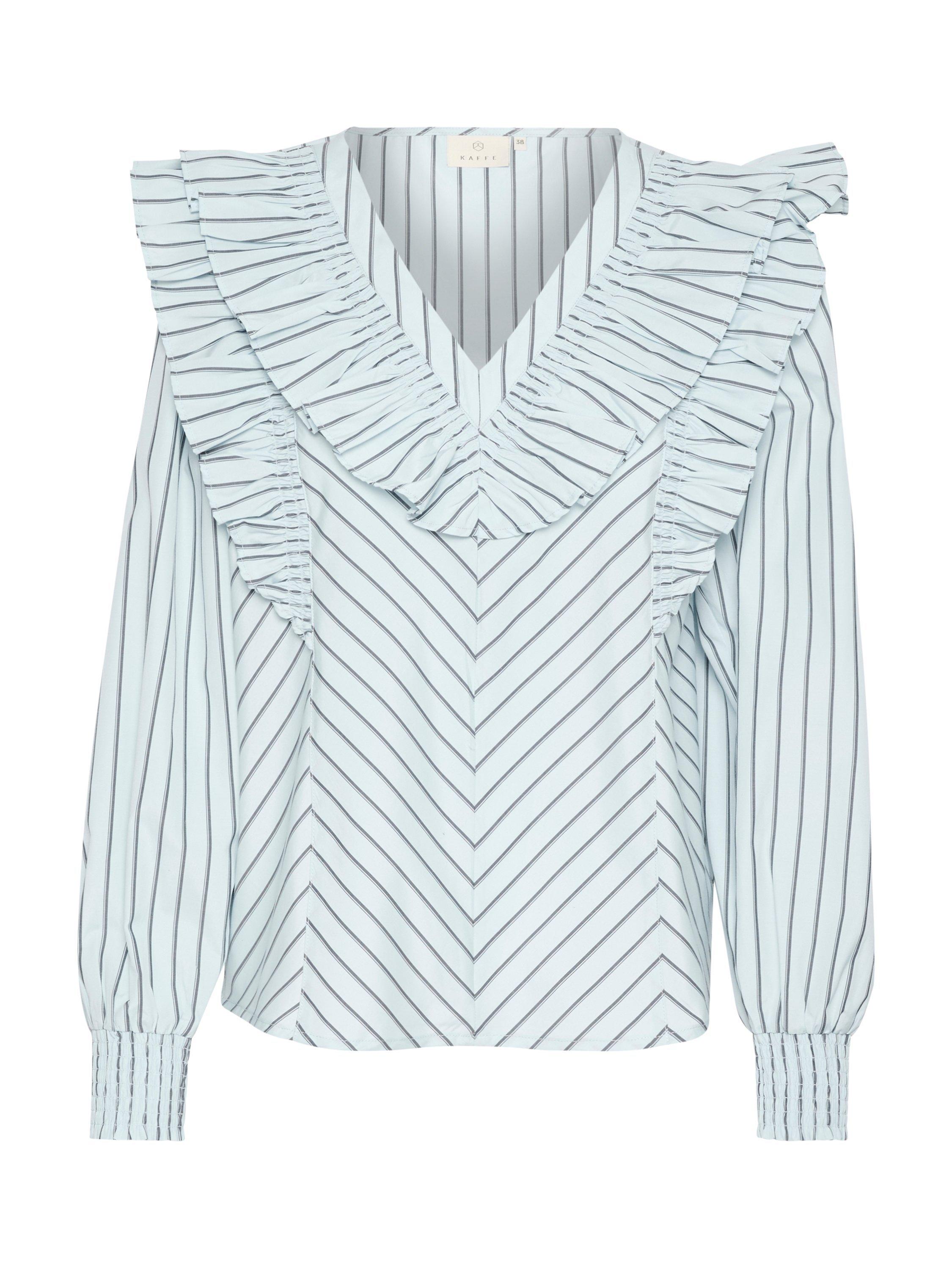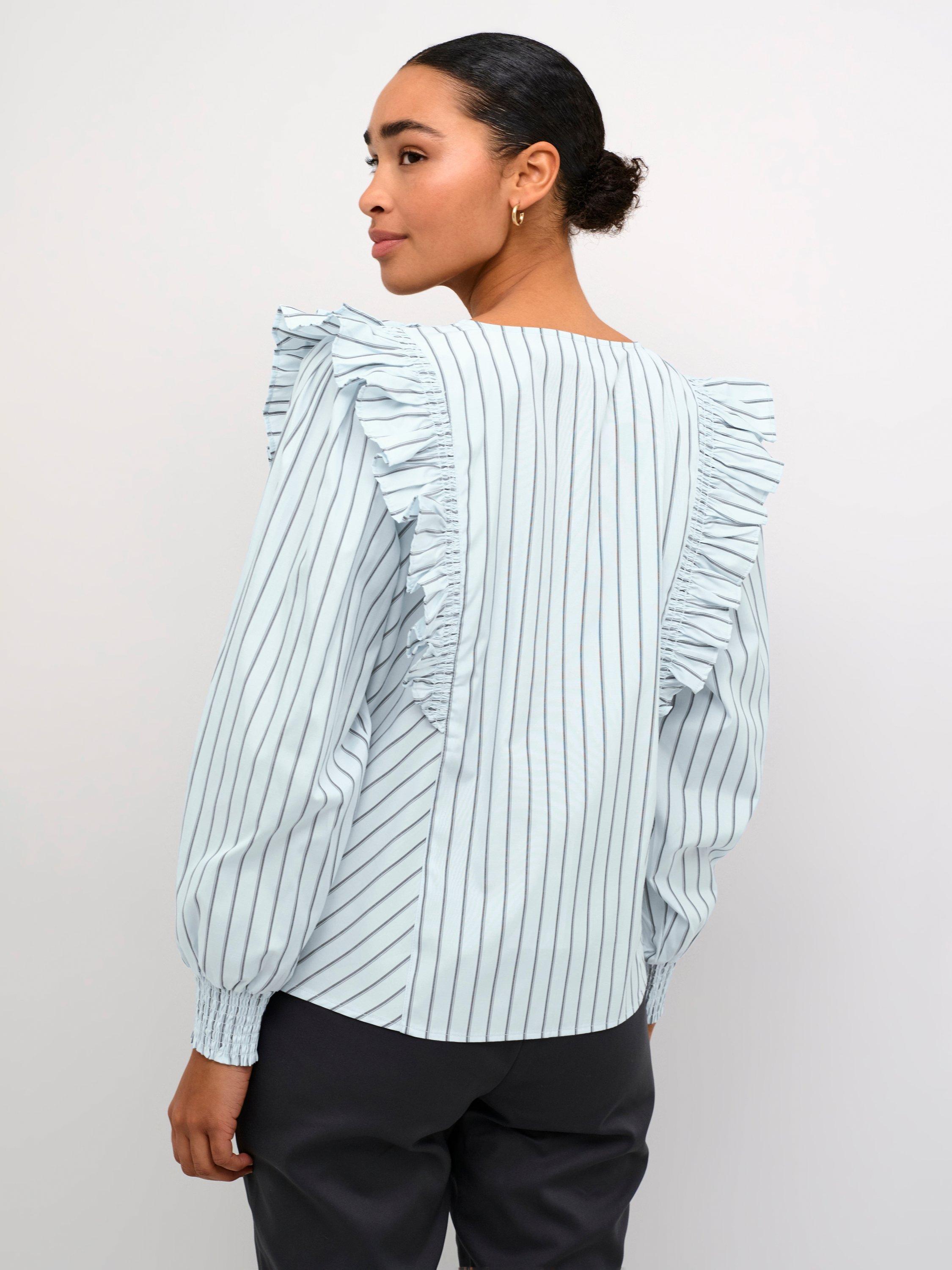 The jerrie blouse is a fun style top that you can wear again and again. It has a V-neck with frills along the edge, and it has frills running from the waist, over the shoulders and down the back. The sleeves are long and voluminous with smock cuffs, and the blouse has a regular fit.