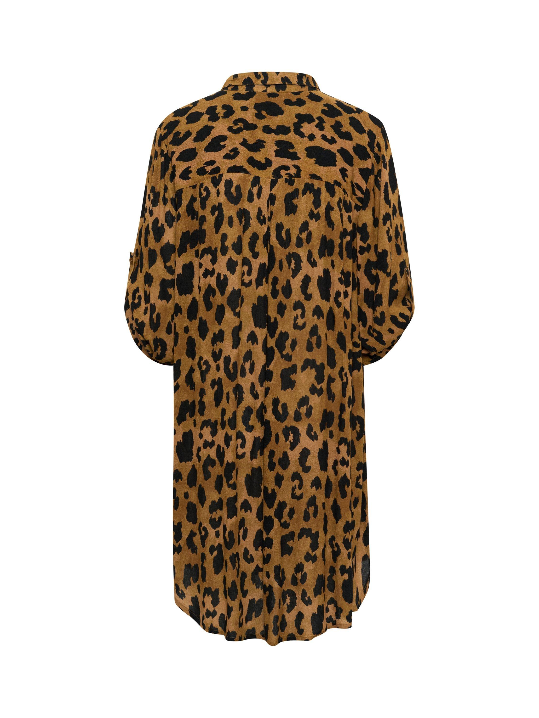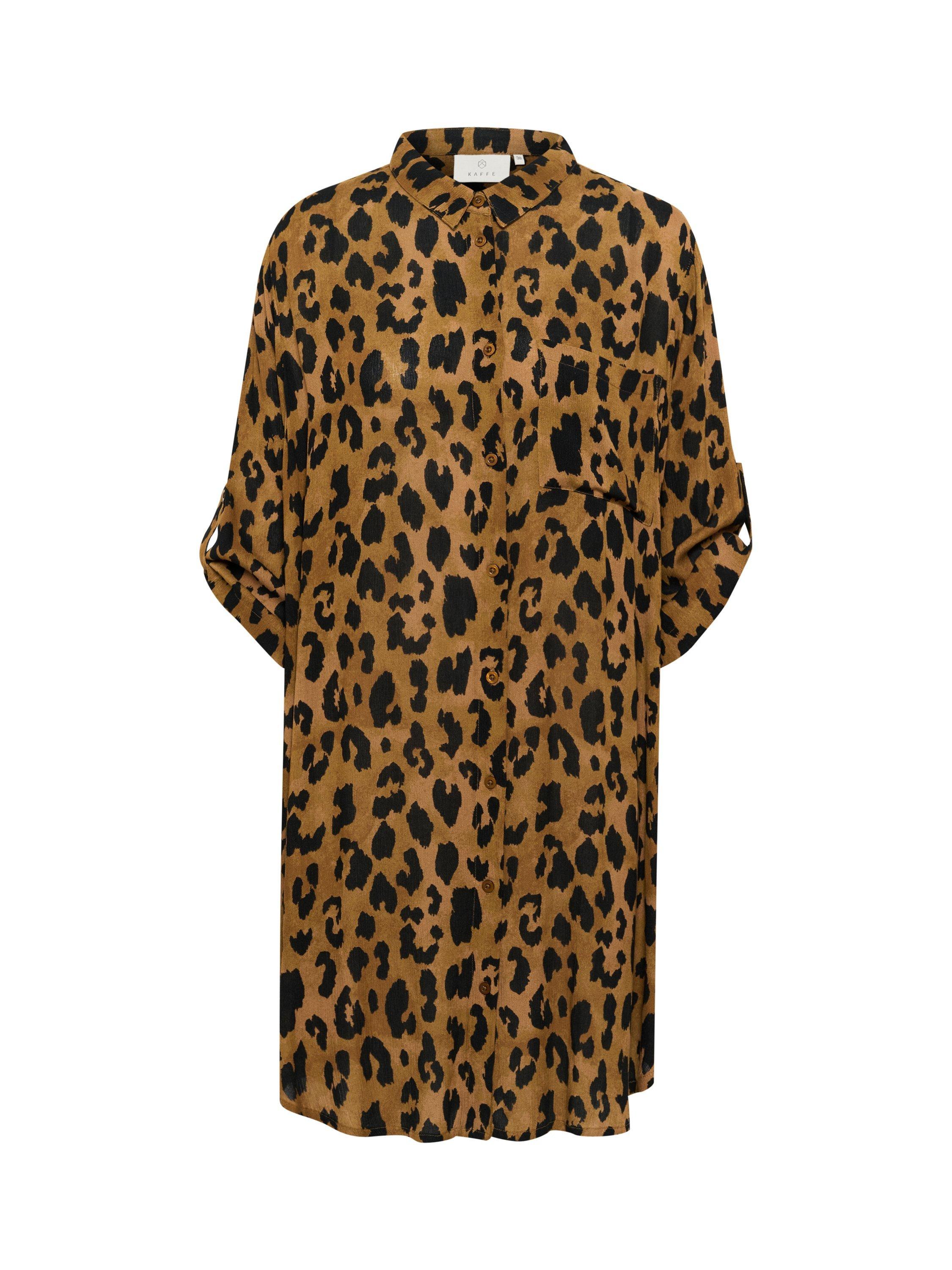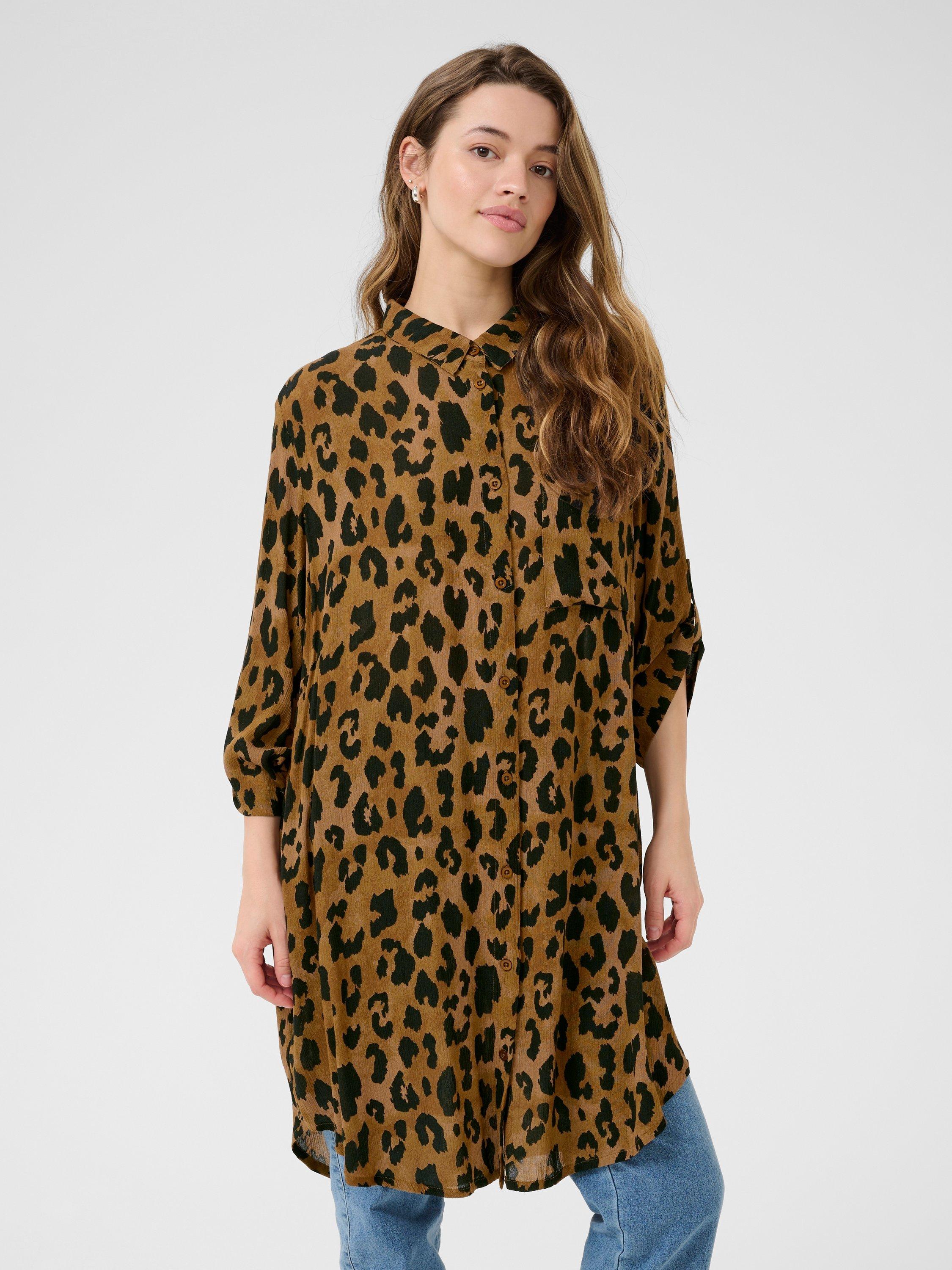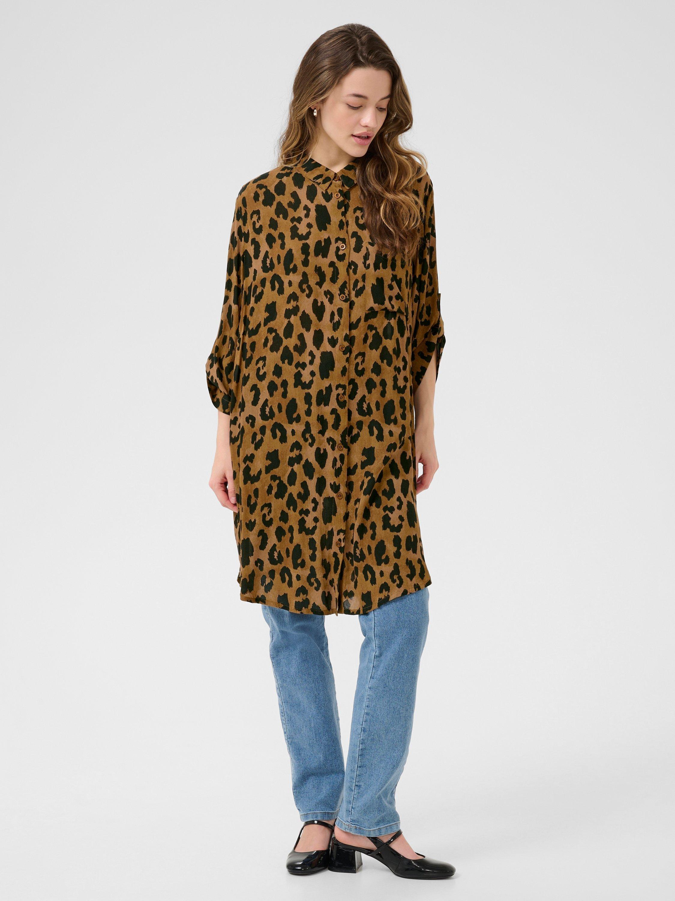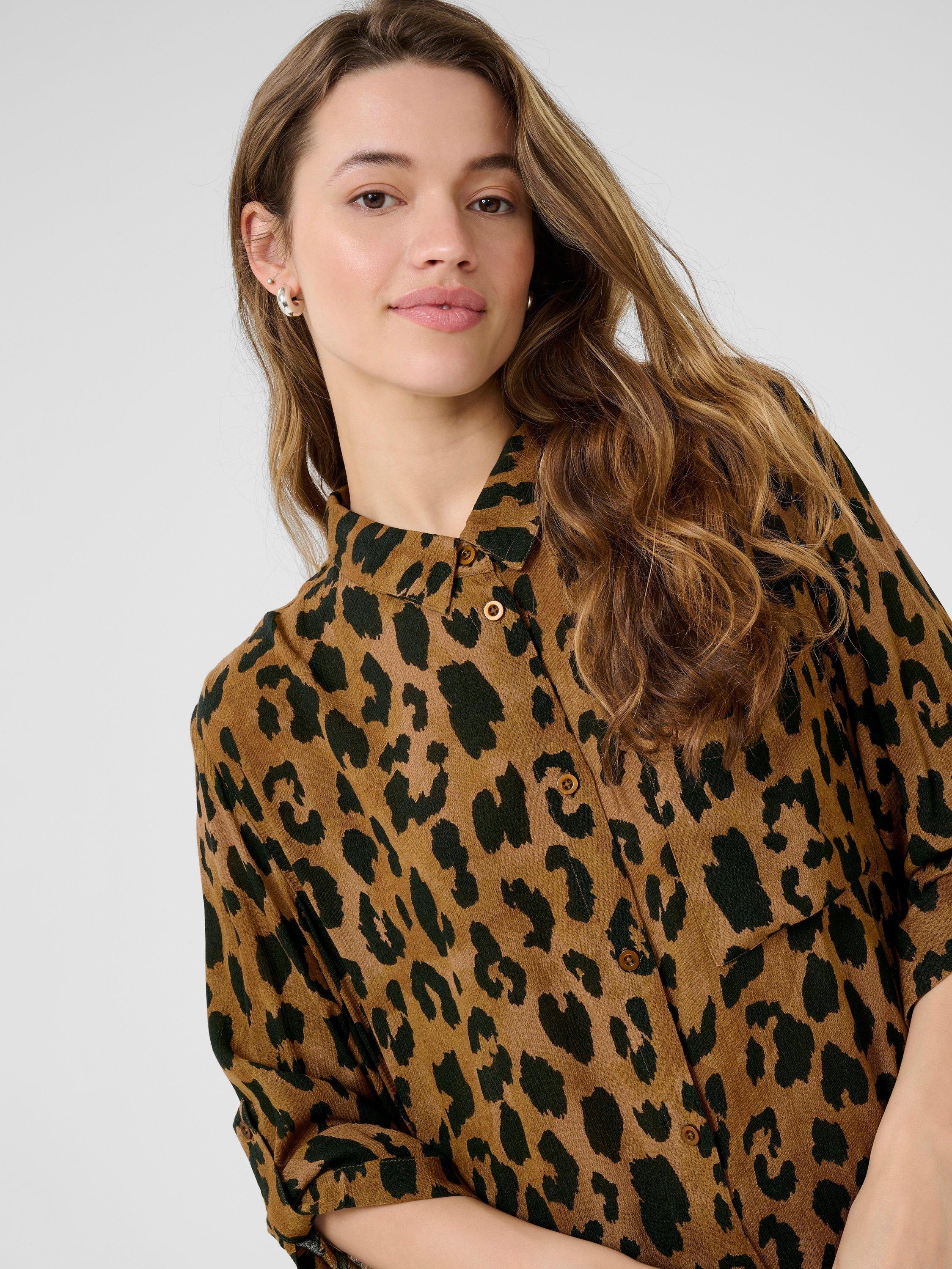 A leopard printed longline blouse by KAFFE. The soft drape, three quarter sleeves, and smart collar make it a clever pick for creative workdays or thoughtful weekends. Easy button fastening adds comfort to your routine.