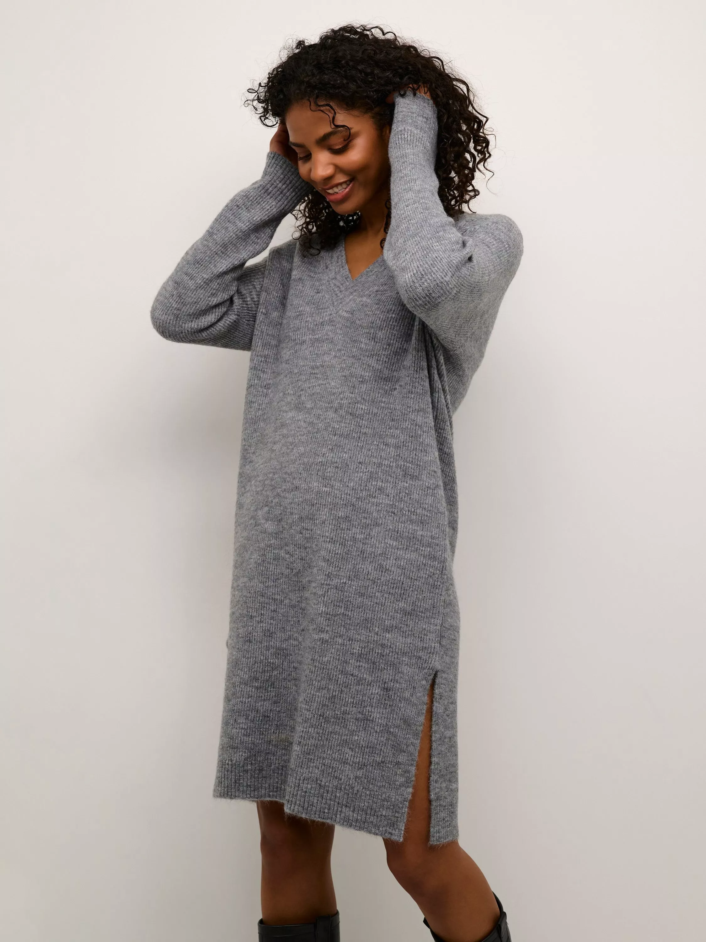 A cosy choice that delivers on comfort and style, this knee length tapered dress from KAFFE is made using a blend of fabrics. With a deep v-neckline and full-length sleeves with loose fit drop shoulders, this style is minimally detailed for endless wearability.