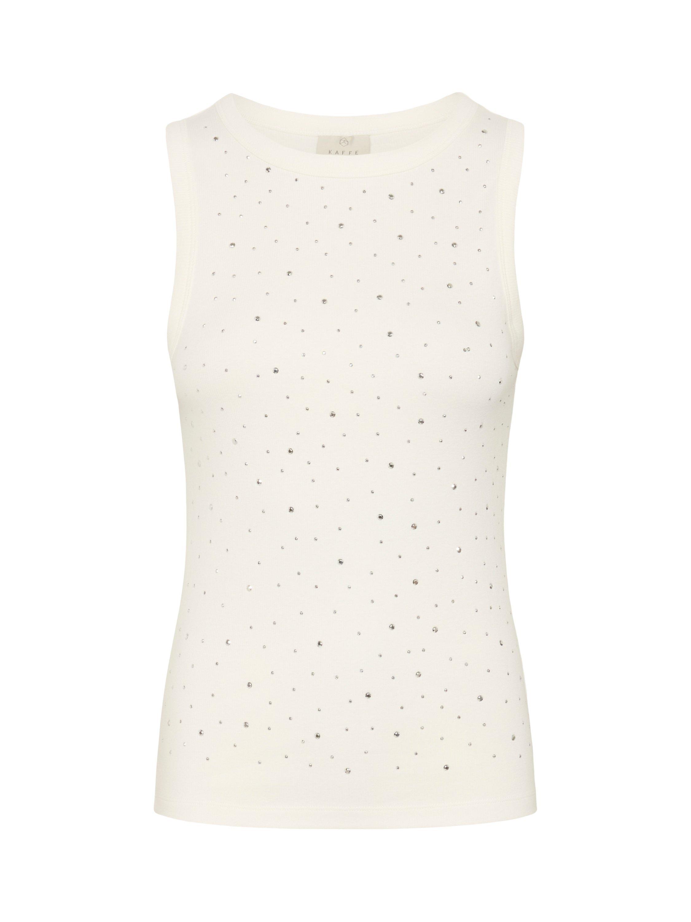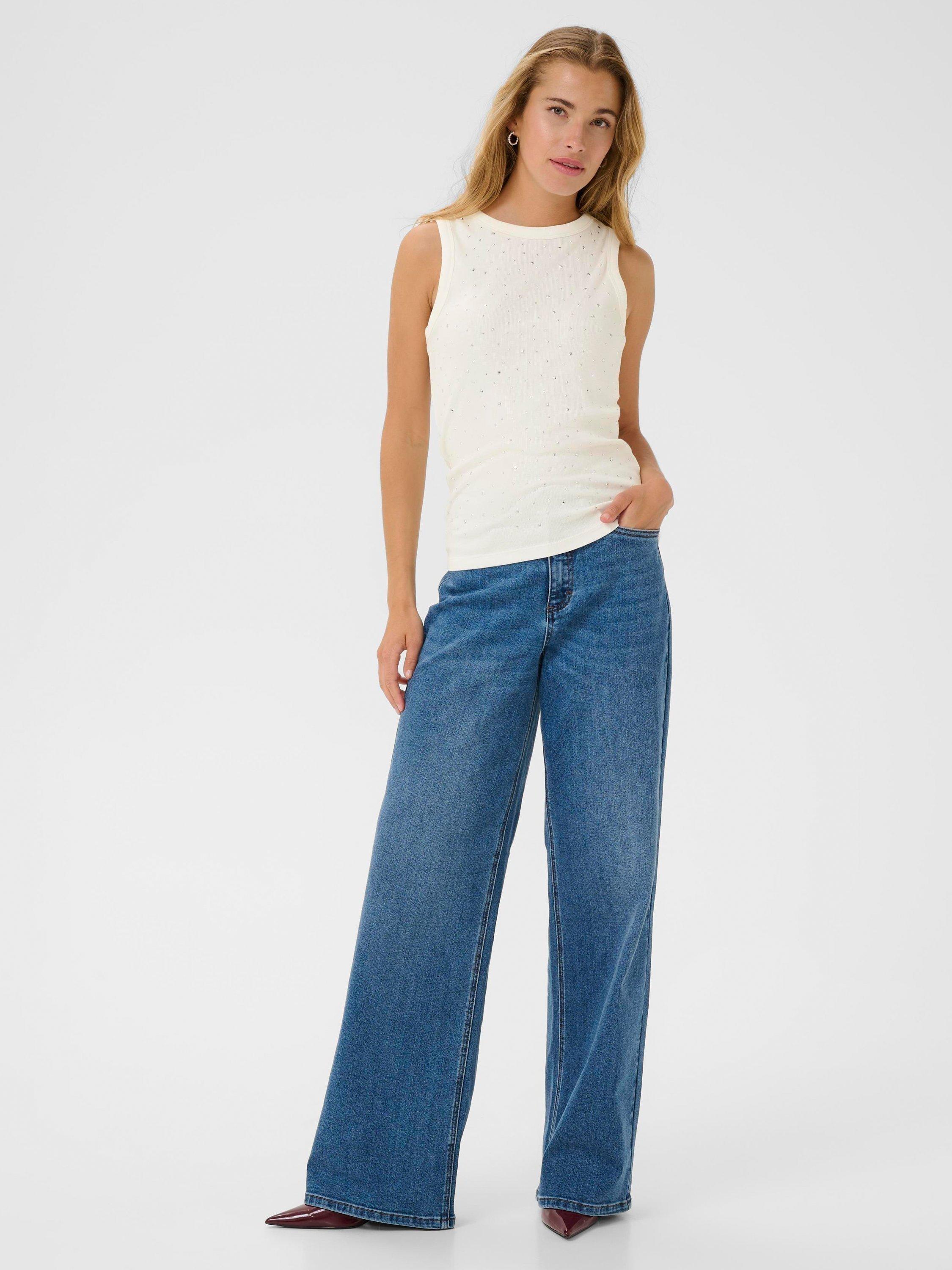 KAFFE’s sleeveless tank top brings comfort and confidence with a touch of flair. Its crew neck and soft cotton blend keep you cool, while subtle embellishments are ready to brighten any summer day.