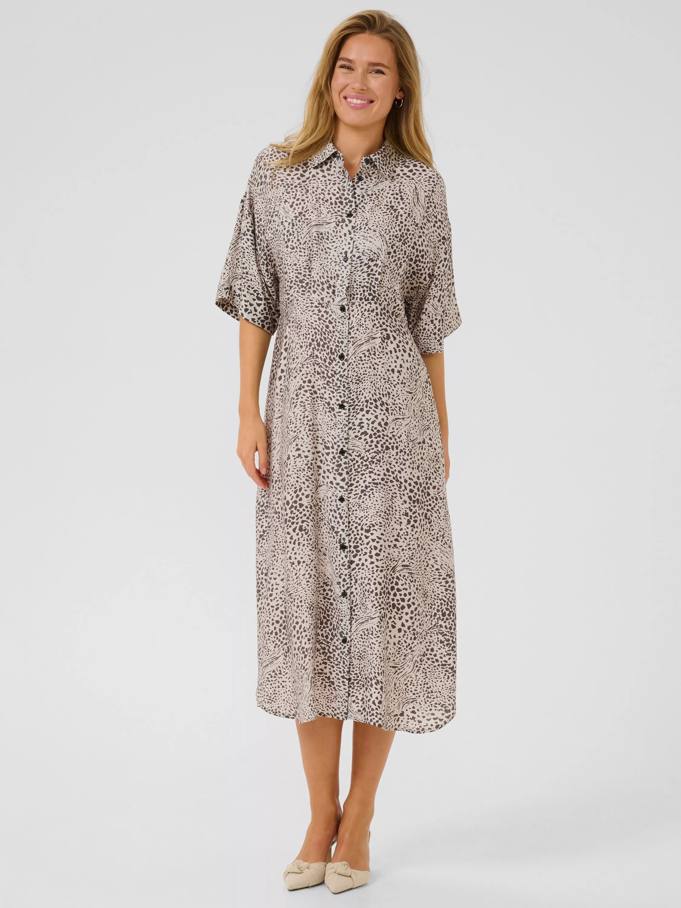 Elevate your wardrobe with this timeless shirt dress from KAFFE, featuring an abstract leopard print. Effortlessly chic for any occasion, this piece is cut with a classic collar, button-down front and half sleeves.