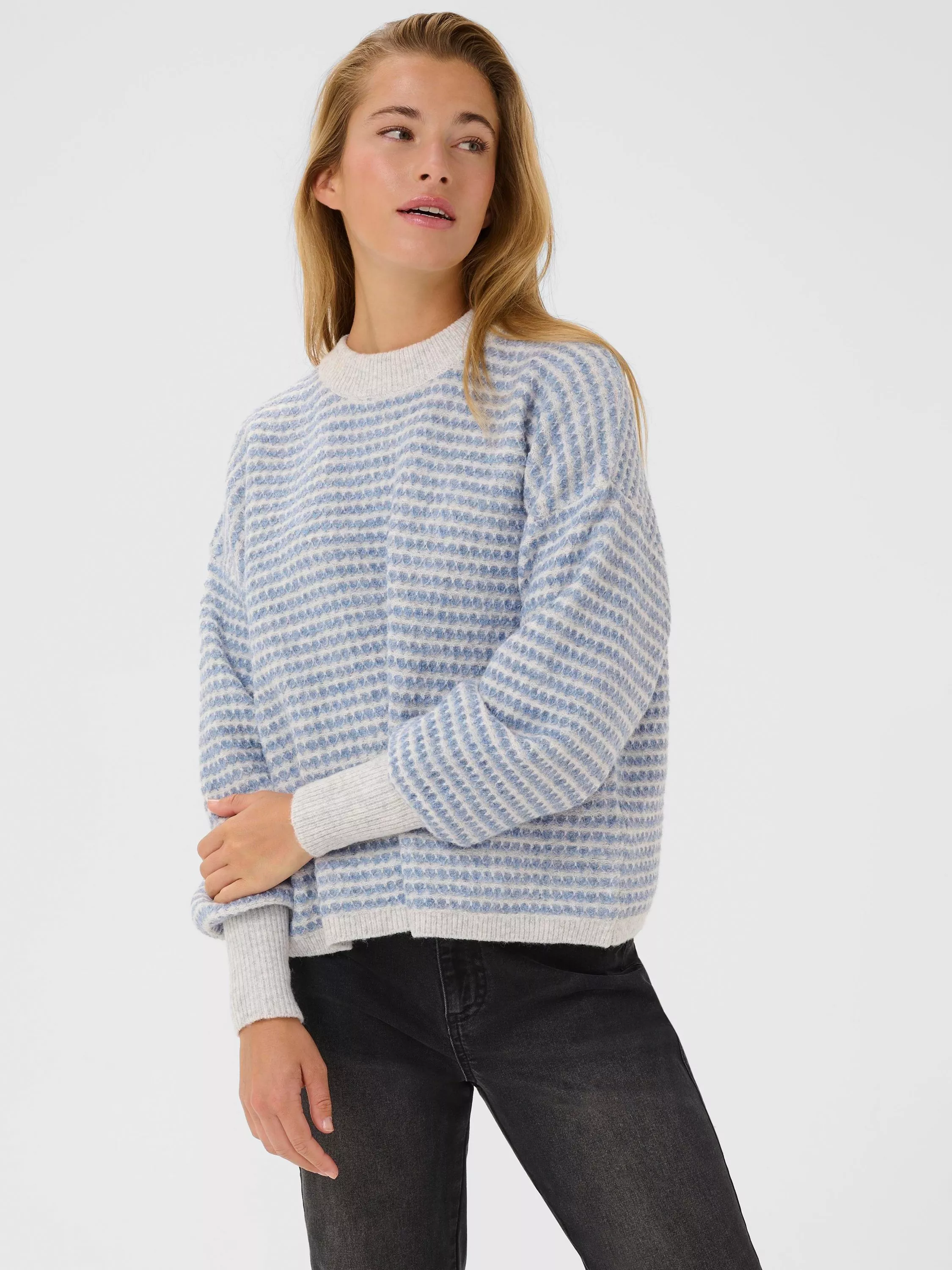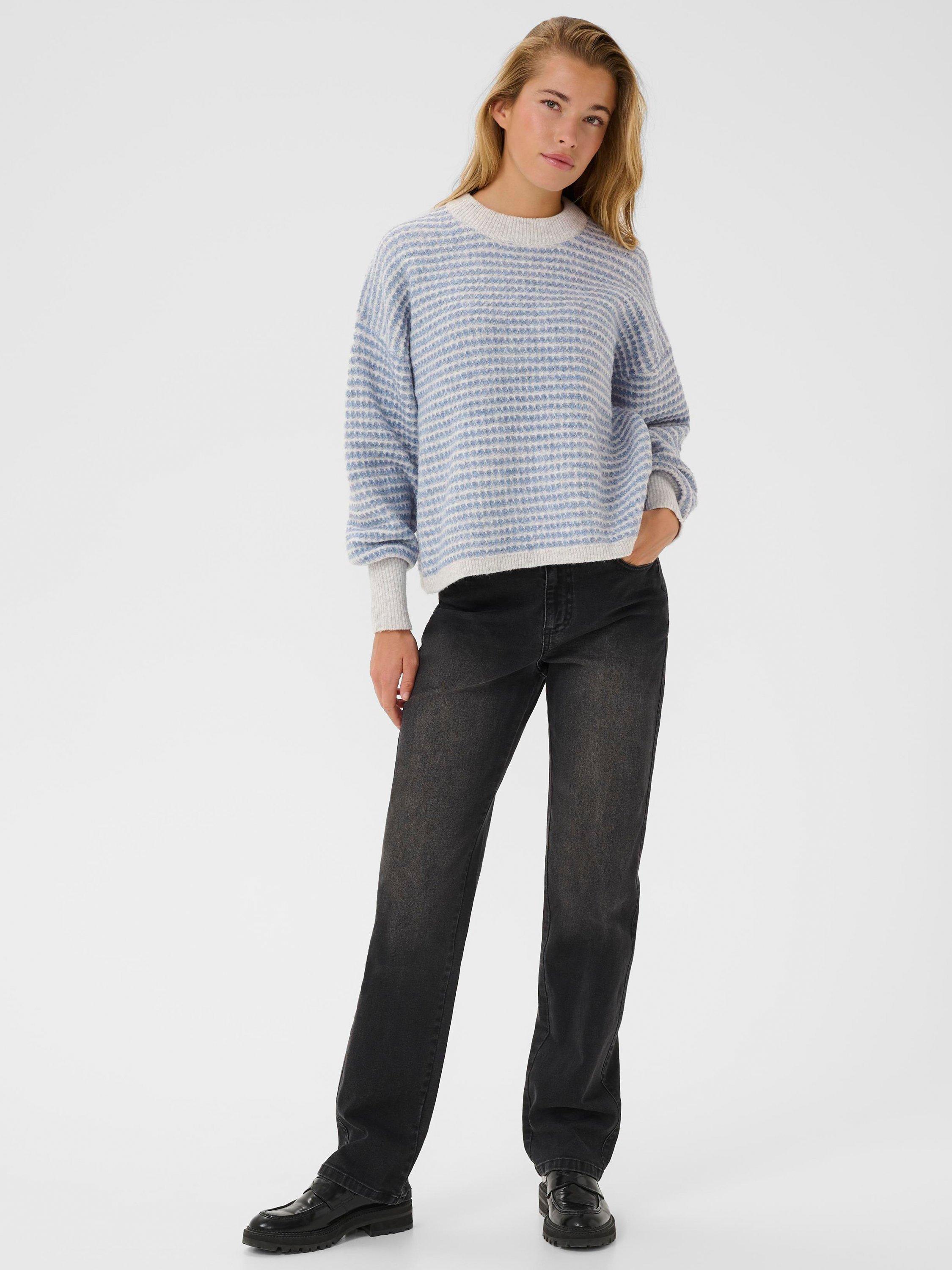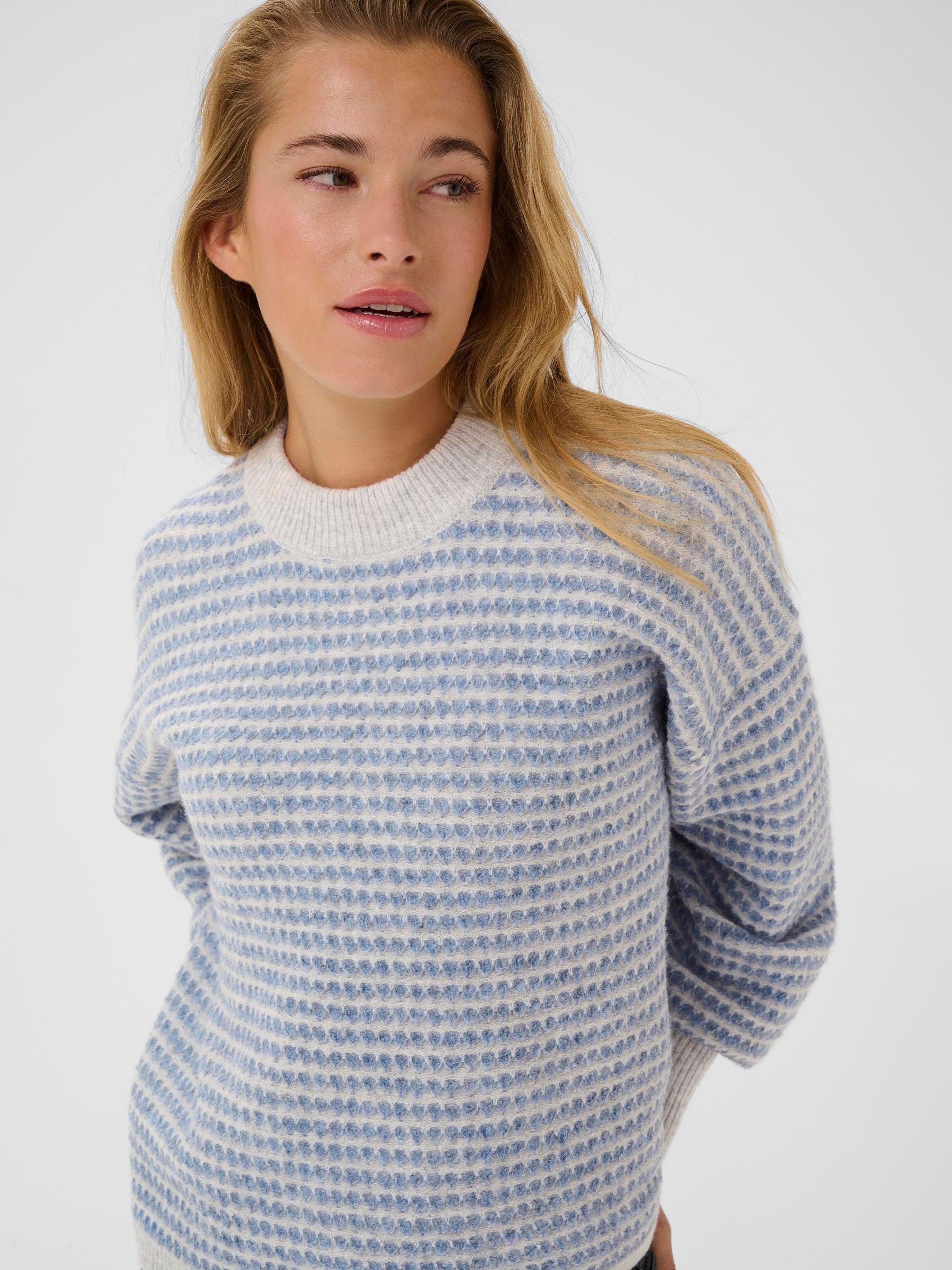 This KAFFE jumper combines soft warmth with a lively stripe design and a comfy crew neck, featuring a soft blend of fine materials to ensure style and comfort on chilly days.
