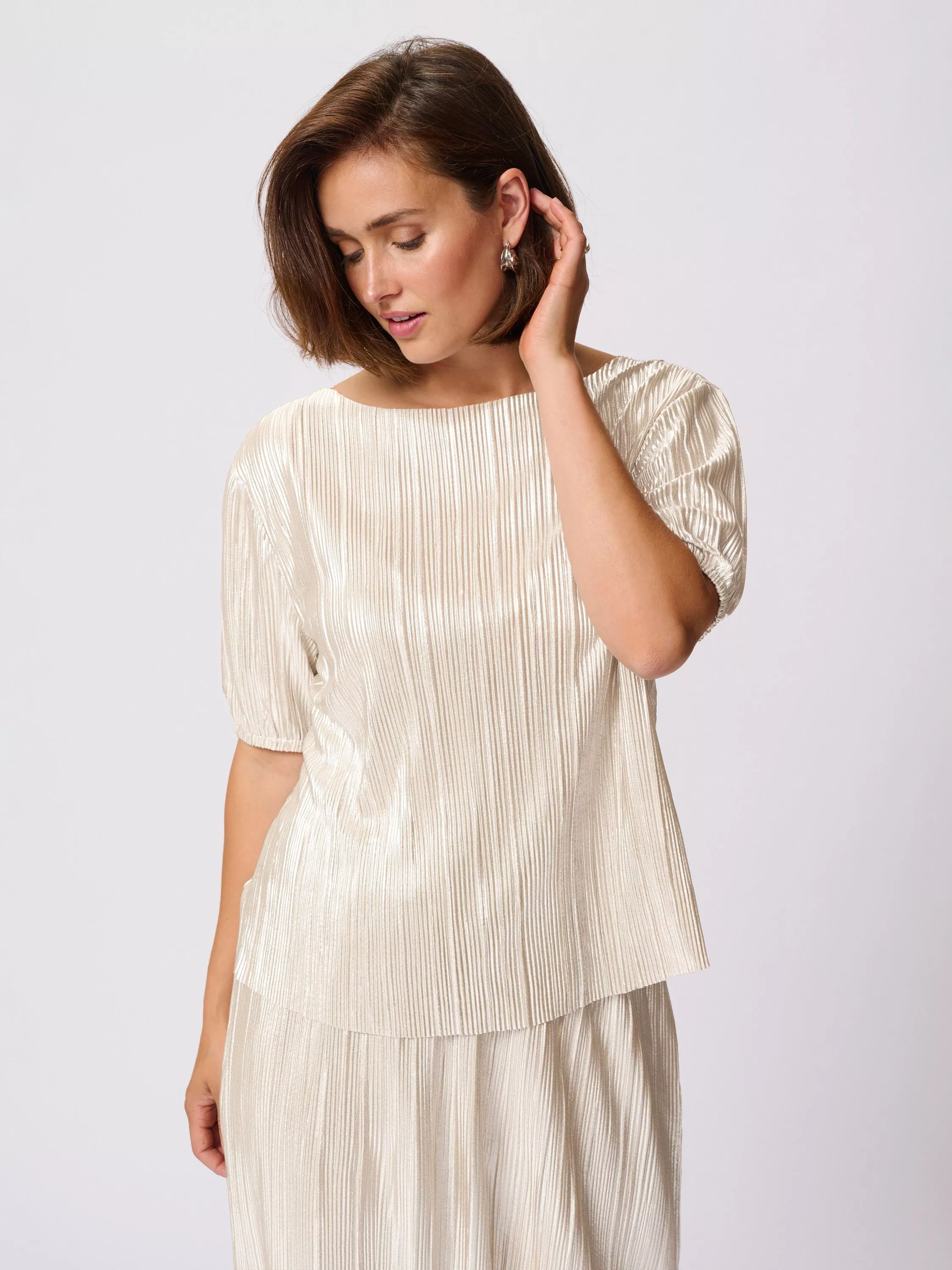 Channel elegance and sophistication with the KAgalexi blouse by KAFFE, featuring a flattering found neck and short sleeves. Crafted from a textured, metallic fabric.