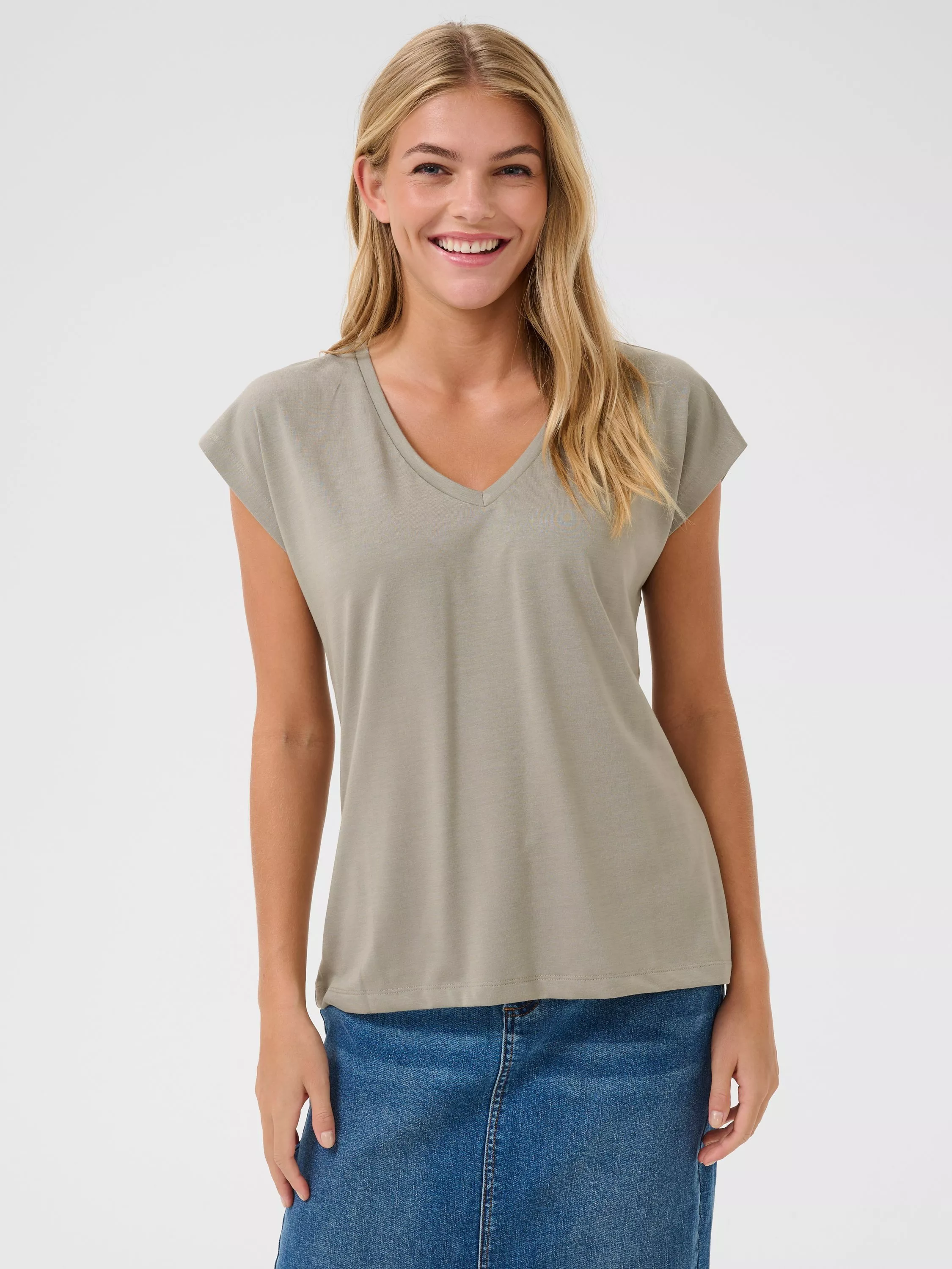 The KAlise t-shirt is the perfect basic item for your wardrobe and has a short batwing sleeve. Designed with a flattering v-neck in a regular fit, this t-shirt can be used with any item from jeans to shorts or a skirt.