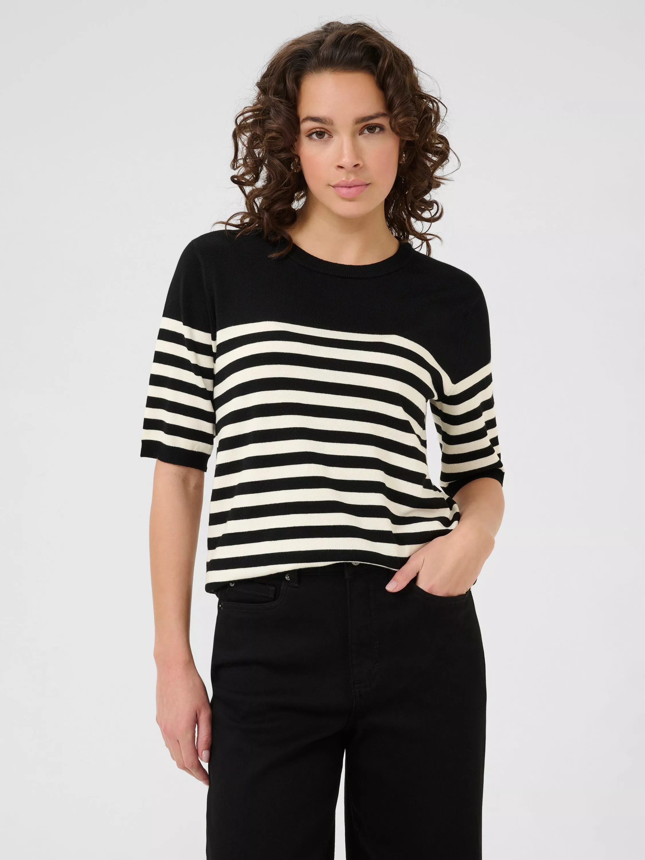 Cut with a crew neck and short sleeves, this mid-weight striped jumper by KAFFE will take the cool weather in its stride.