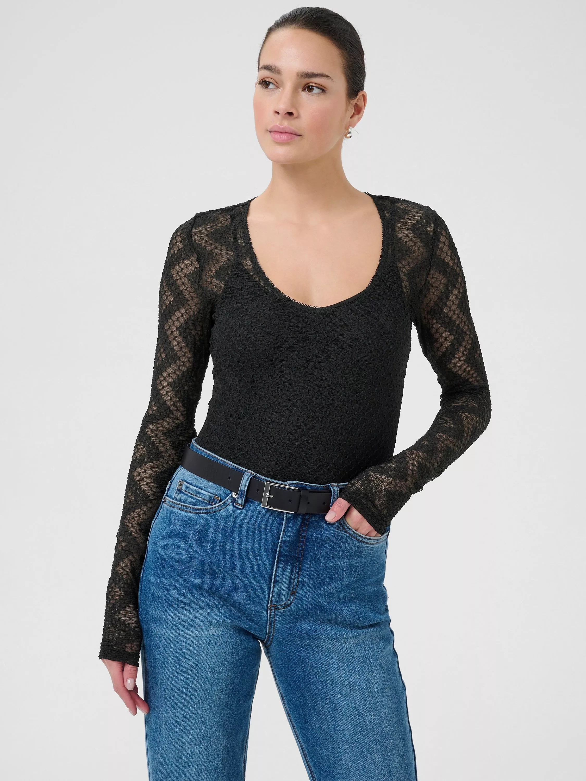 KAFFE brings you a textured lace top that teams comfort with a touch of drama. Its long sleeves and round neck make it ideal for elevating everyday outfits, while the clever design ensures all-day wearability.