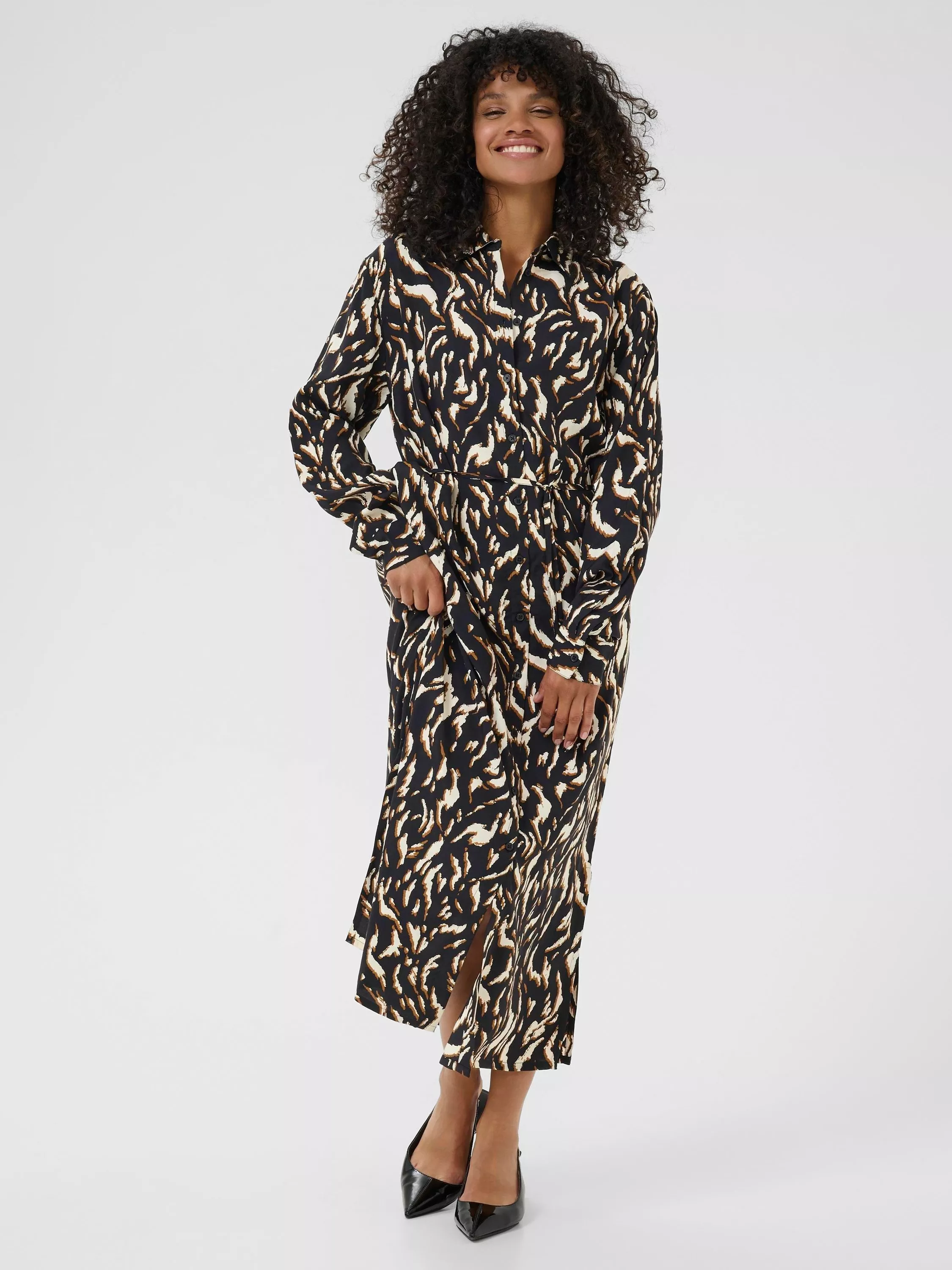 A midi shirt dress by KAFFE. Its clever animal pattern adds a playful twist, while the soft viscose blend keeps you at ease for busy mornings or laid-back afternoons.