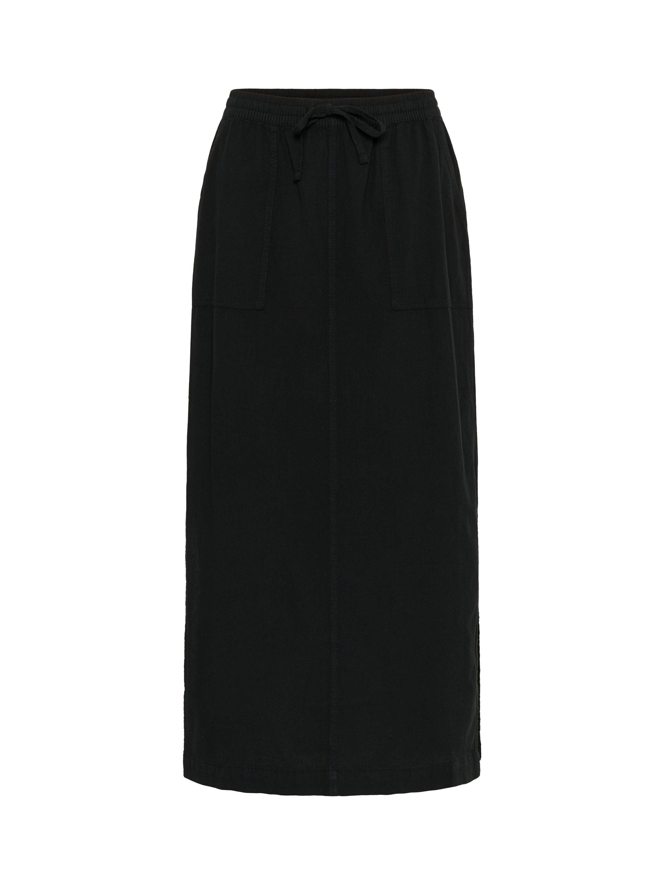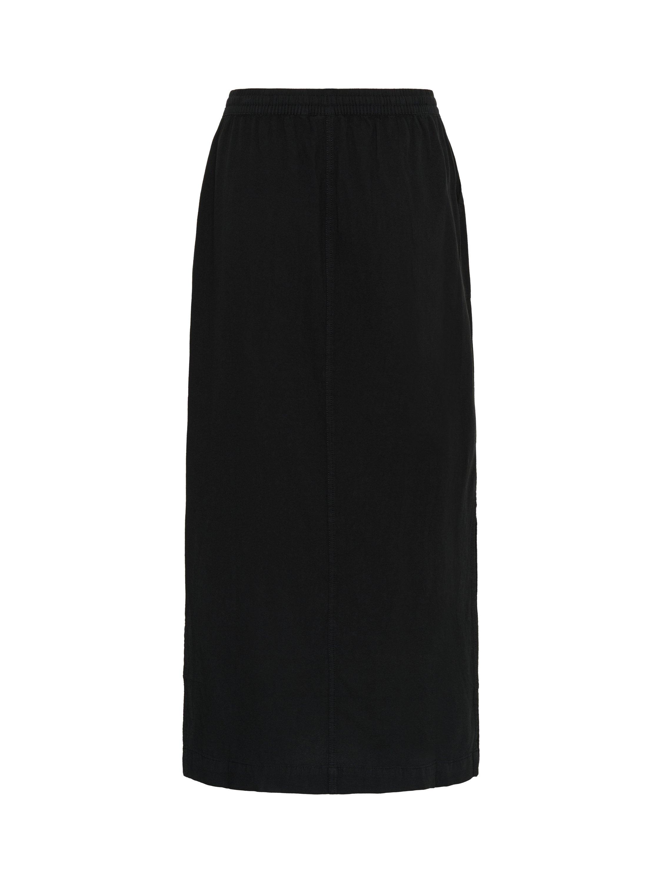 This cotton maxi skirt is an easy-going, casual style and is a great match with a simple top or tee. It is high-waisted with an elastic drawstring waist and cut in a straight silhouette. Finished with patch side pockets, this skirt is ankle length and has high slits on both sides.