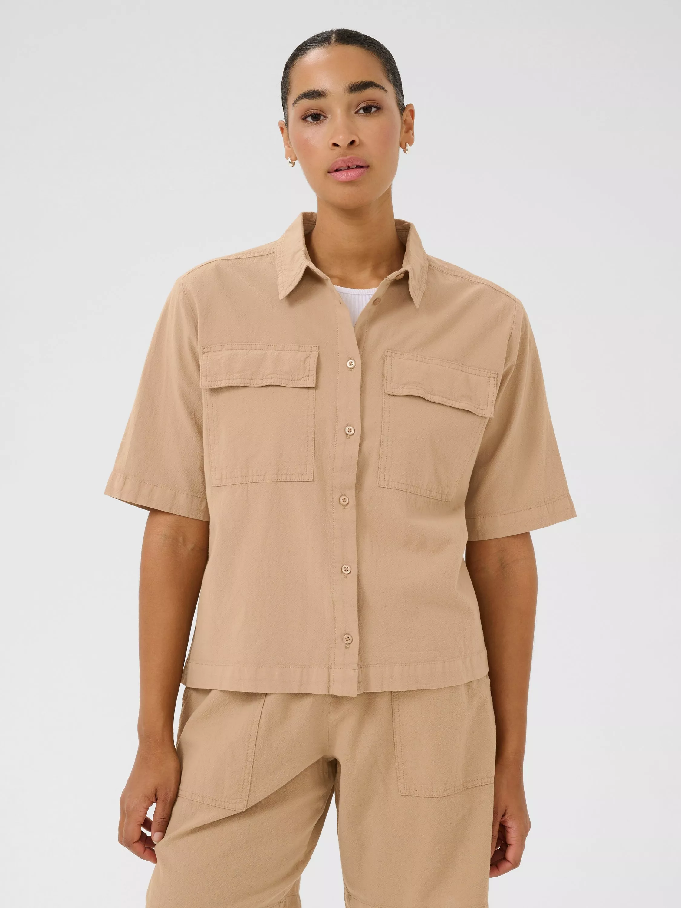 This casual, boxy fit utility shirt will add a cool touch to any outfit. Designed with a spread collar, button fastenings, a wide short sleeve and chest pockets with flaps, this cotton shirt finishes at the hip.
