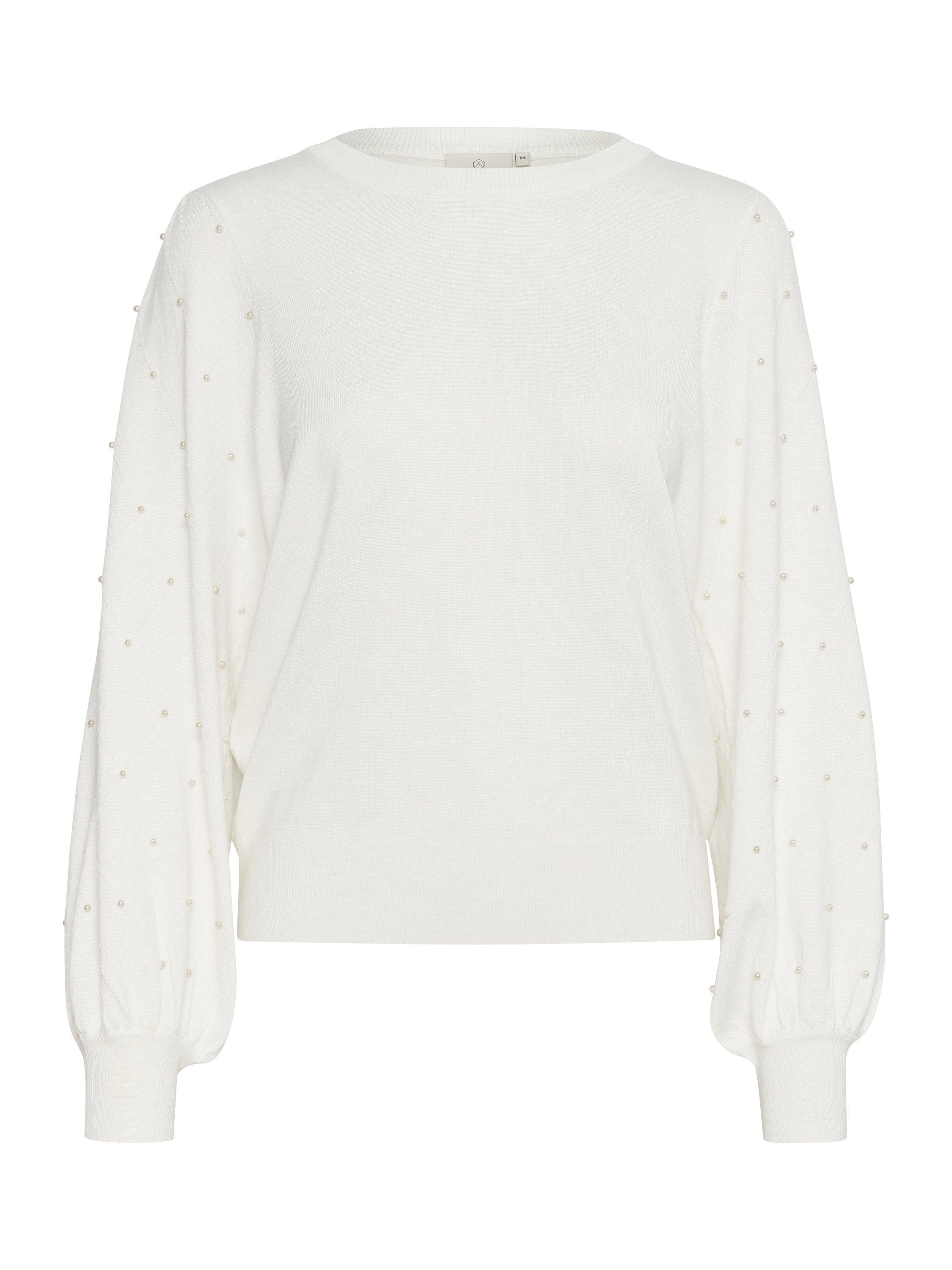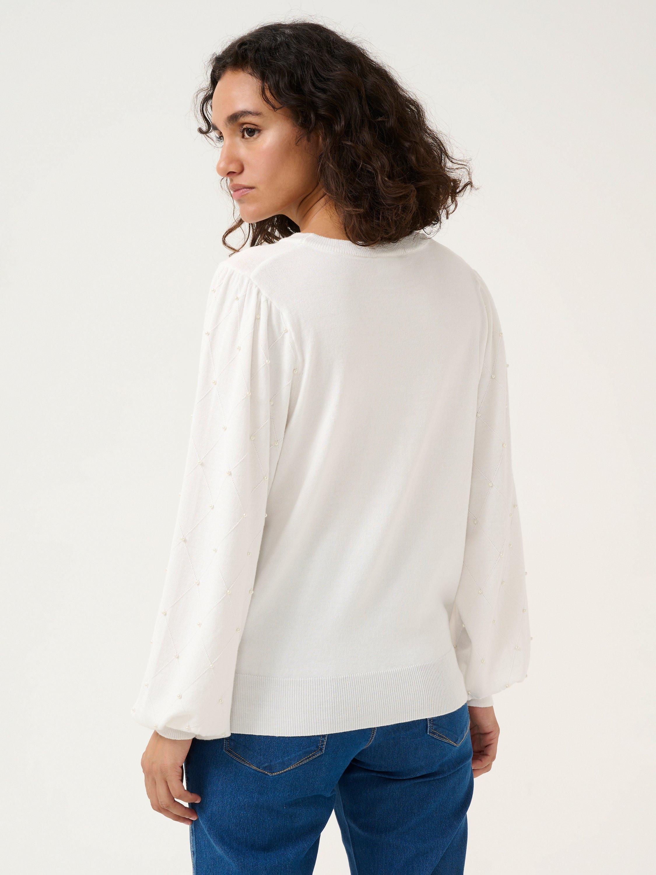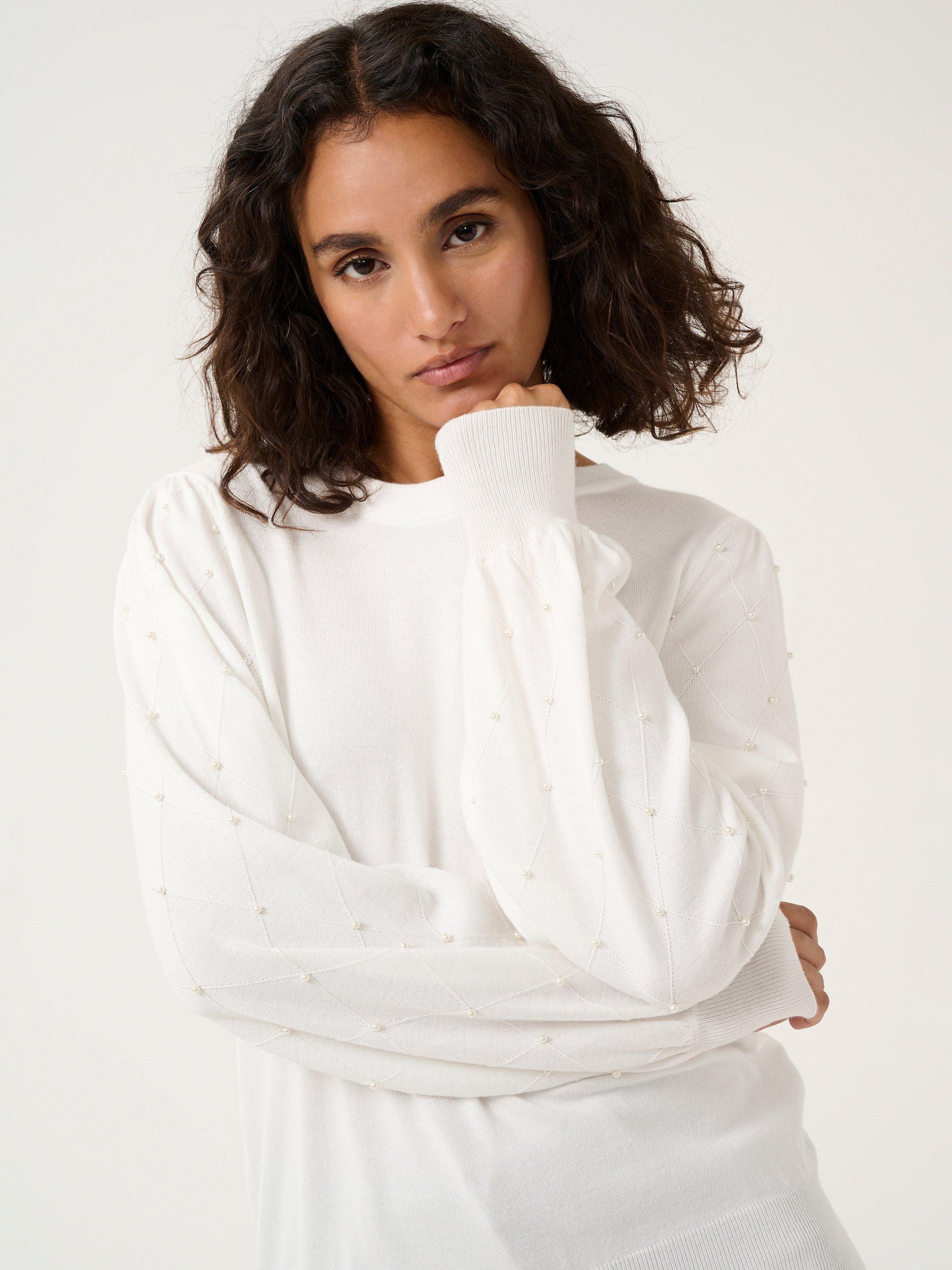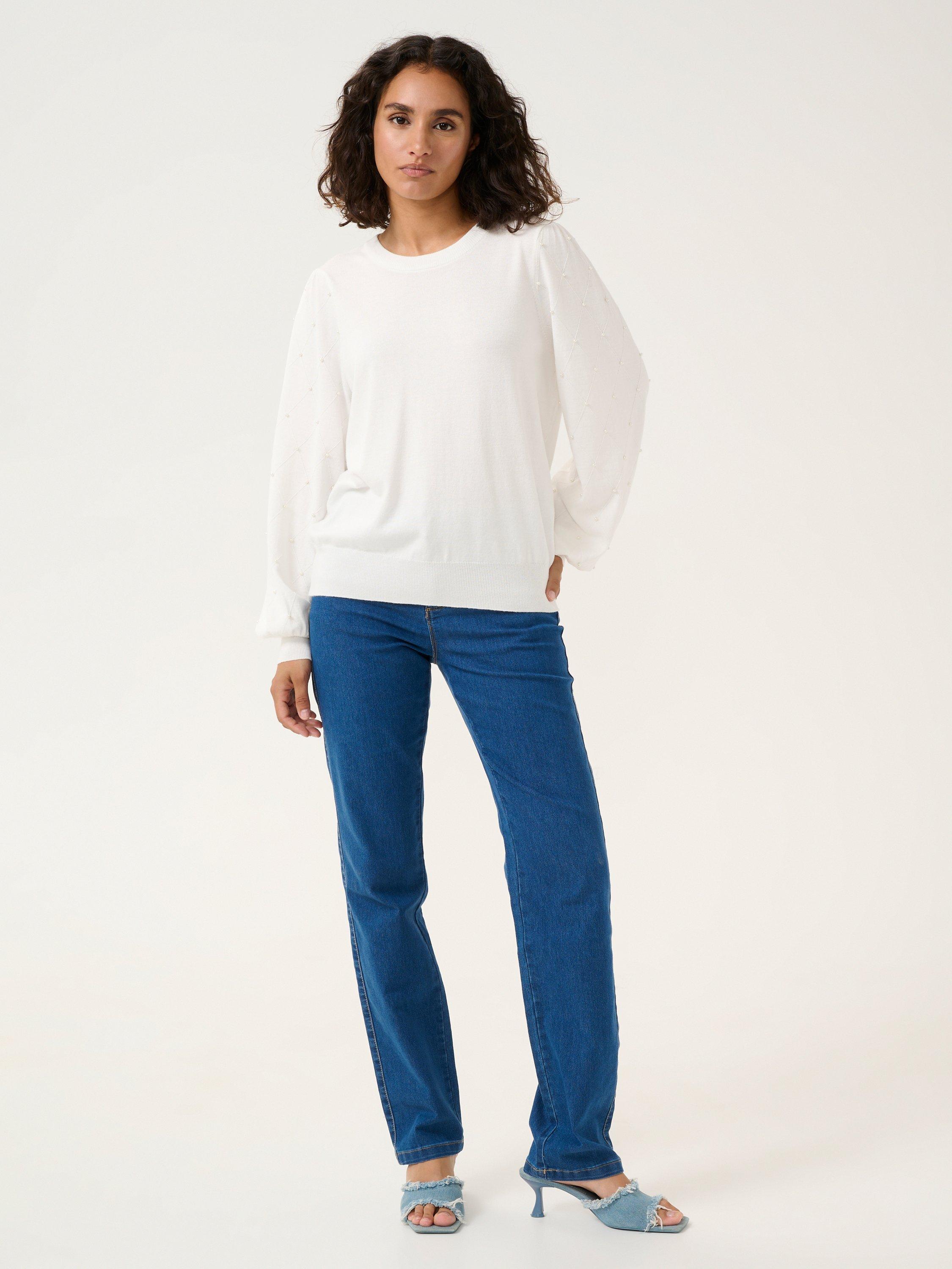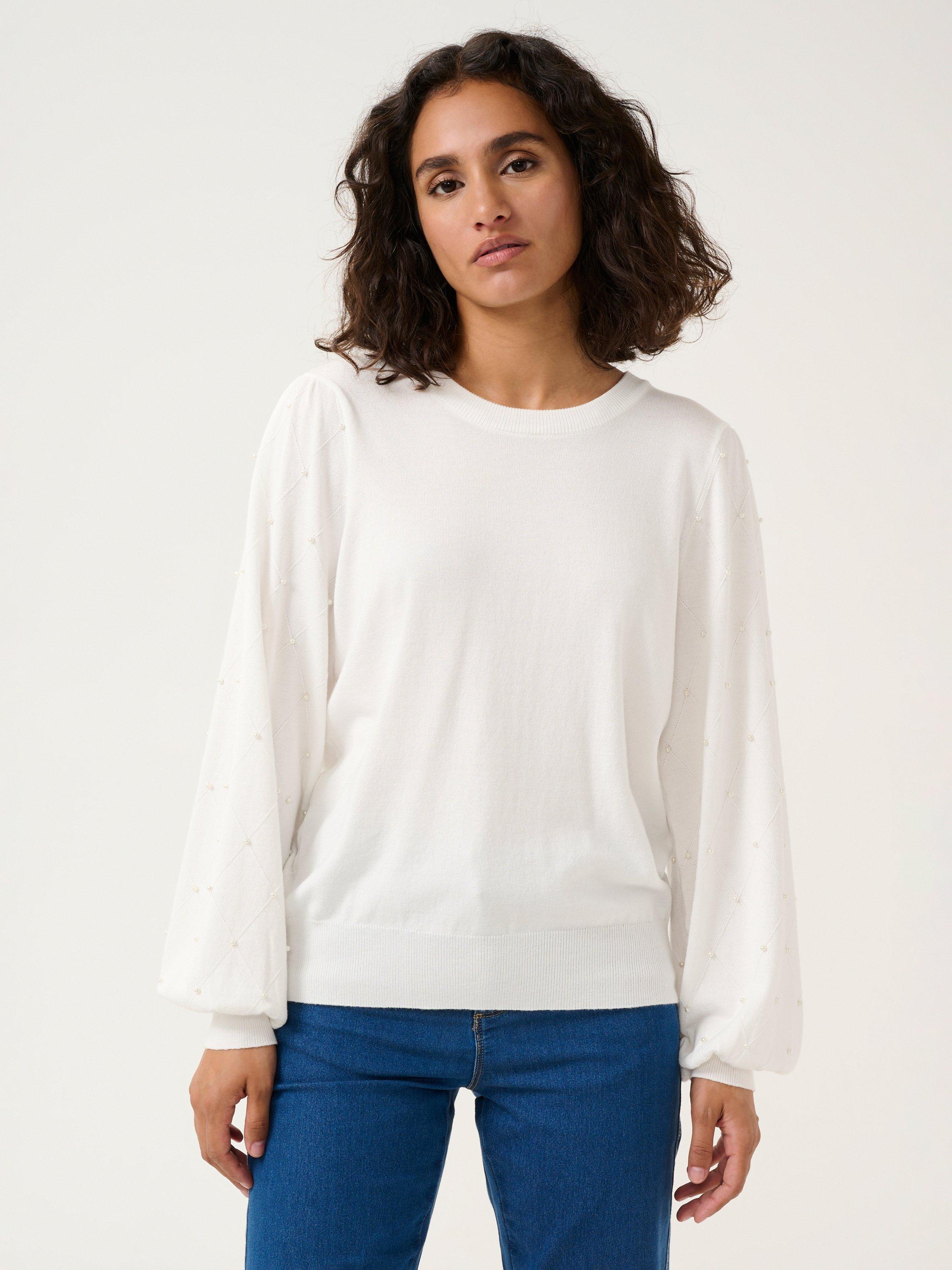 Topped with a crew neck and long bishop sleeves with wide knit cuffs, this diamond bead jumper from KAFFE will be the first thing you reach for as the weather cools.