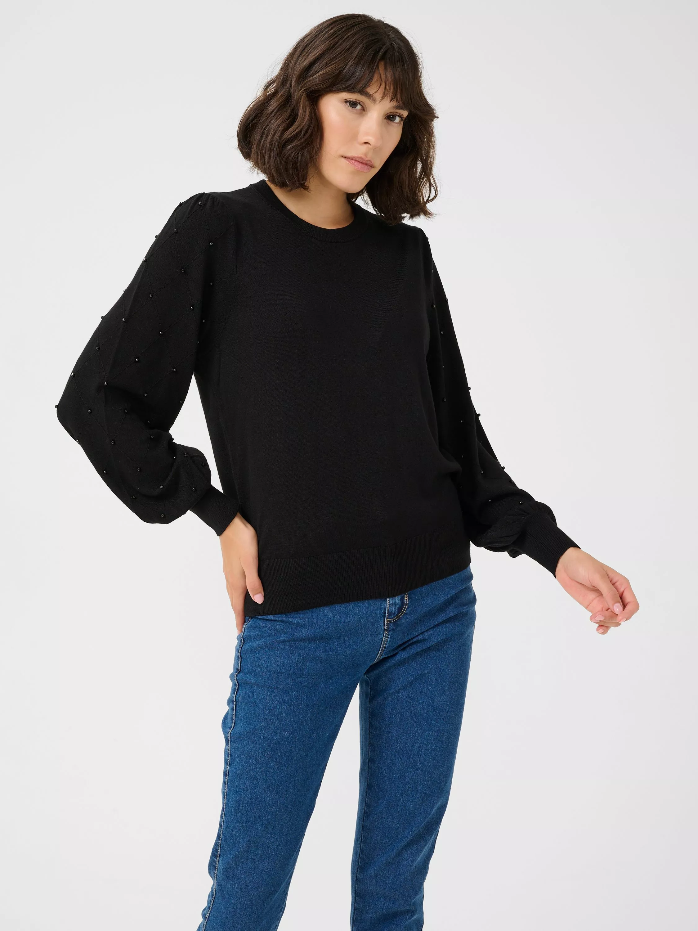 Topped with a crew neck and long bishop sleeves with wide knit cuffs, this diamond bead jumper from KAFFE will be the first thing you reach for as the weather cools.