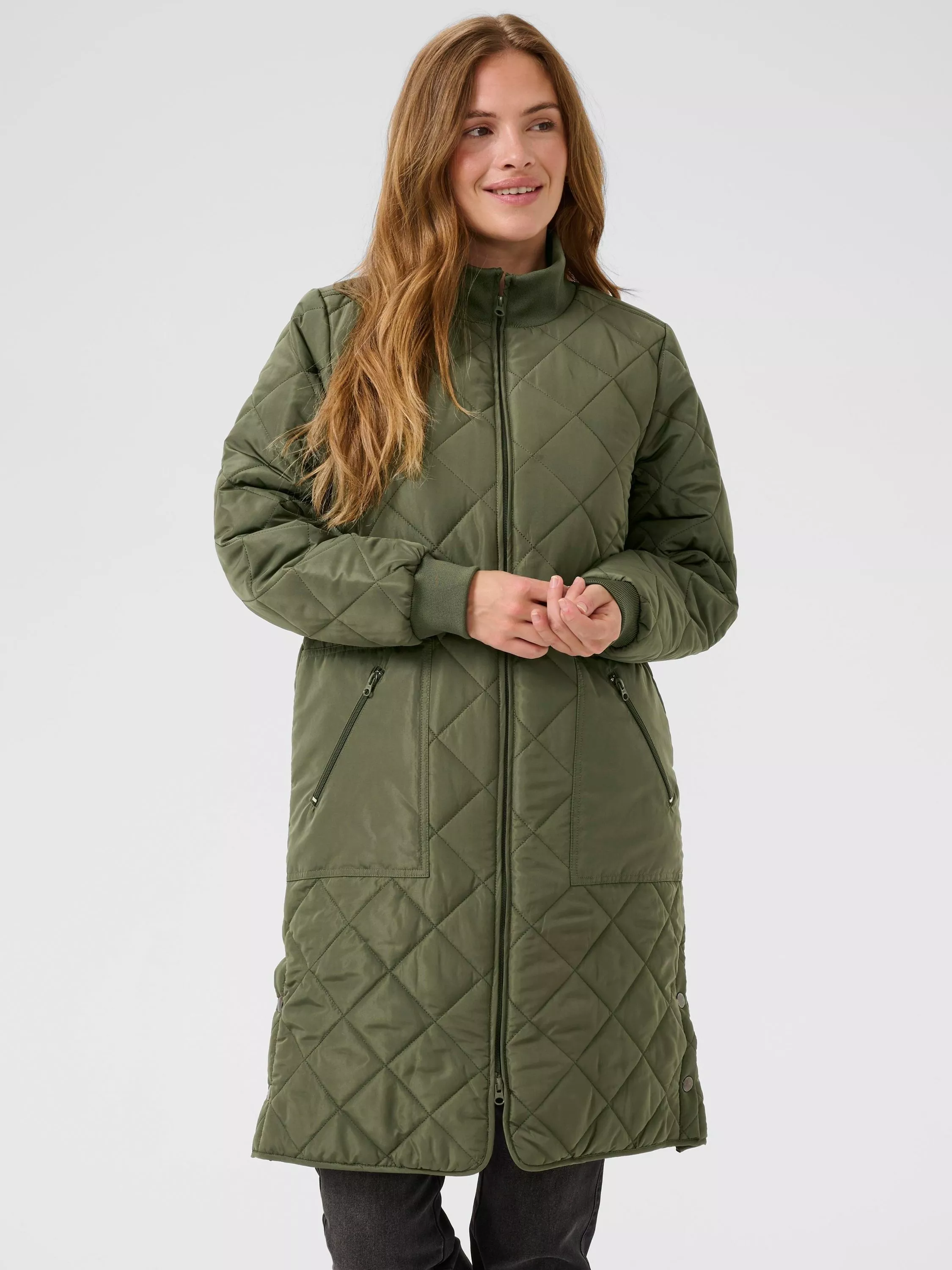 KAFFE's quilted coat – designed for day-long comfort with a high neck, handy zip, and longline cut, keeping you cosy while you move through your day with ease and purpose.