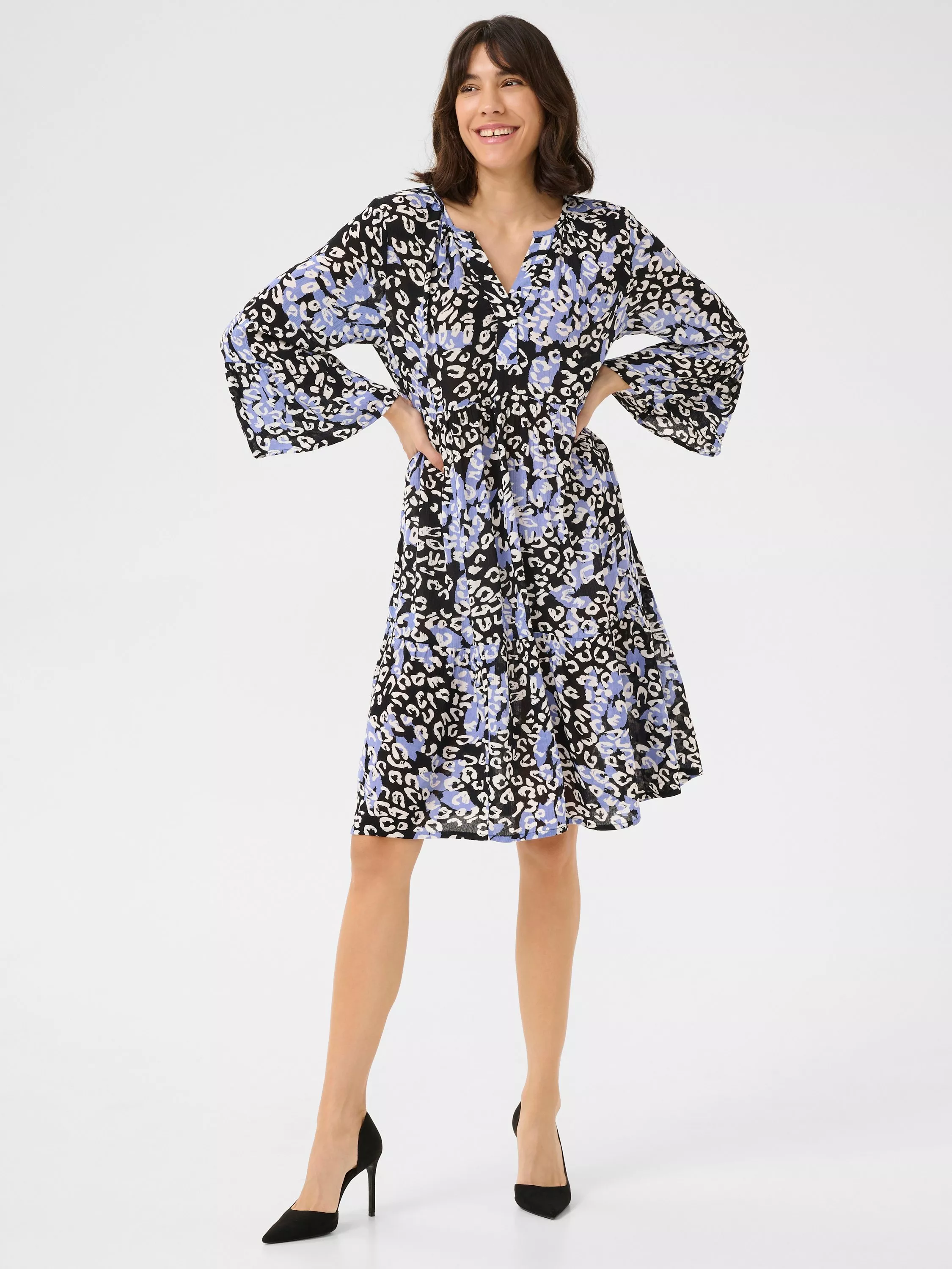 The lea dress is a casual dress and a must-have style in any wardrobe. It has a V-notch neck with pleats along the neckline, and it has a relaxed A-line fit with flared tiers. The sleeves are 3/4 length with a wide fit and ruffled edges, and the dress is cut above the knees.