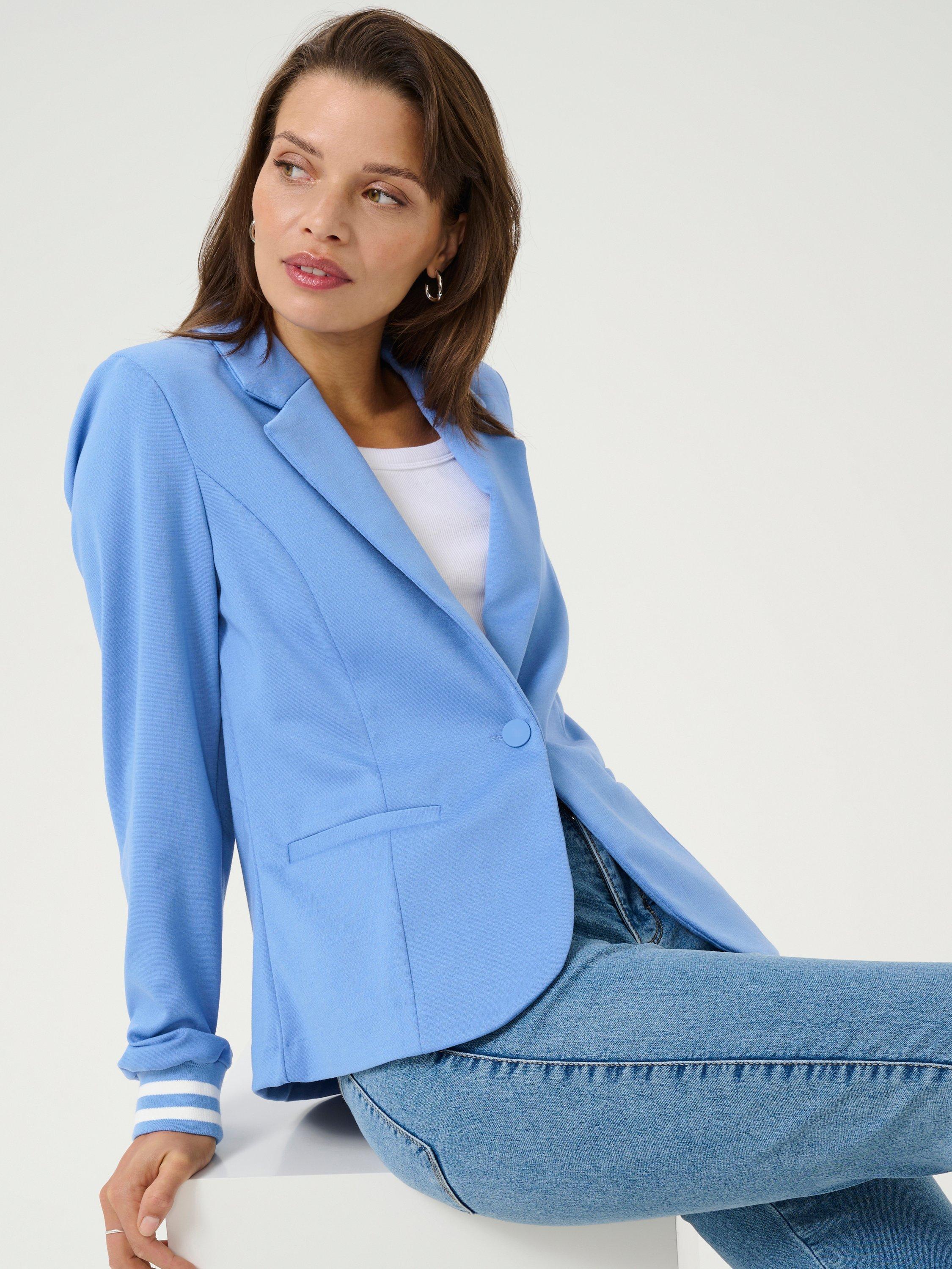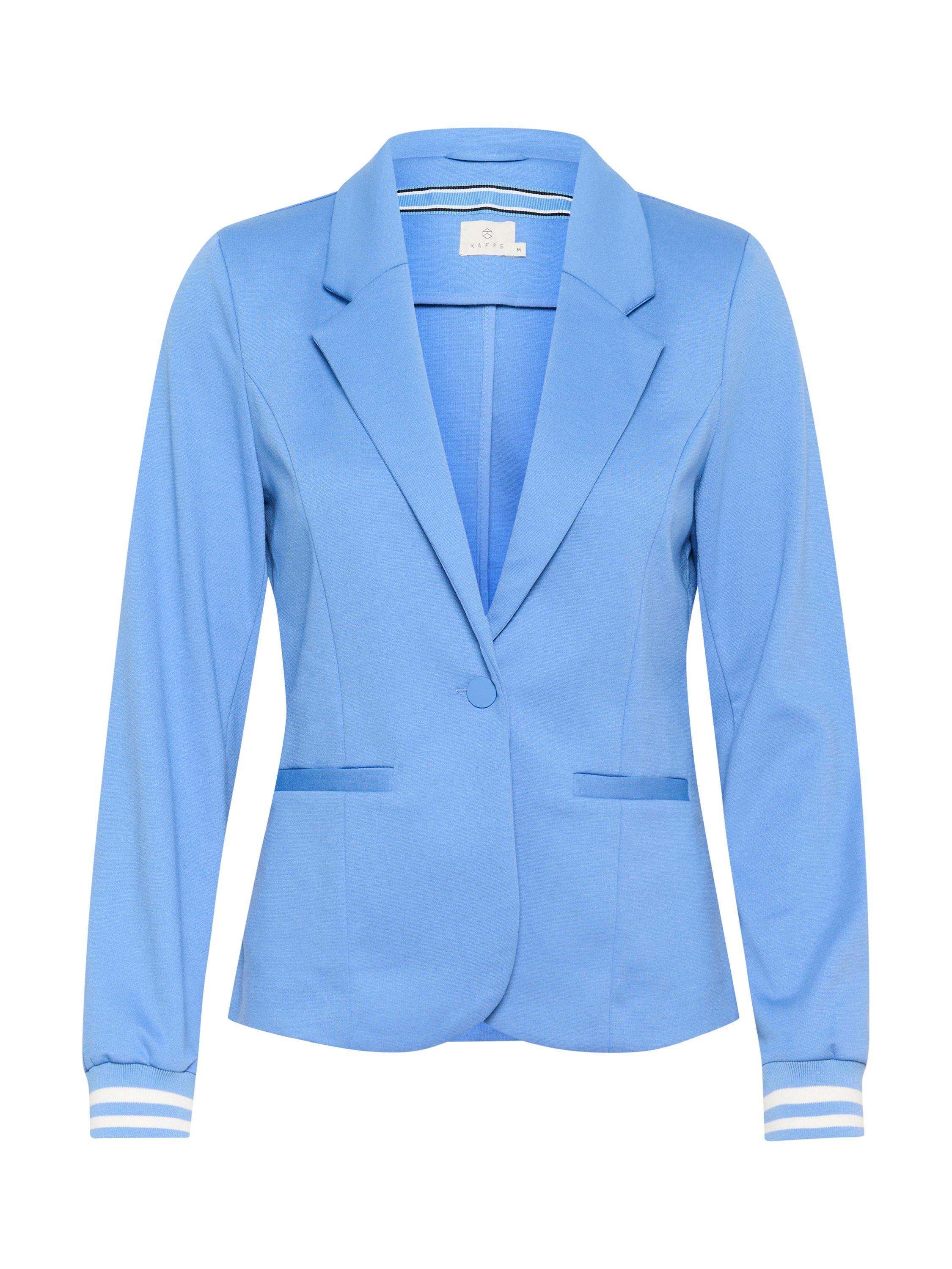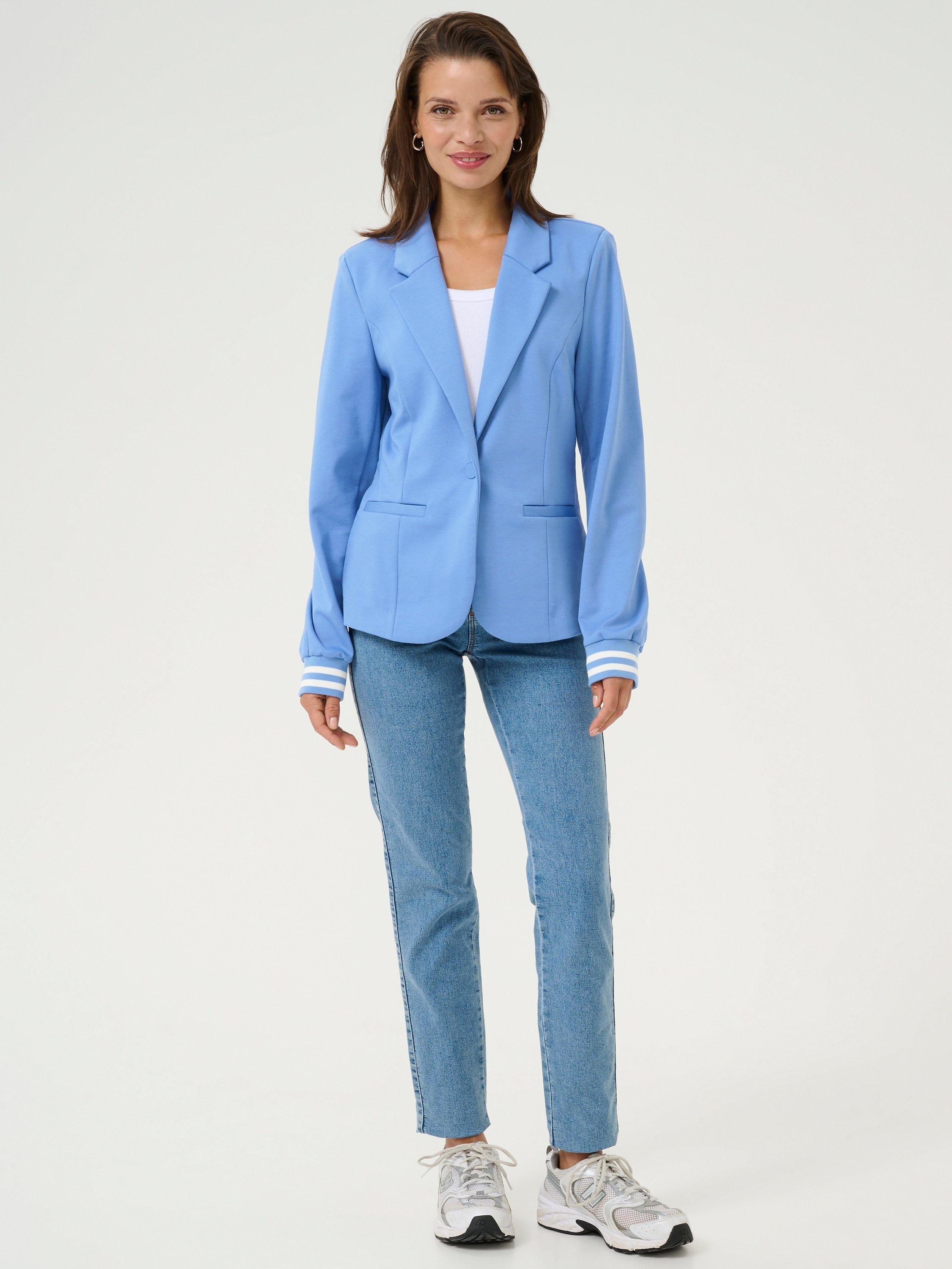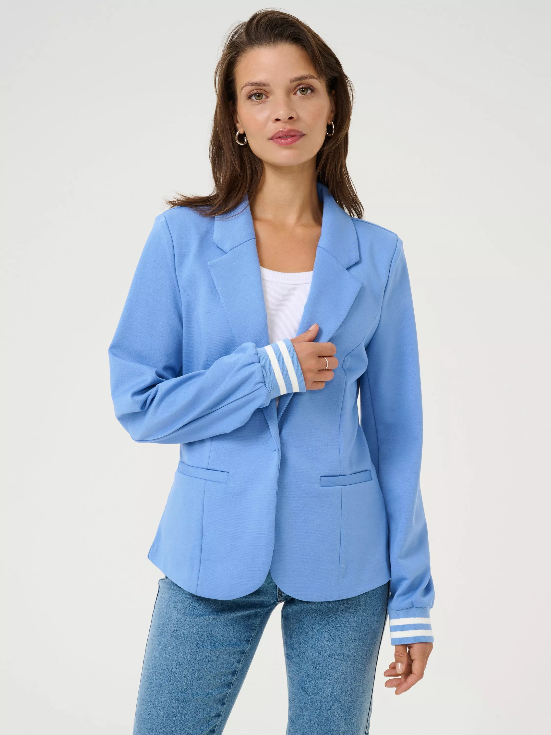 The kinnie blazer is sporty take on the classic blazer. It has a slim fit and long sleeves that are finished with a rib knit edge with stripes. The blazer has princess seams and jetted pokcets, and it has a classic notch lapel.