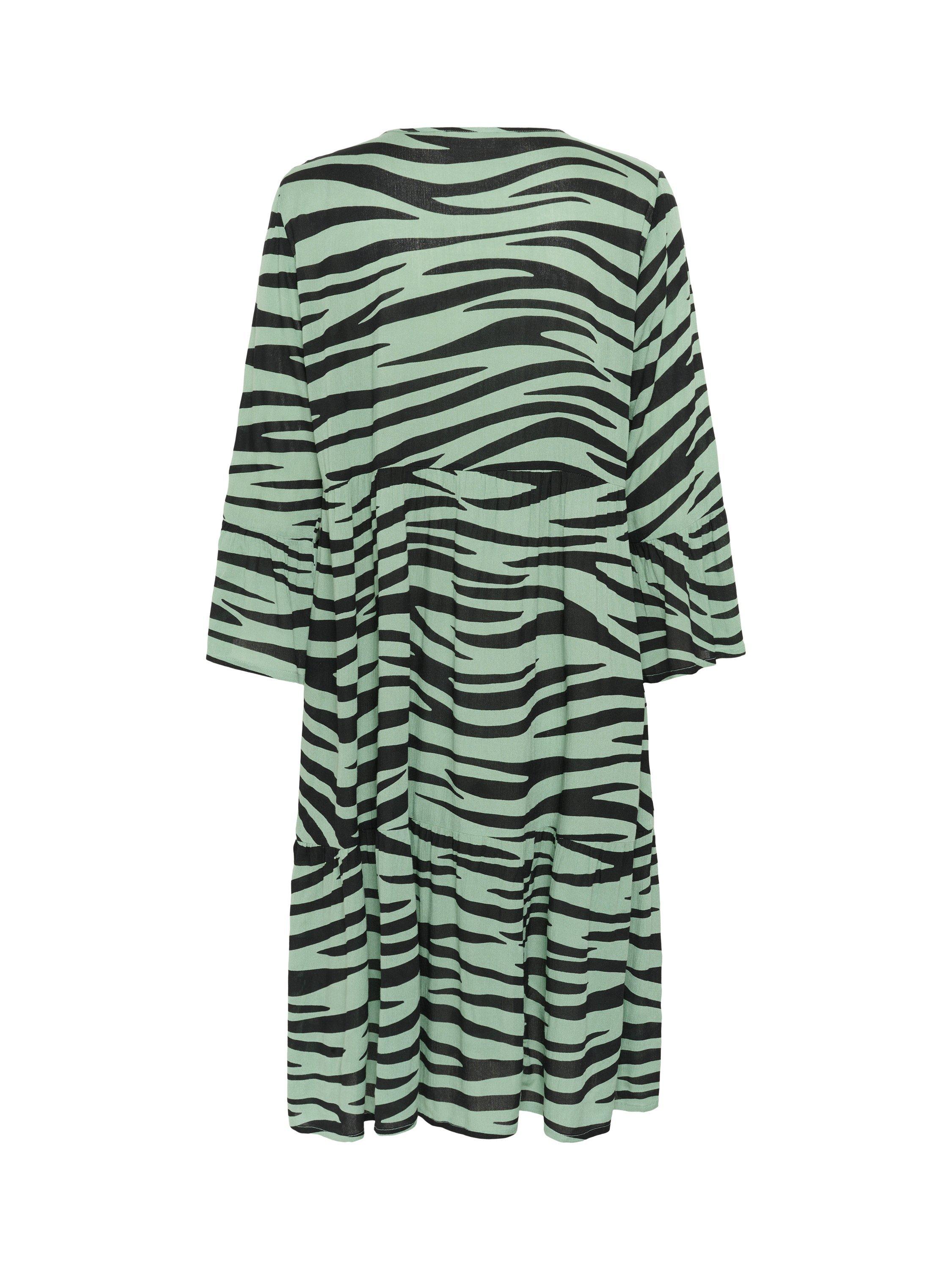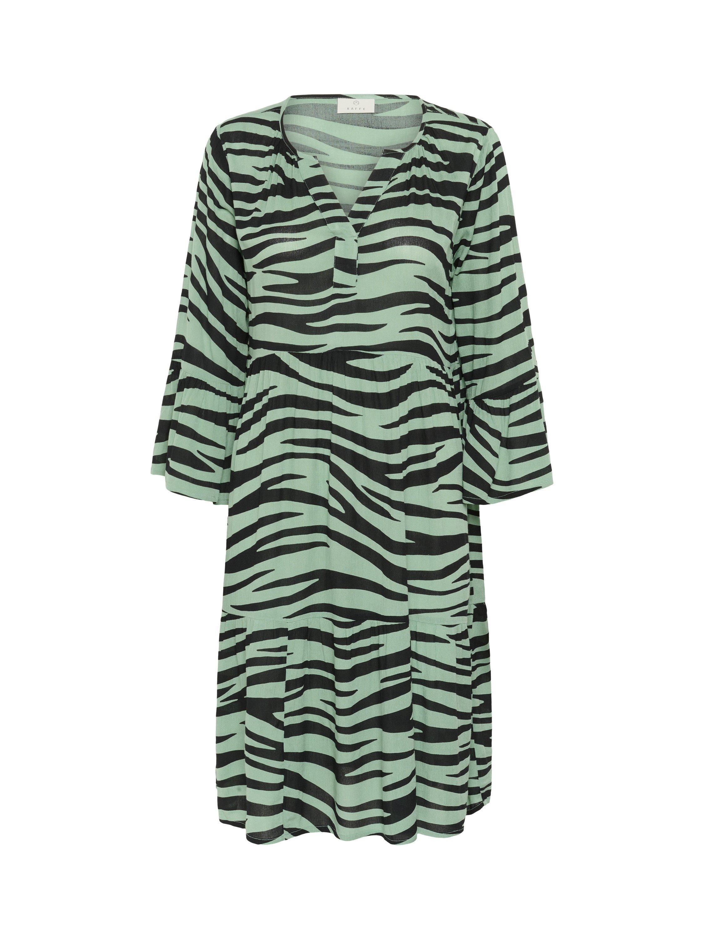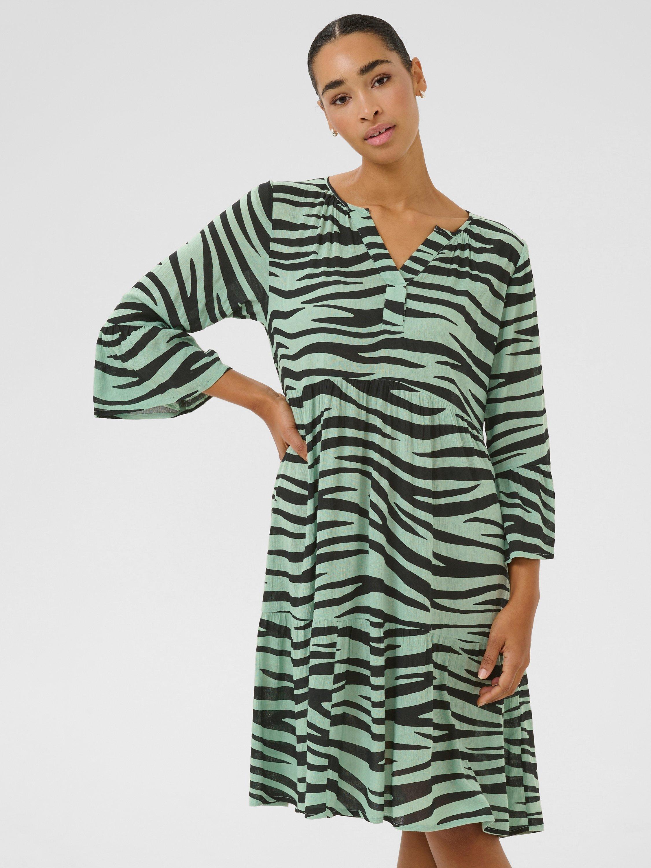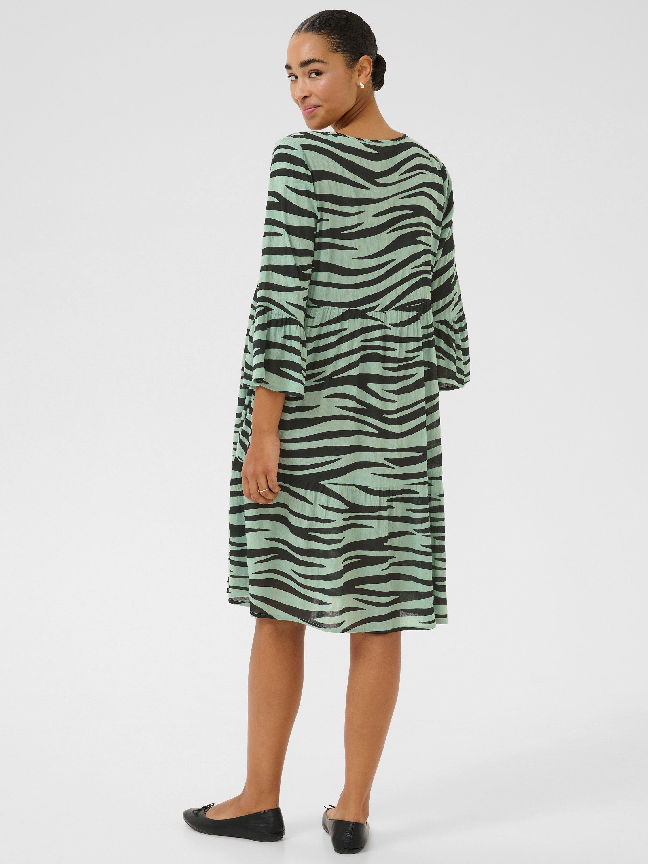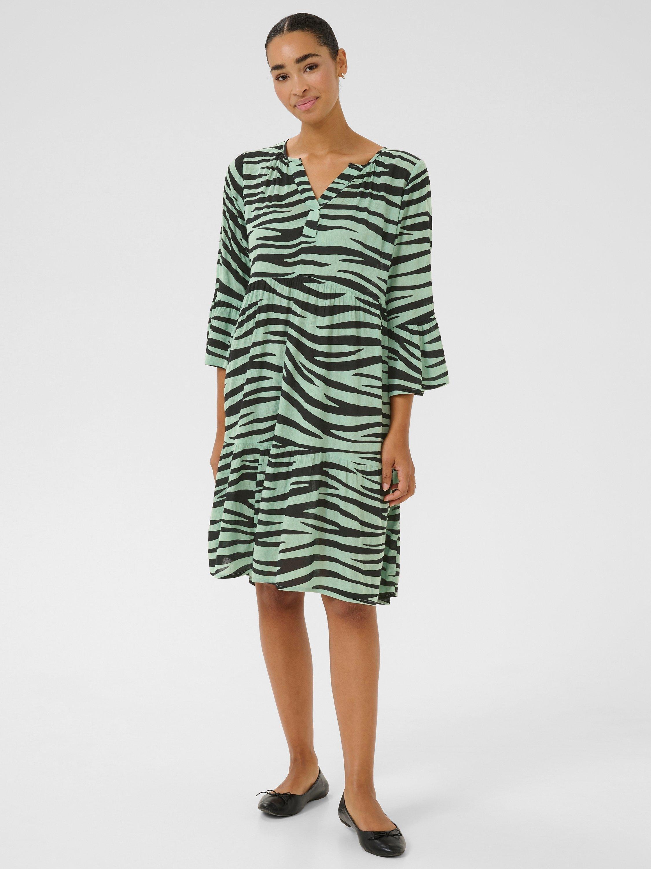 The lea dress is a casual dress and a must-have style in any wardrobe. It has a V-notch neck with pleats along the neckline, and it has a relaxed A-line fit with flared tiers. The sleeves are 3/4 length with a wide fit and ruffled edges, and the dress is cut above the knees.