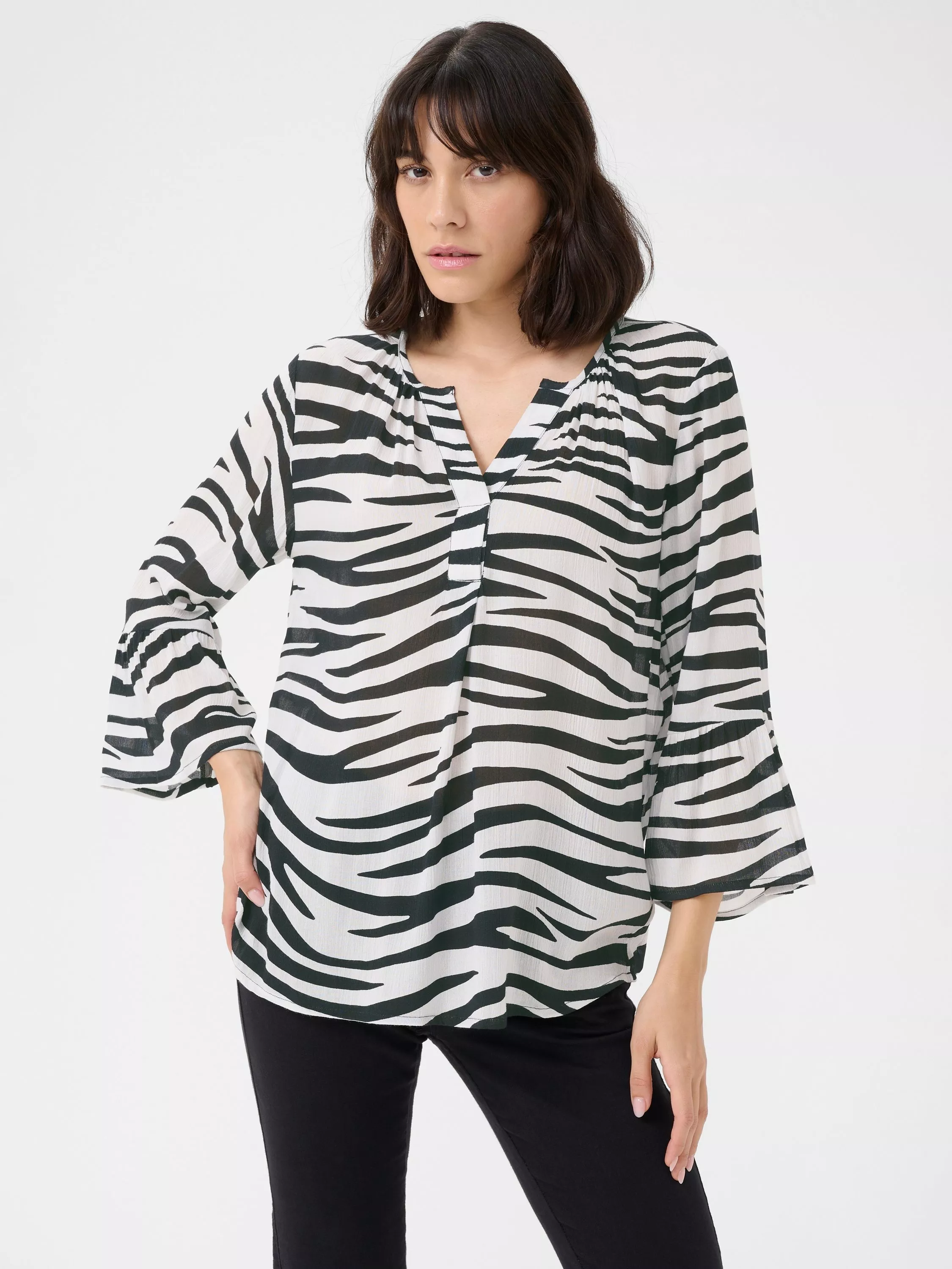 The lea blouse is a feminine top in a great print. It has a V-notch neck with small pleats along the neckline, and it has a regular fit. The sleeves are 3/4 length with a wide fit, and they have a wide, ruffled edge.