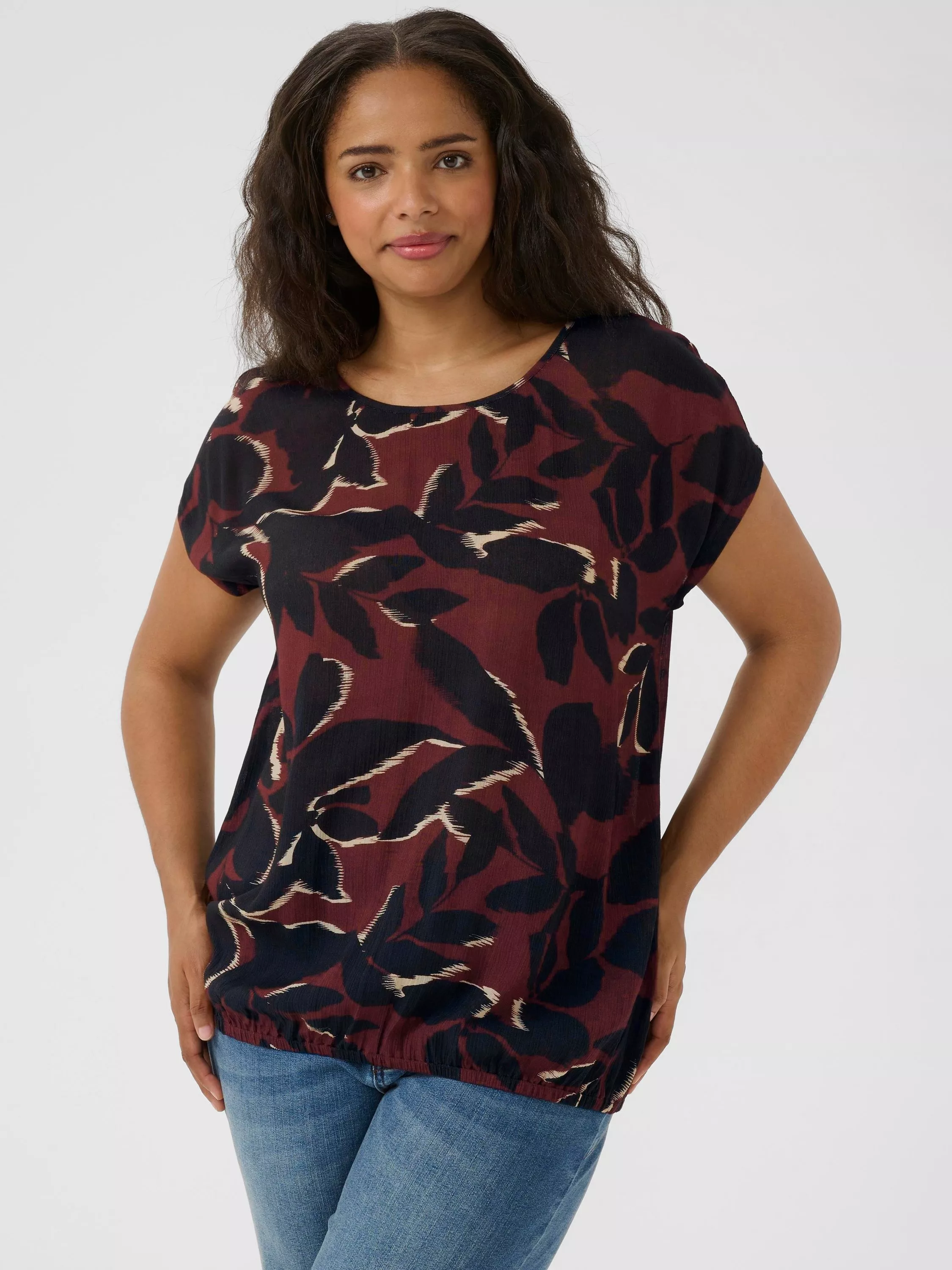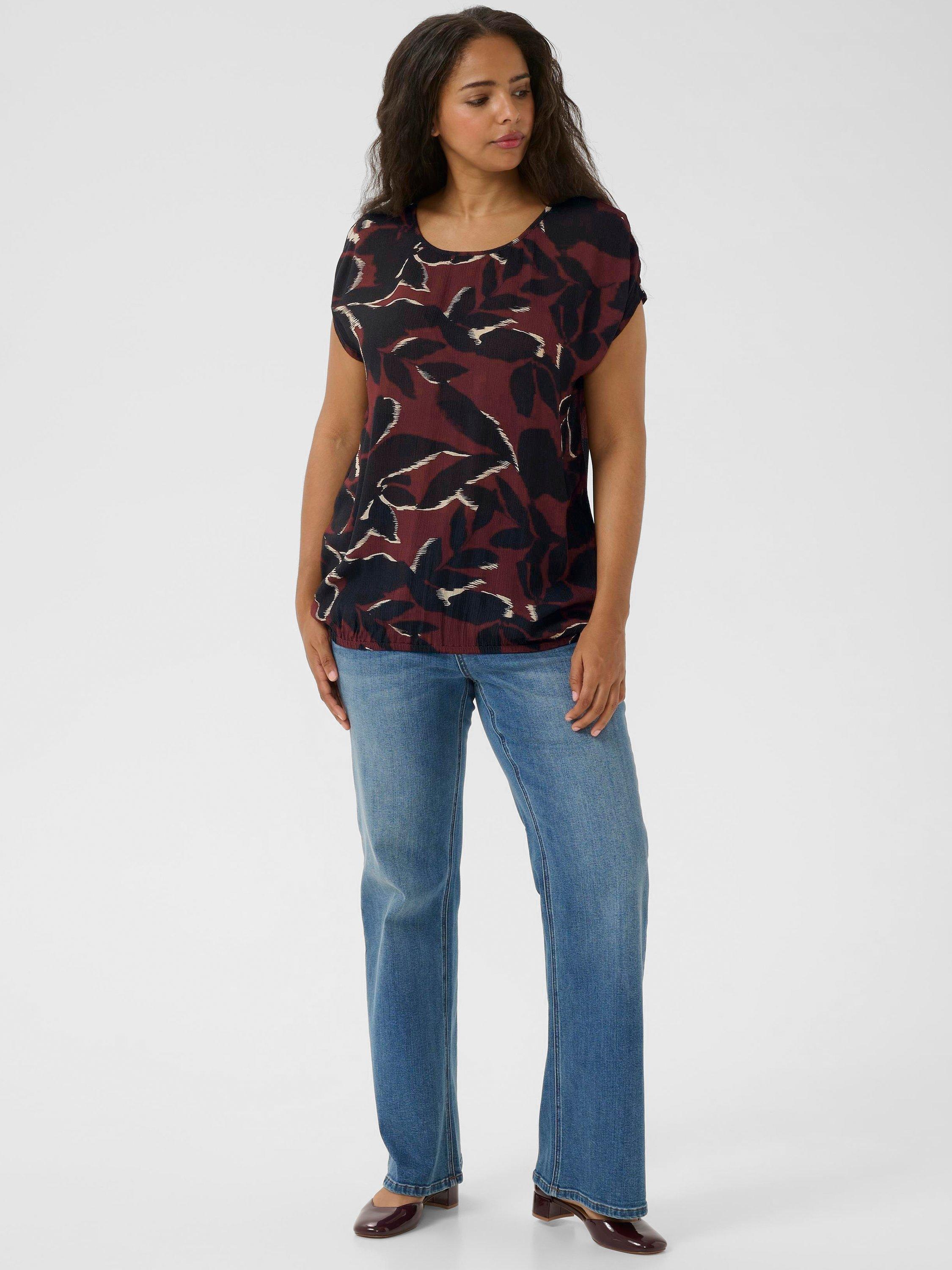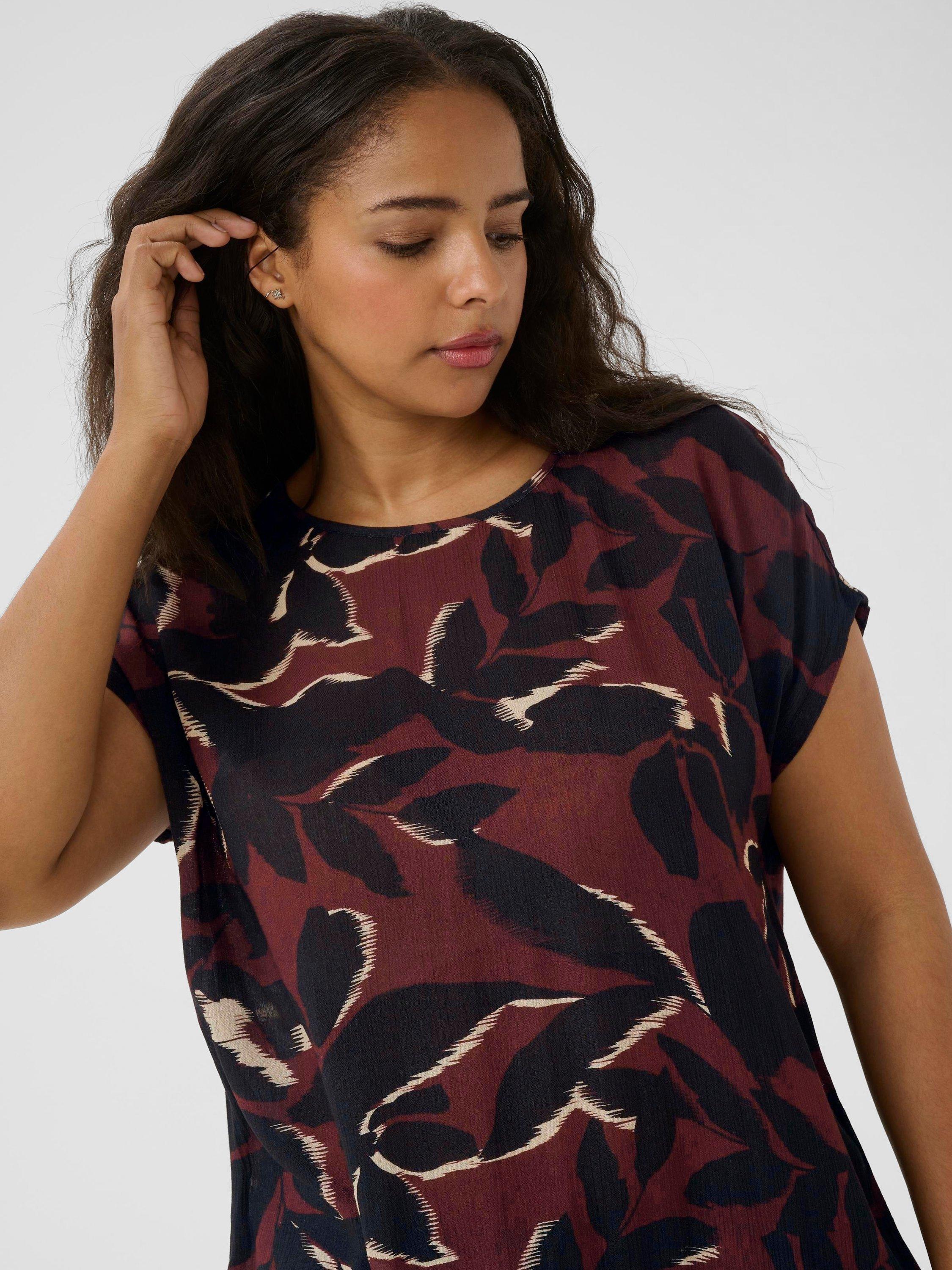 KAFFE presents a blouse that strikes a perfect balance between charm and practicality. Effortlessly detailed with a vibrant leaf and tree pattern, this short-sleeve top in luxurious viscose is designed for comfort and style.