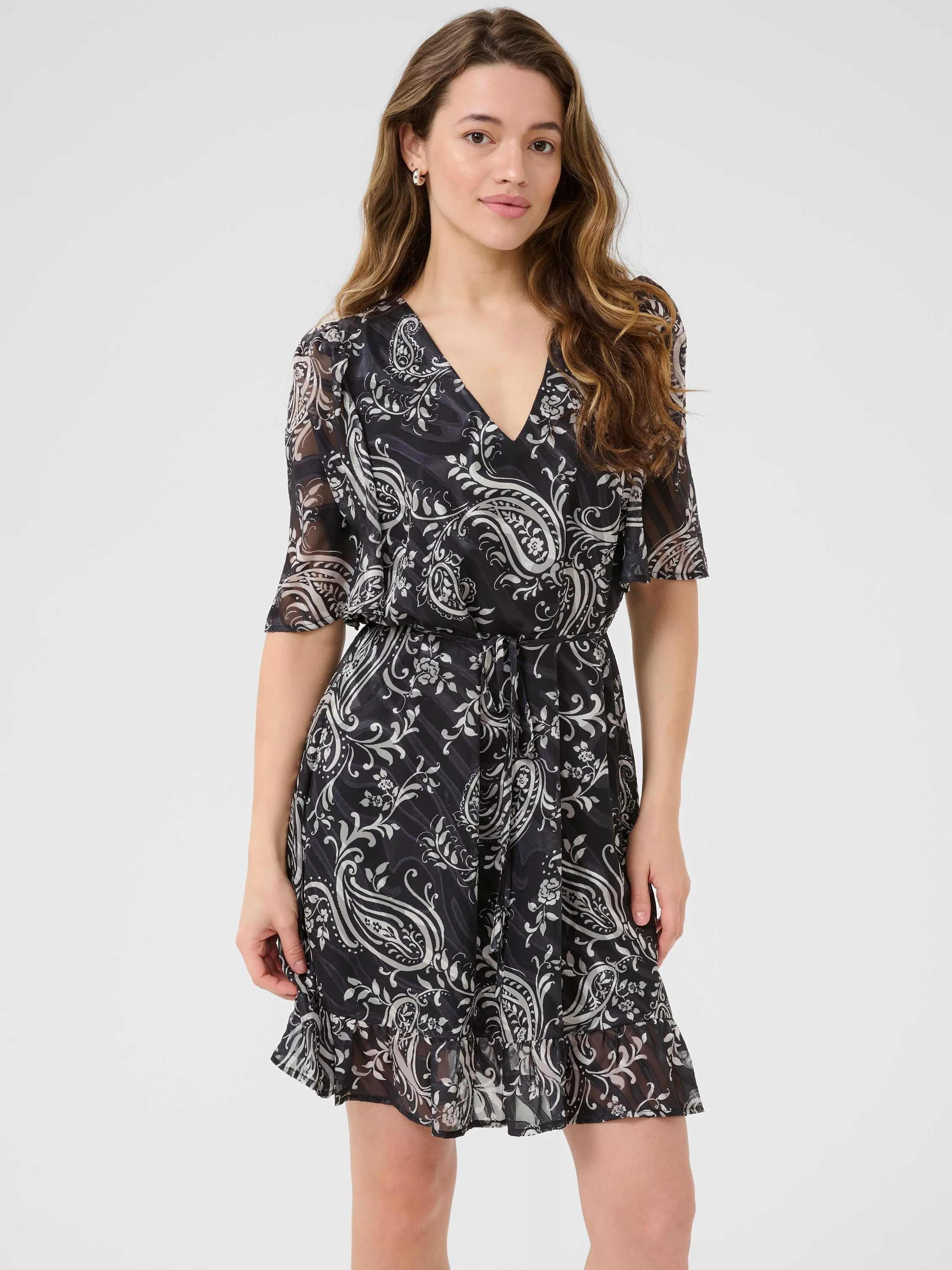 KAFFE's mini fit-and-flare dress brings a lively paisley pattern to your everyday, blending comfort and charm for any daytime plan. Its playful V-neck and short sleeves make dressing up feel effortless.