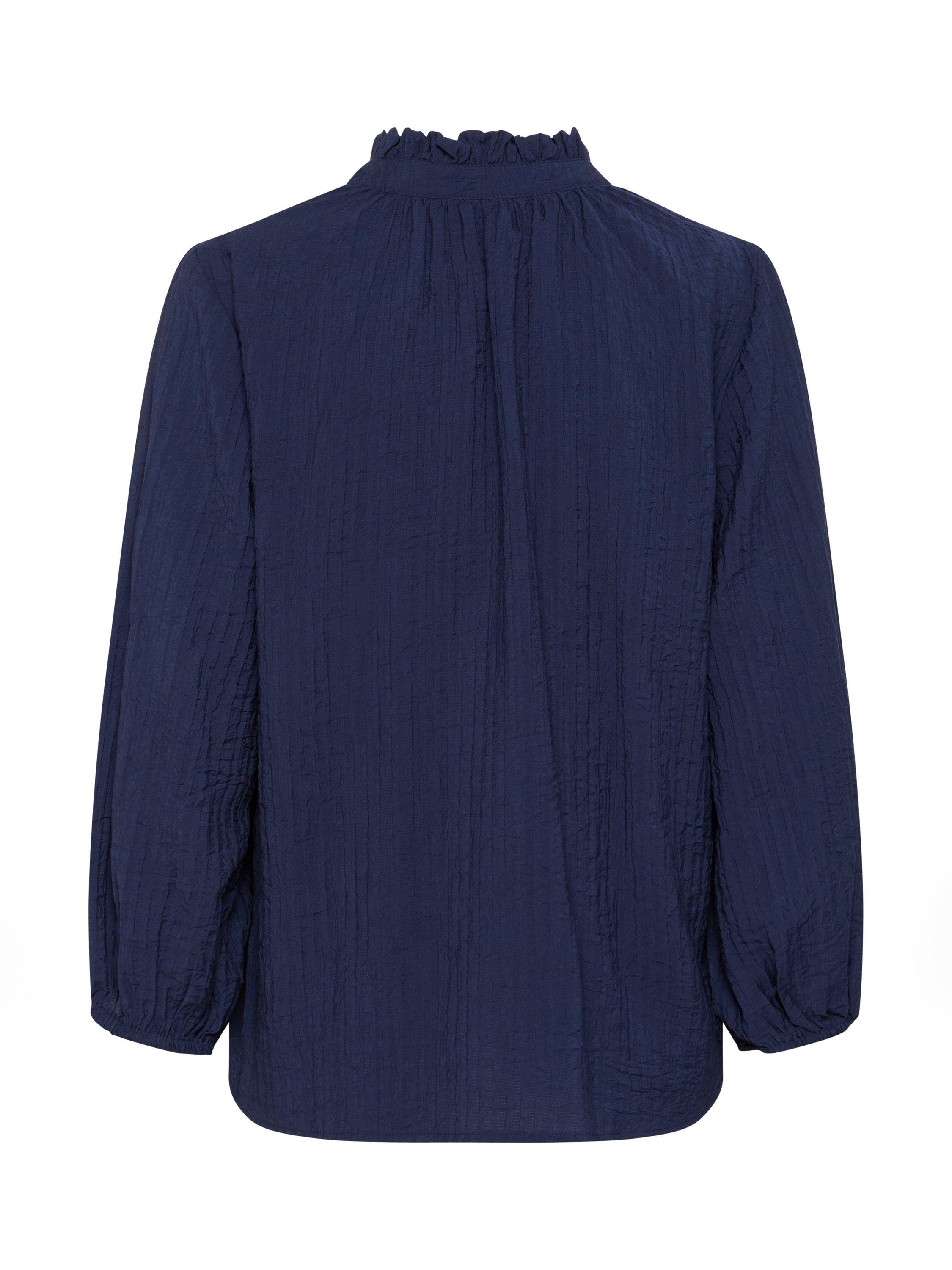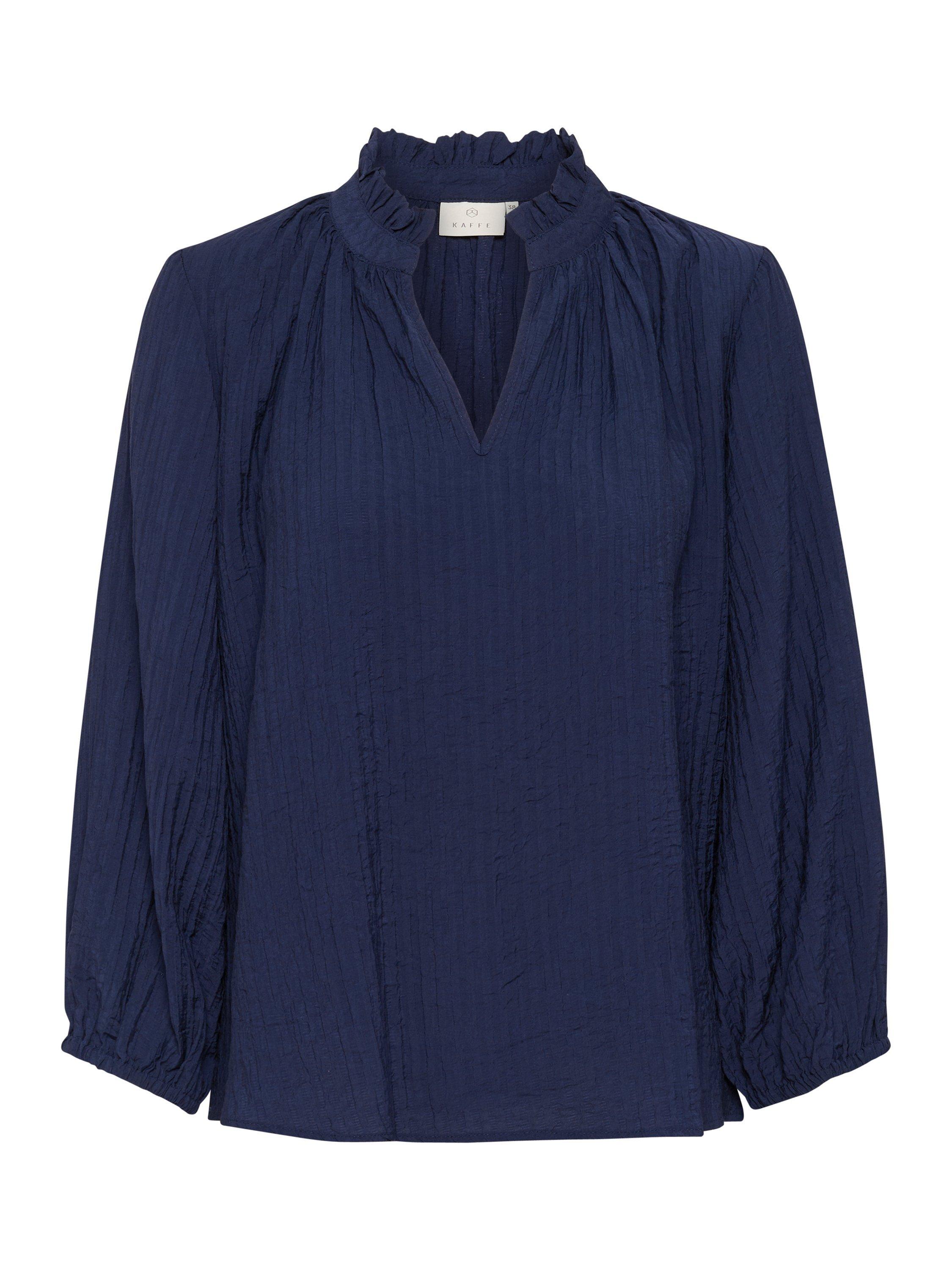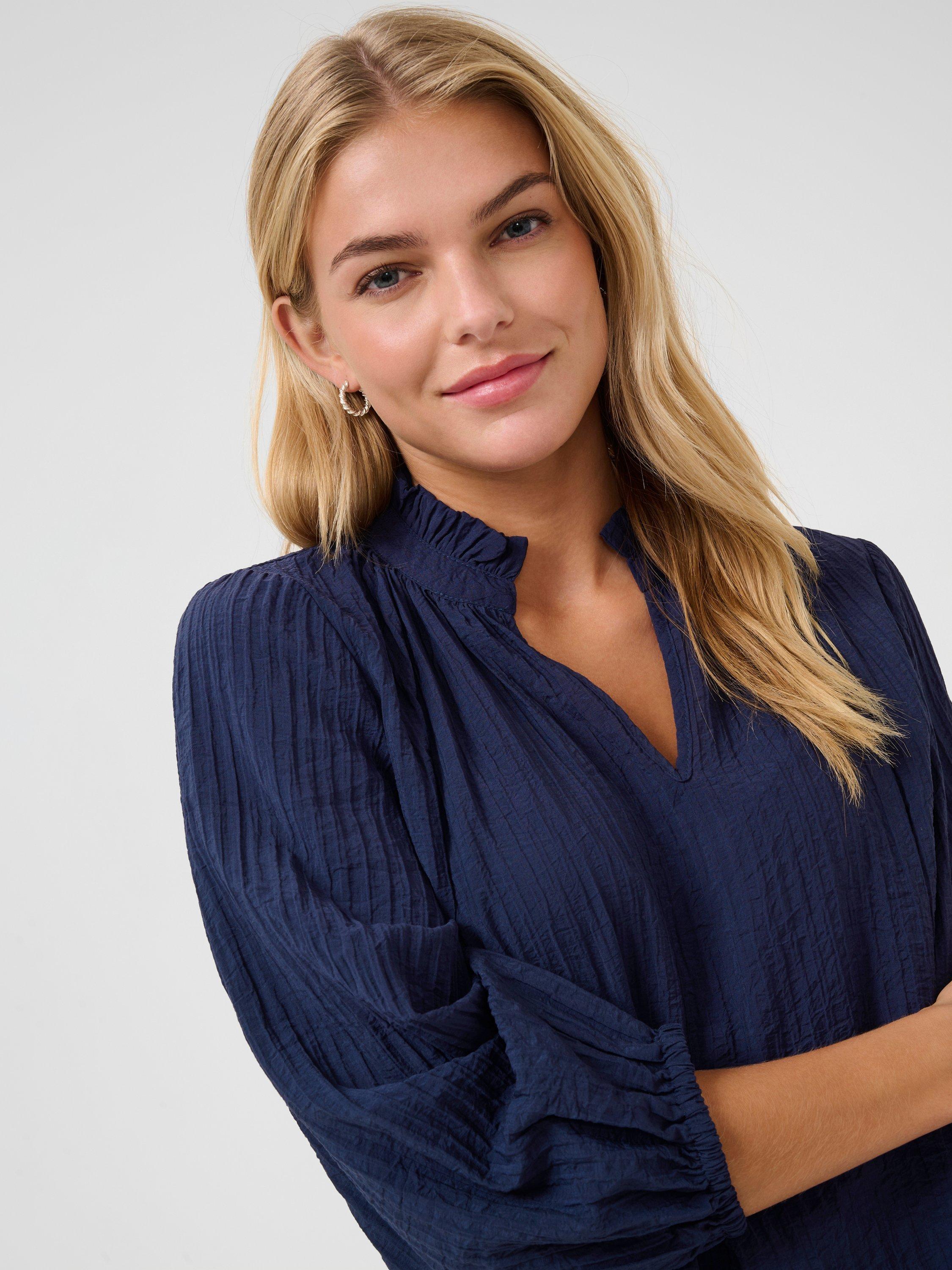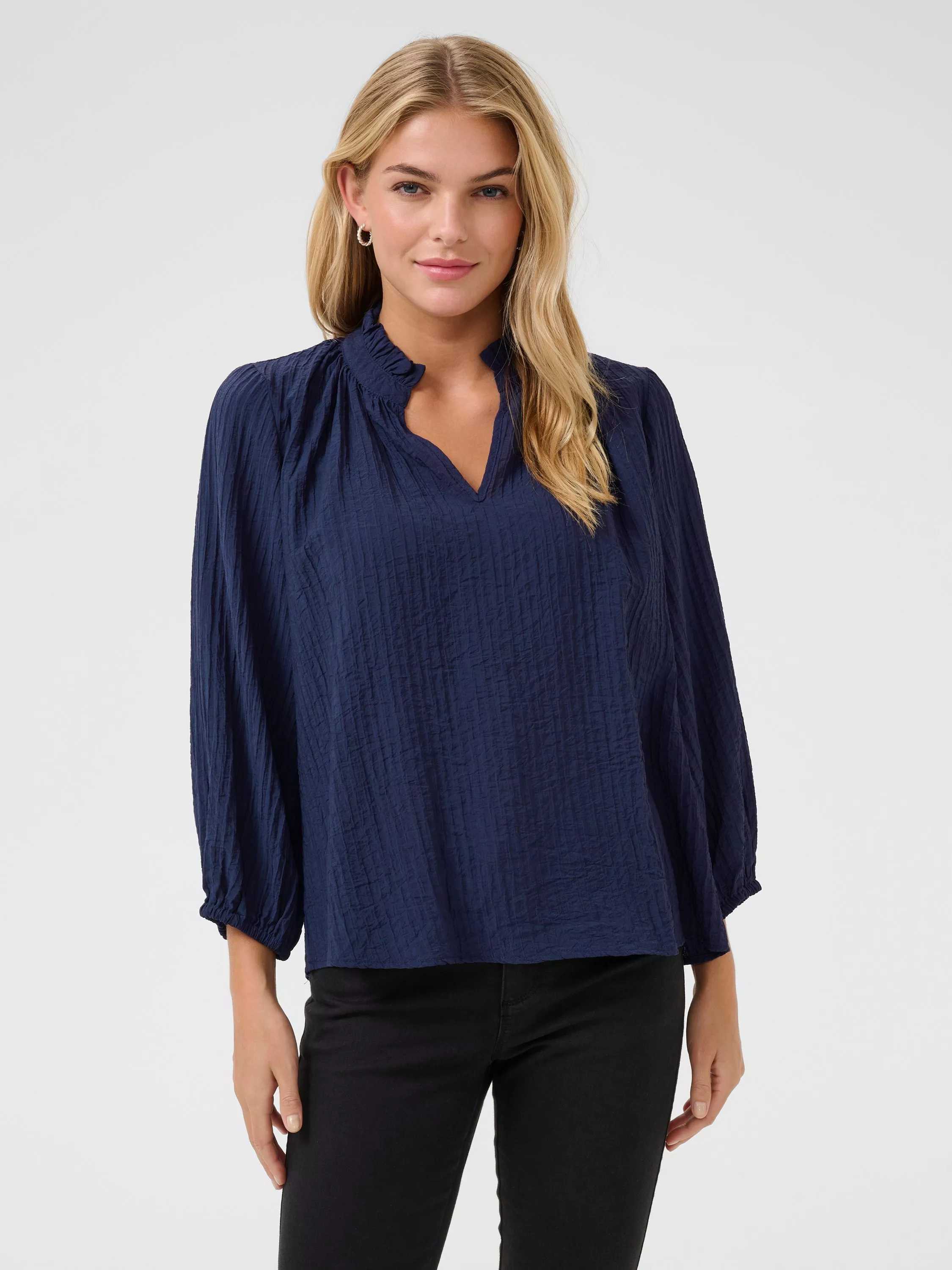 The lena blouse is a casual and versatile top and a great addition to your everyday wardrobe. It has a V-notch neck with a frilled collar, and it has a loose fit. The sleeves are 3/4 length balloon sleeves with a soft volume and elastic edges, and the blouse is made in a light fabric with woven stripes.