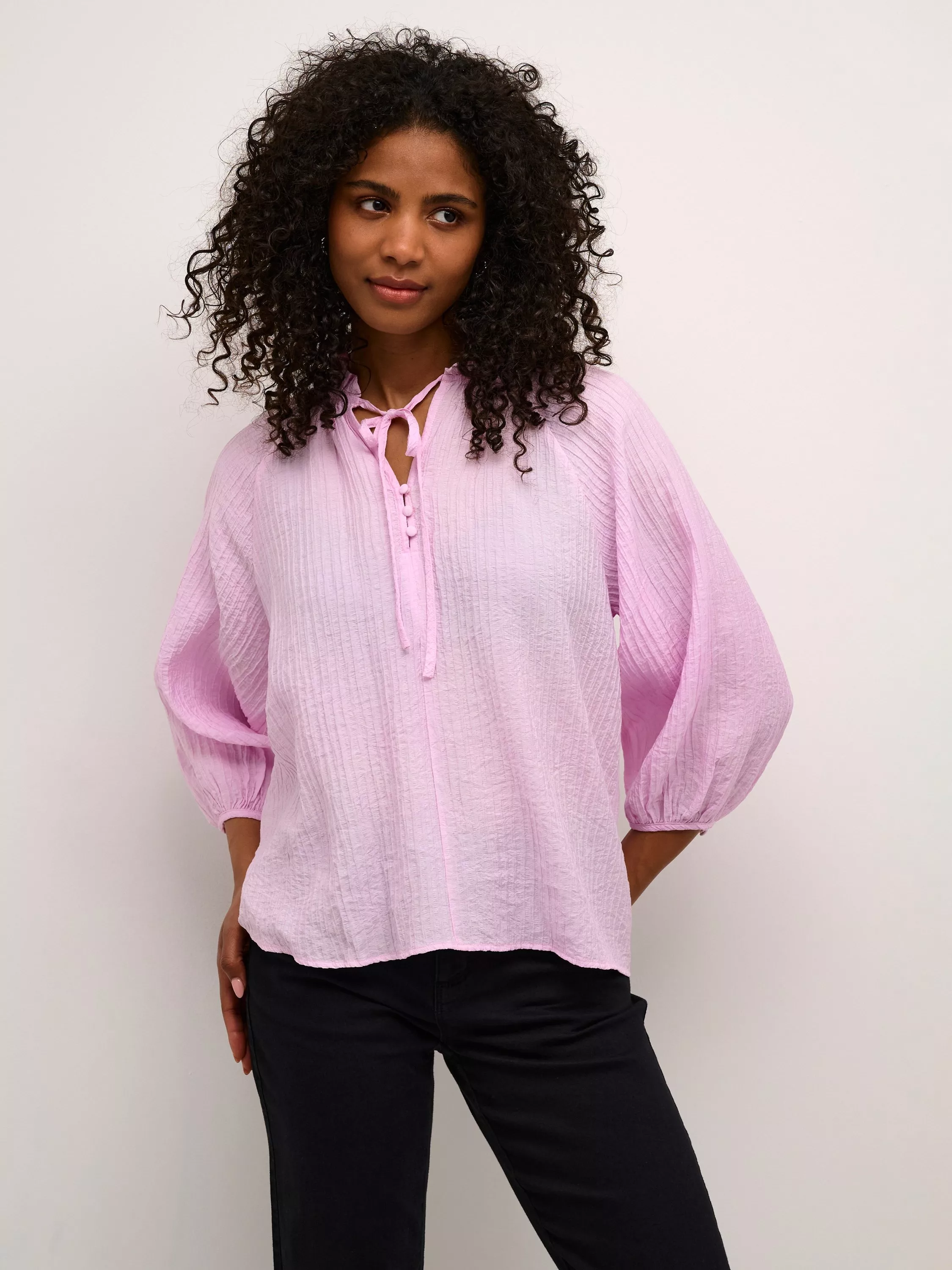 An effortless choice, this blouse from KAFFE will give your wardrobe the refresh it needs. With a V-notch henley neck with a frilled collar, buttons and tie-fastening, it has a regular fit and voluminous elasticated cuff sleeves.