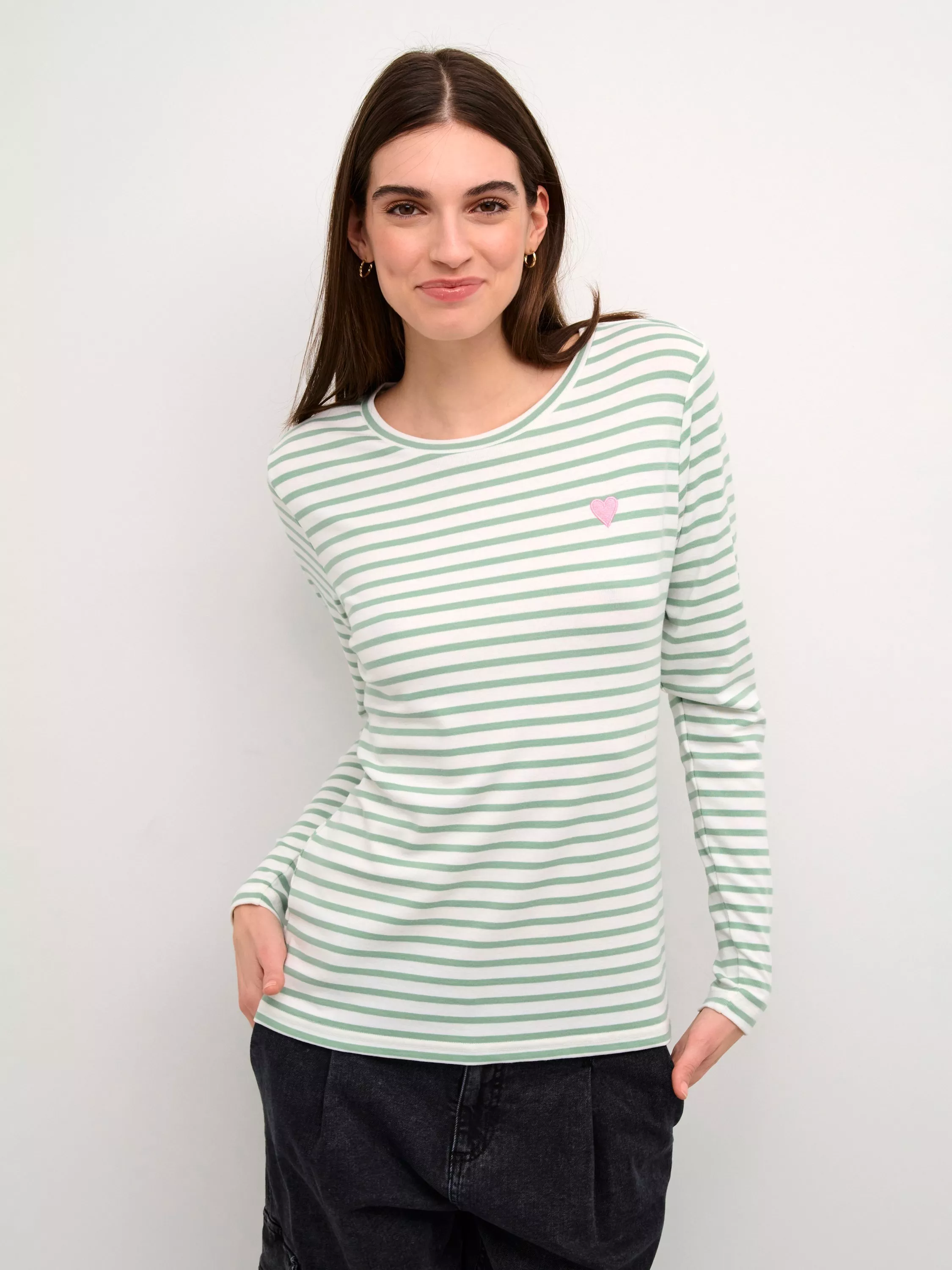 The Liddy T-shirt is a simple, long-sleeved Tee with a Parisian feel to it. It has narrow horizontal stripes, and on the left side it has an embroidered heart. The T-shirt is made in a soft and stretchy jersey fabric, and it has a slim fit.