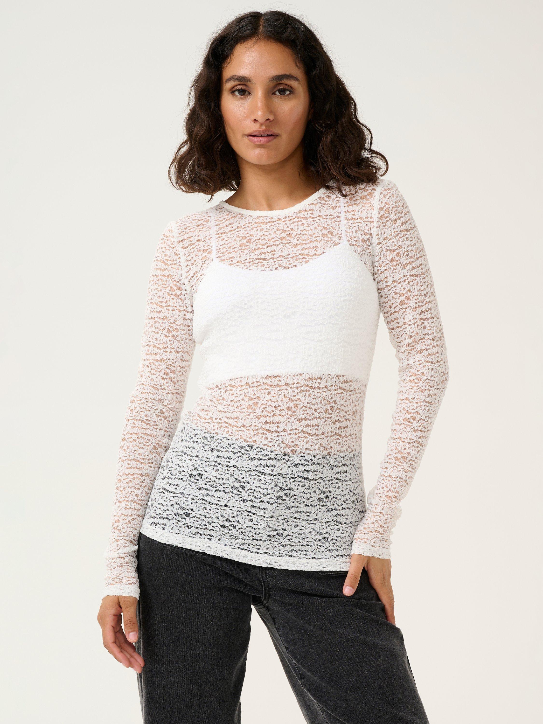 The linda T-shirt is a simple top that can be styled in endless ways. It has a round neck and is made in a sheer lace fabric, and it has a slim fit. The sleeves are long, and the T-shirt is cut at the hips.