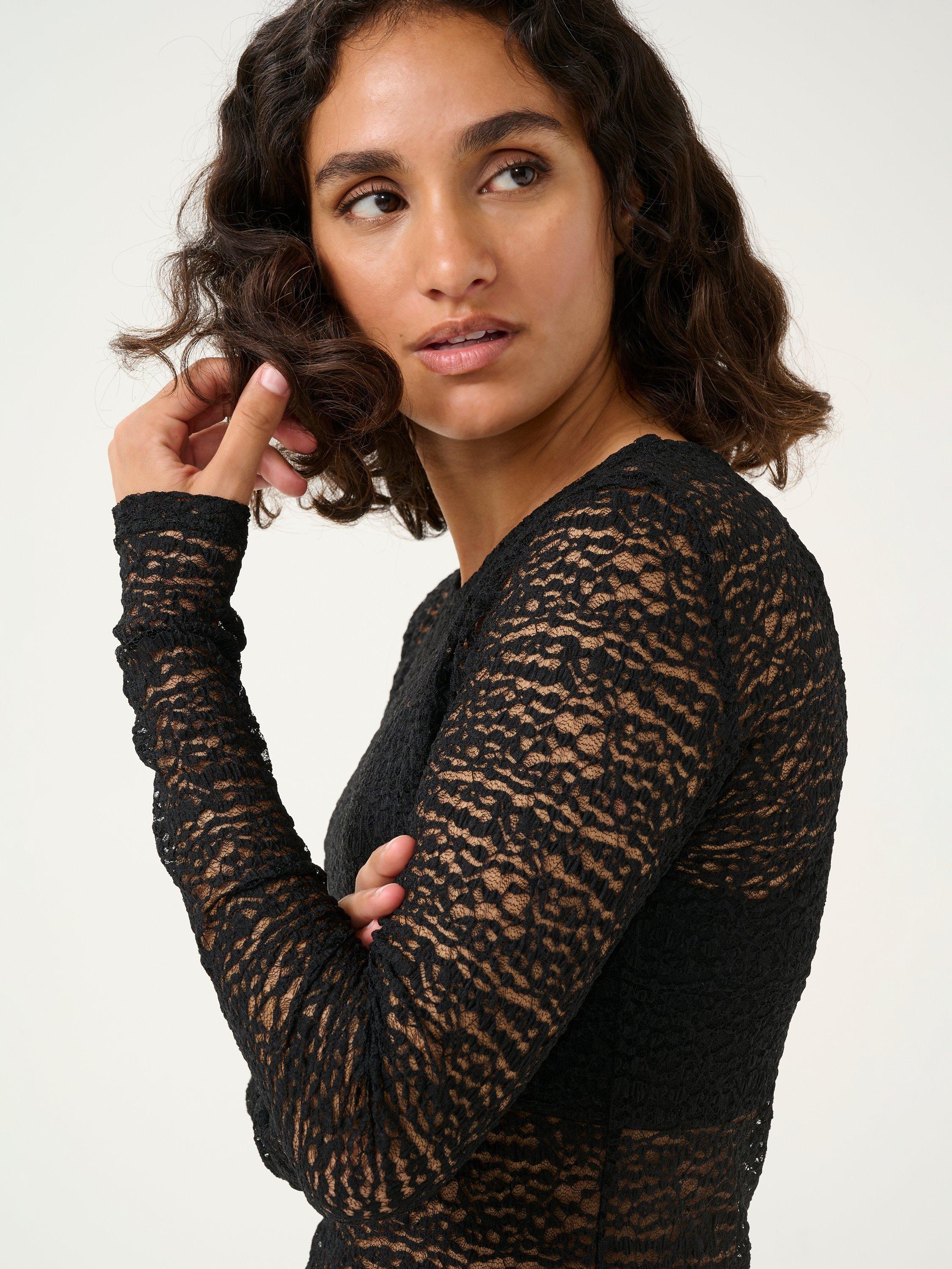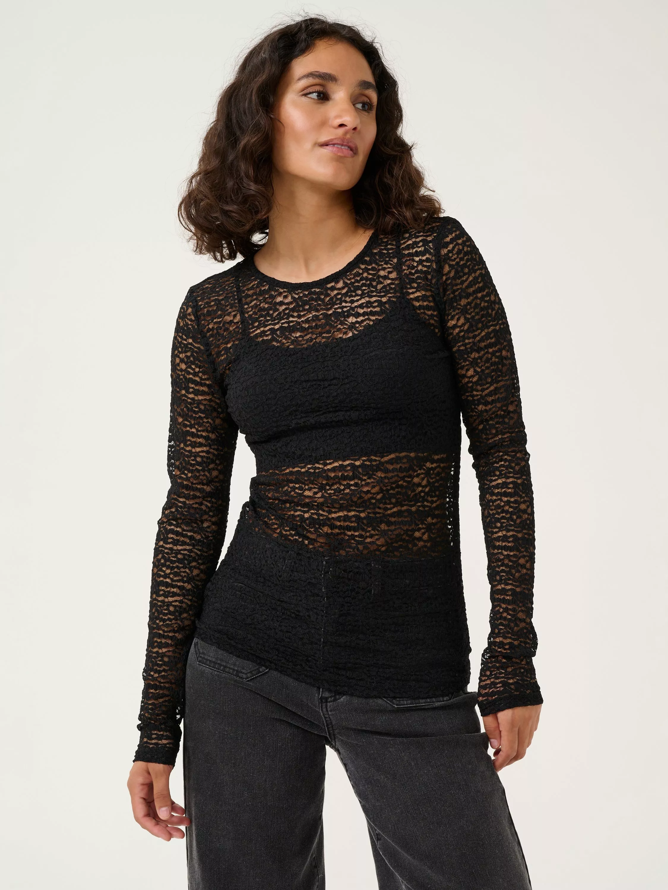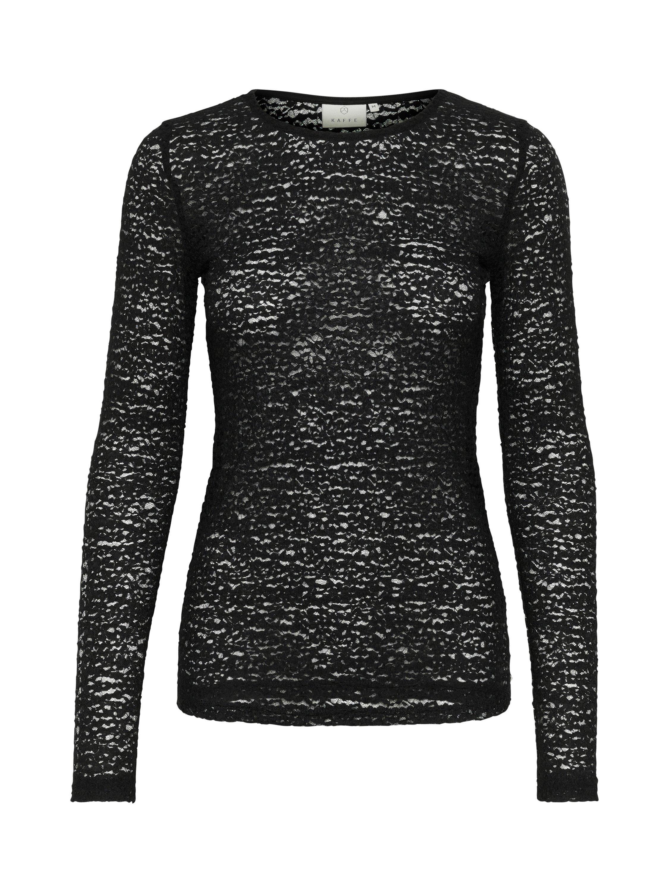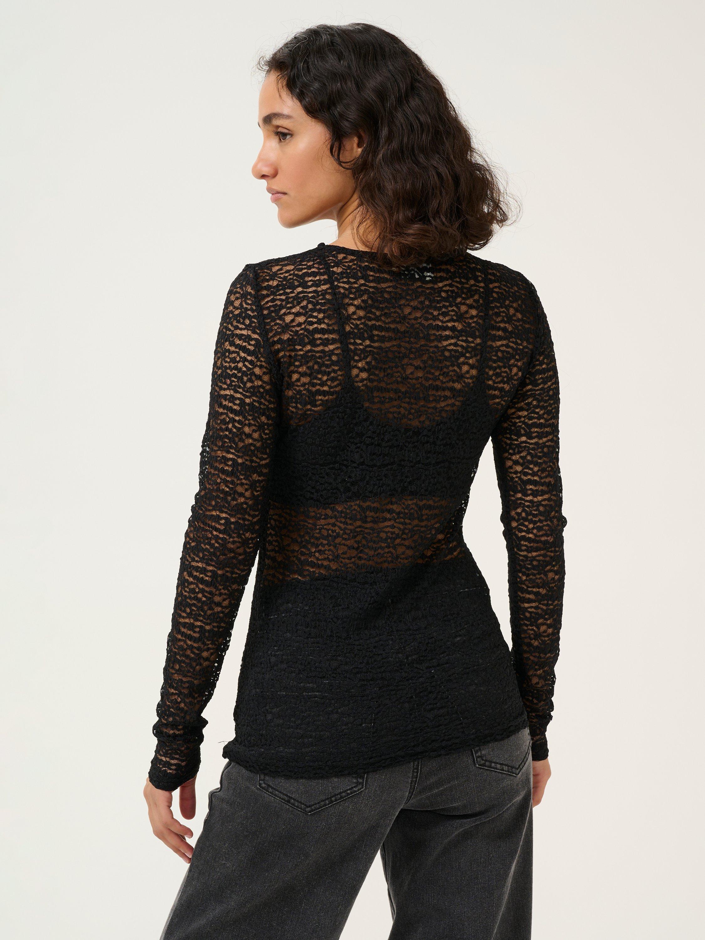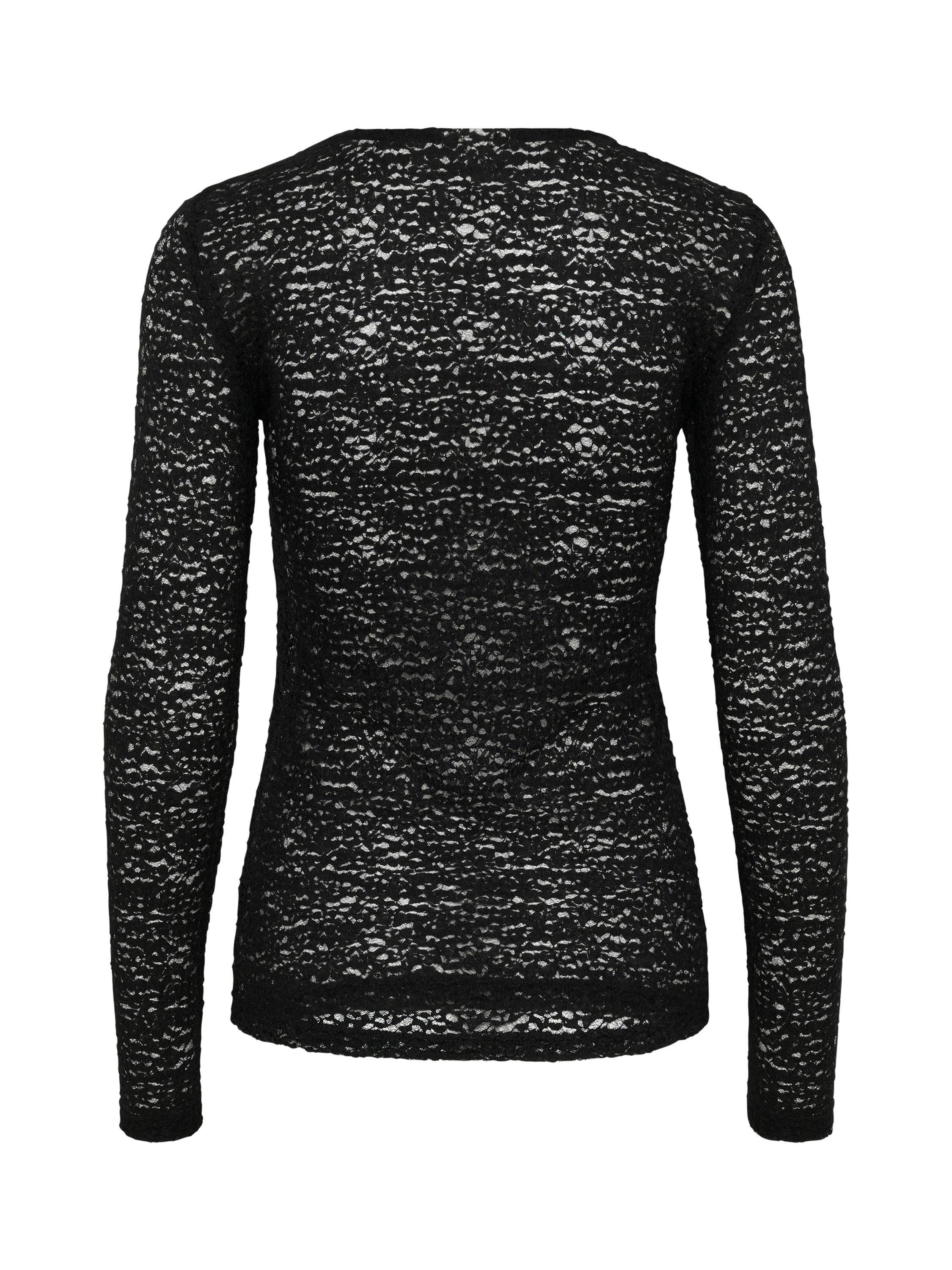 The linda T-shirt is a simple top that can be styled in endless ways. It has a round neck and is made in a sheer lace fabric, and it has a slim fit. The sleeves are long, and the T-shirt is cut at the hips.