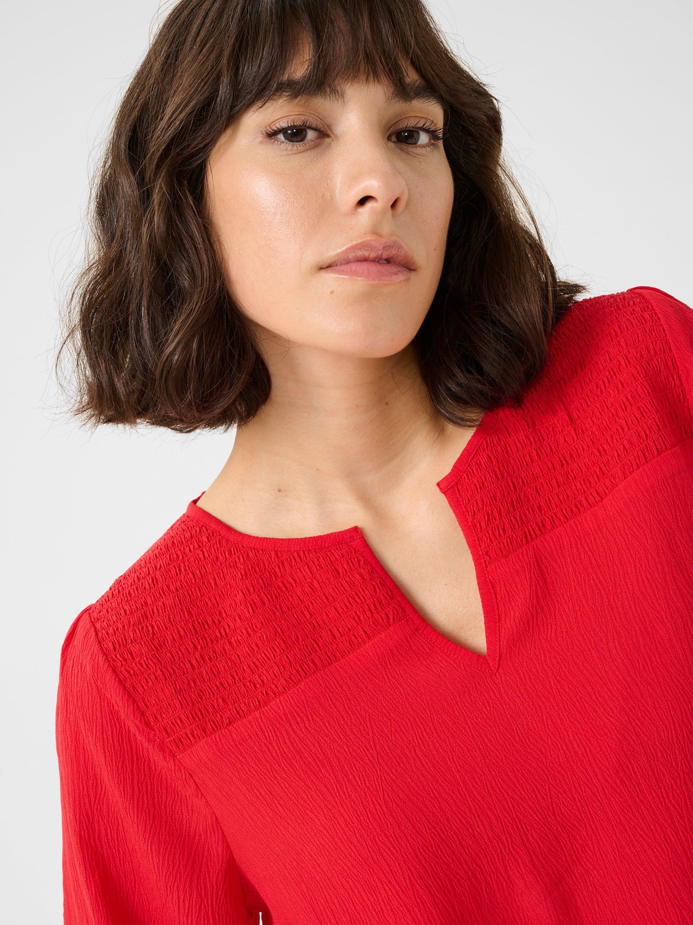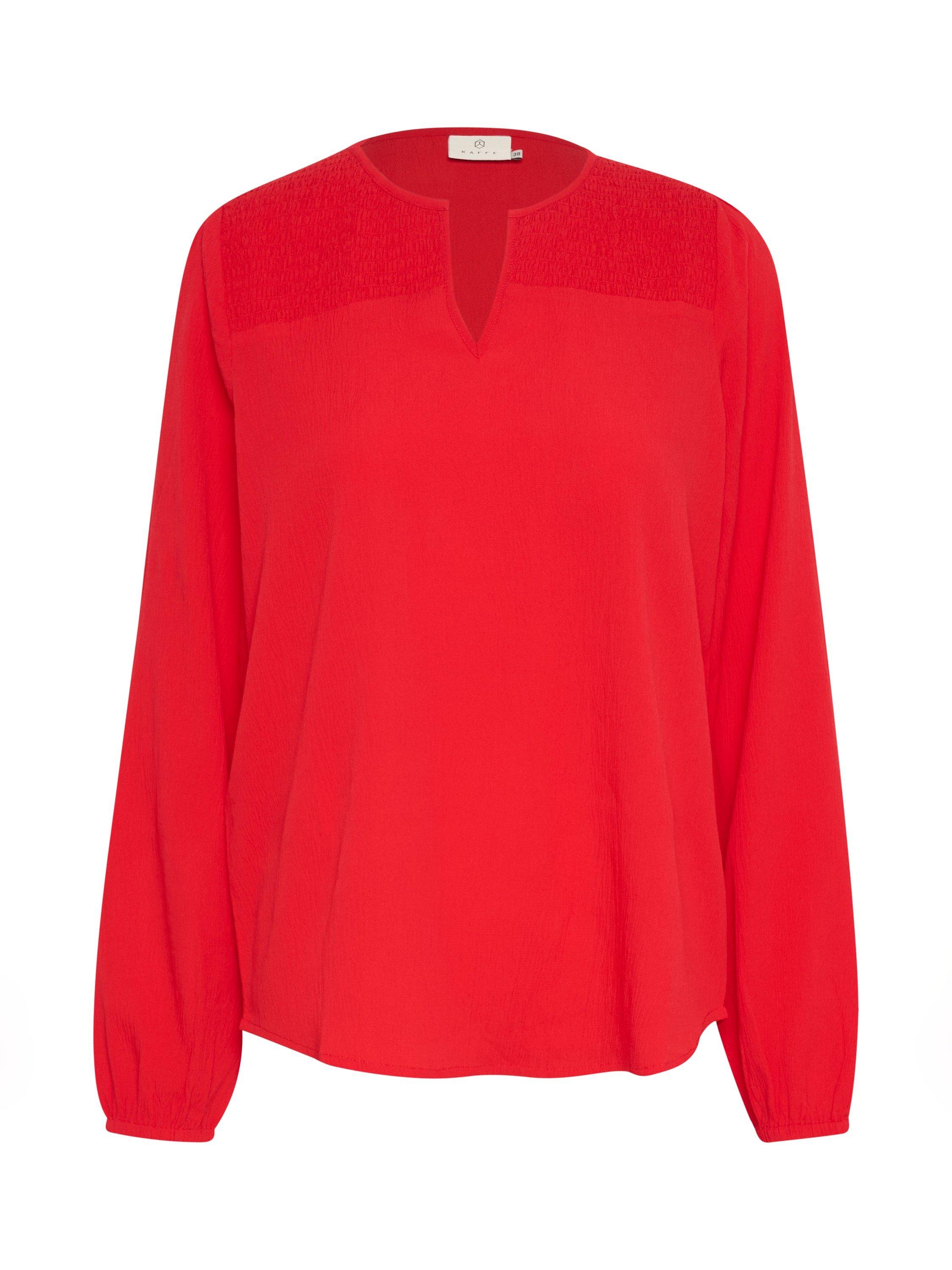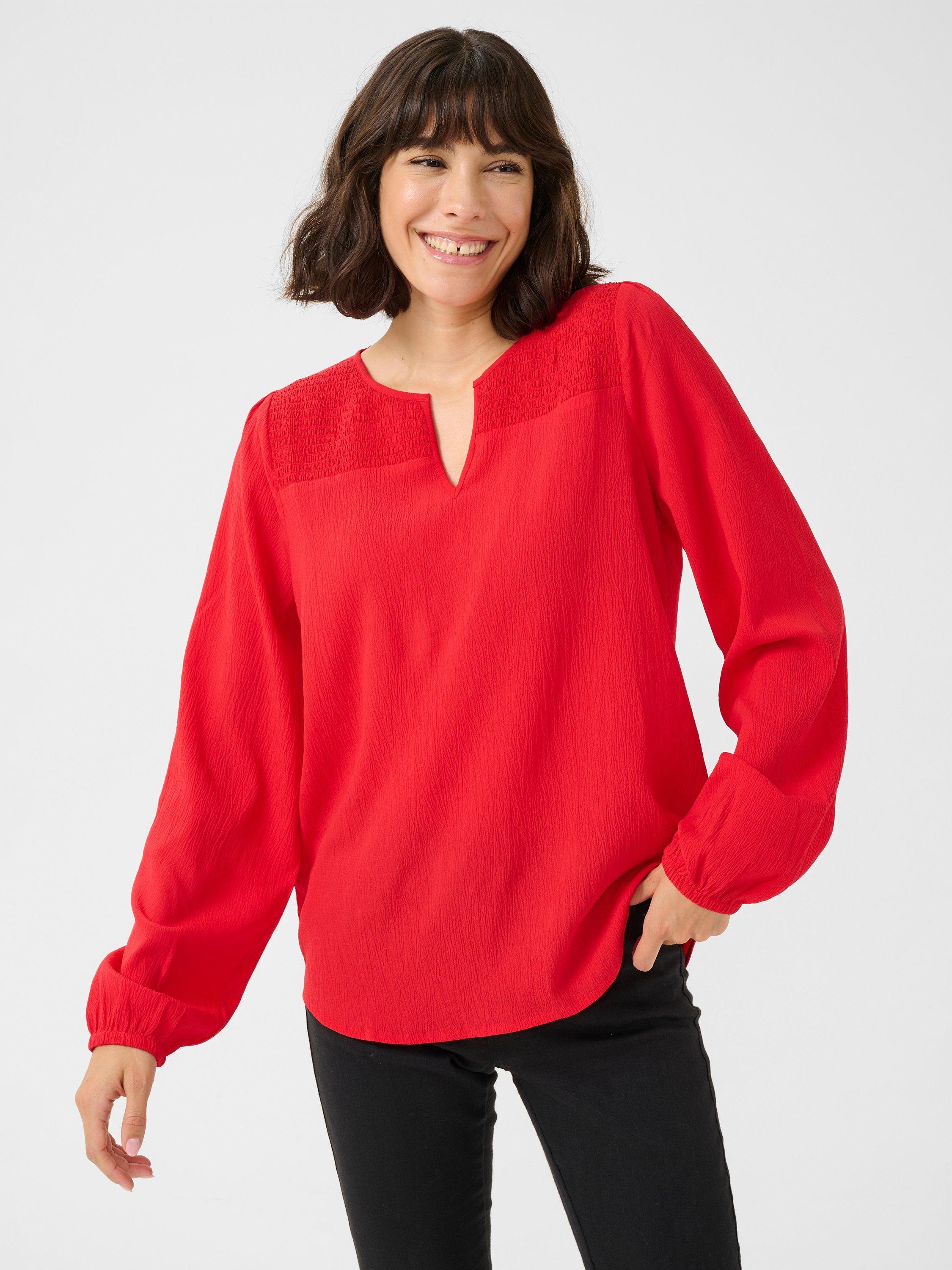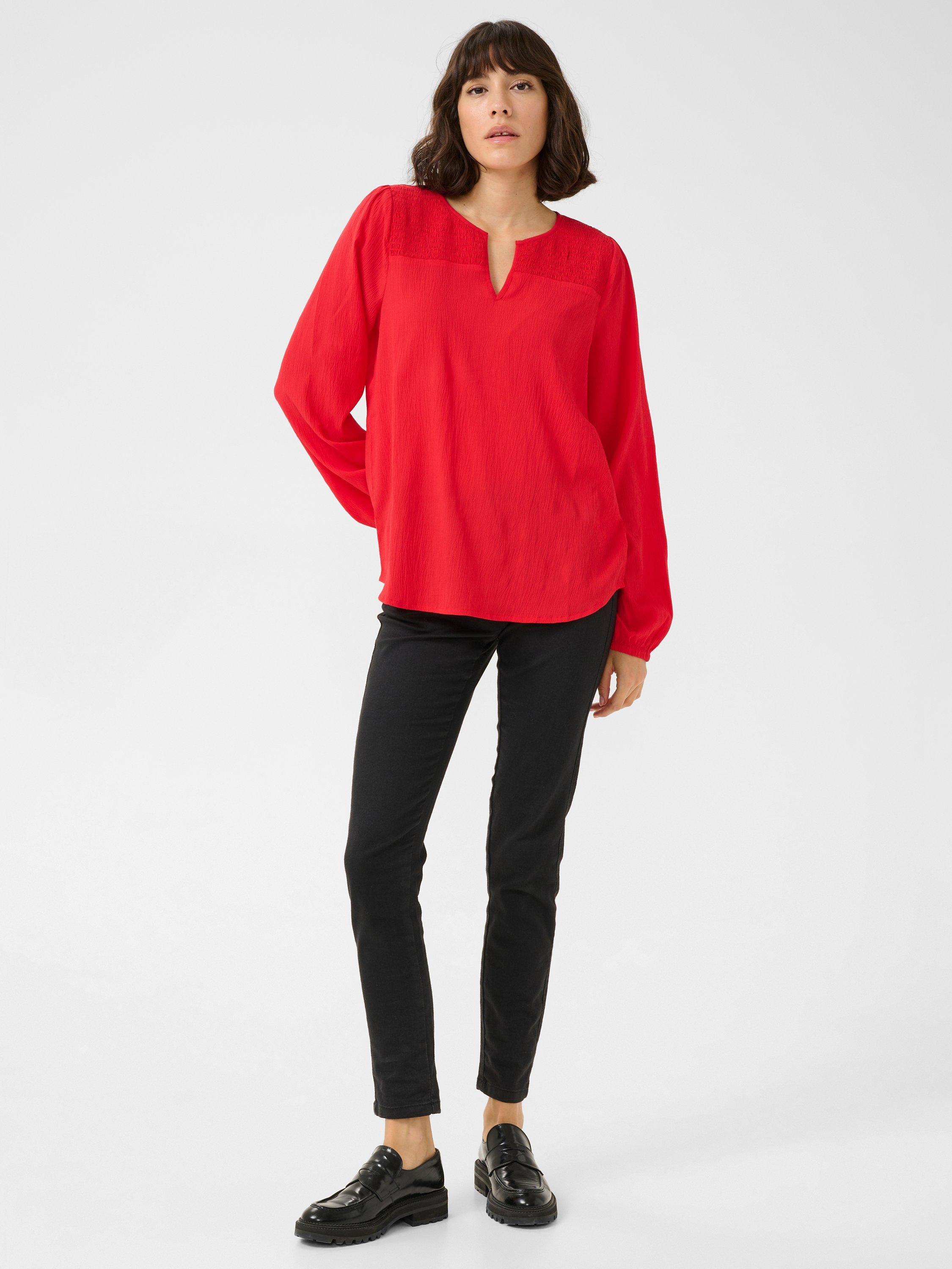 The linda blouse is a simple and feminine top that will look great with both trousers, jeans, and a skirt. It has a V-notch neck and a smocked yoke at the front, and it has a regular fit. The sleeves are long and voluminous bishop sleeves, and they are gathered in an elastic edge.