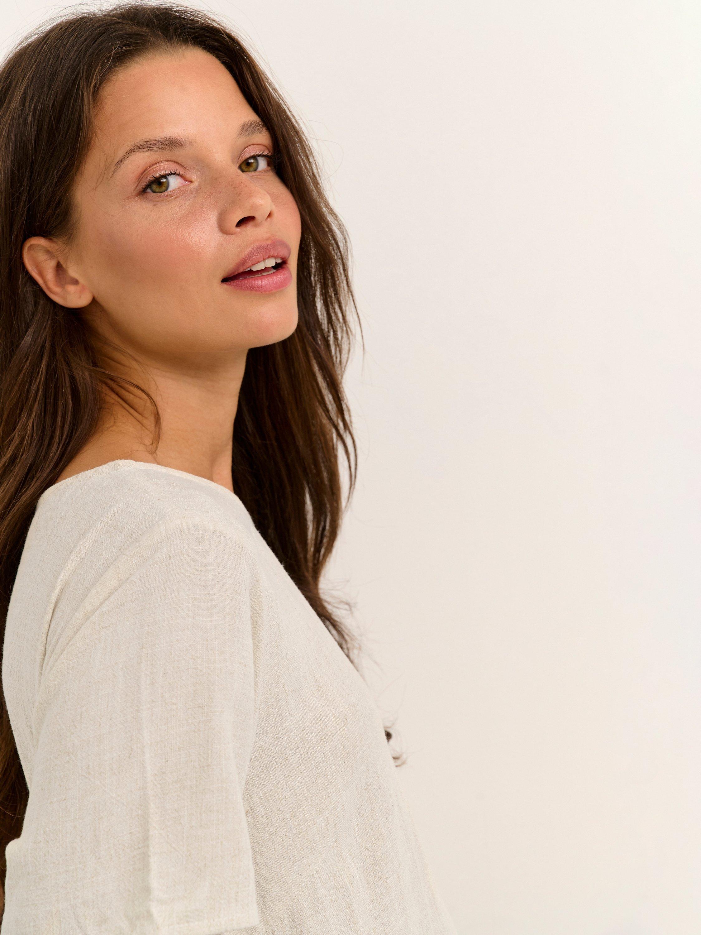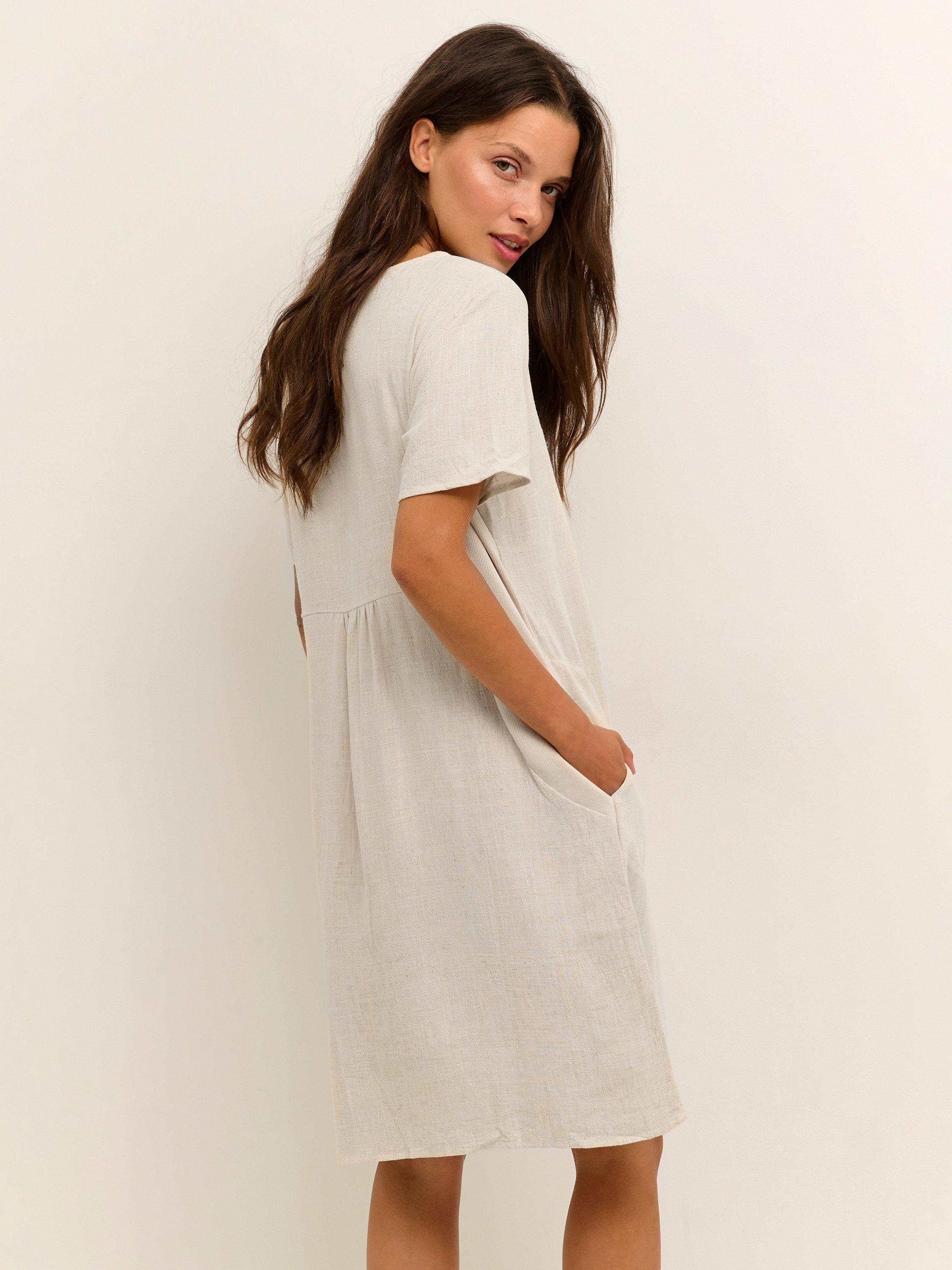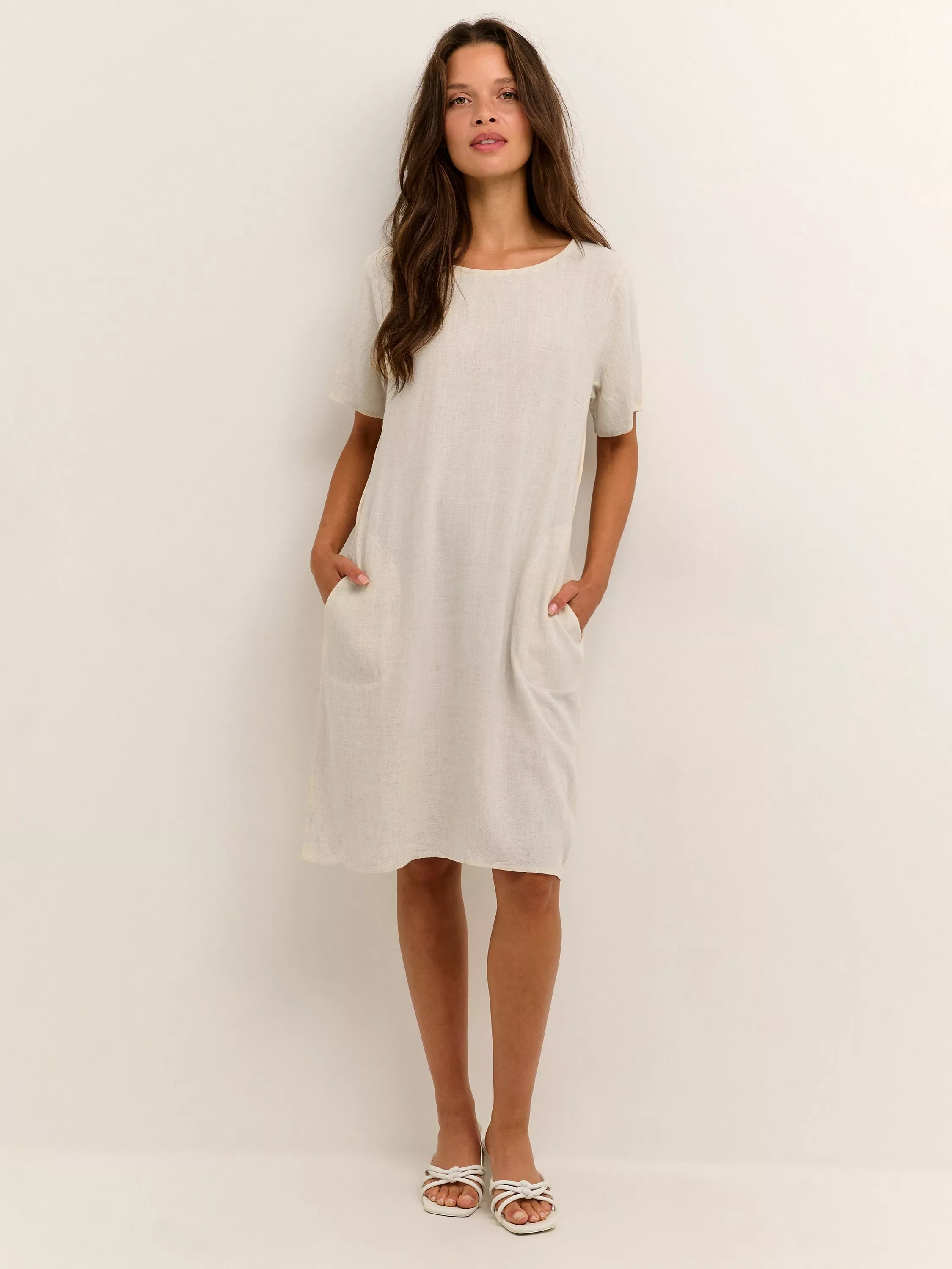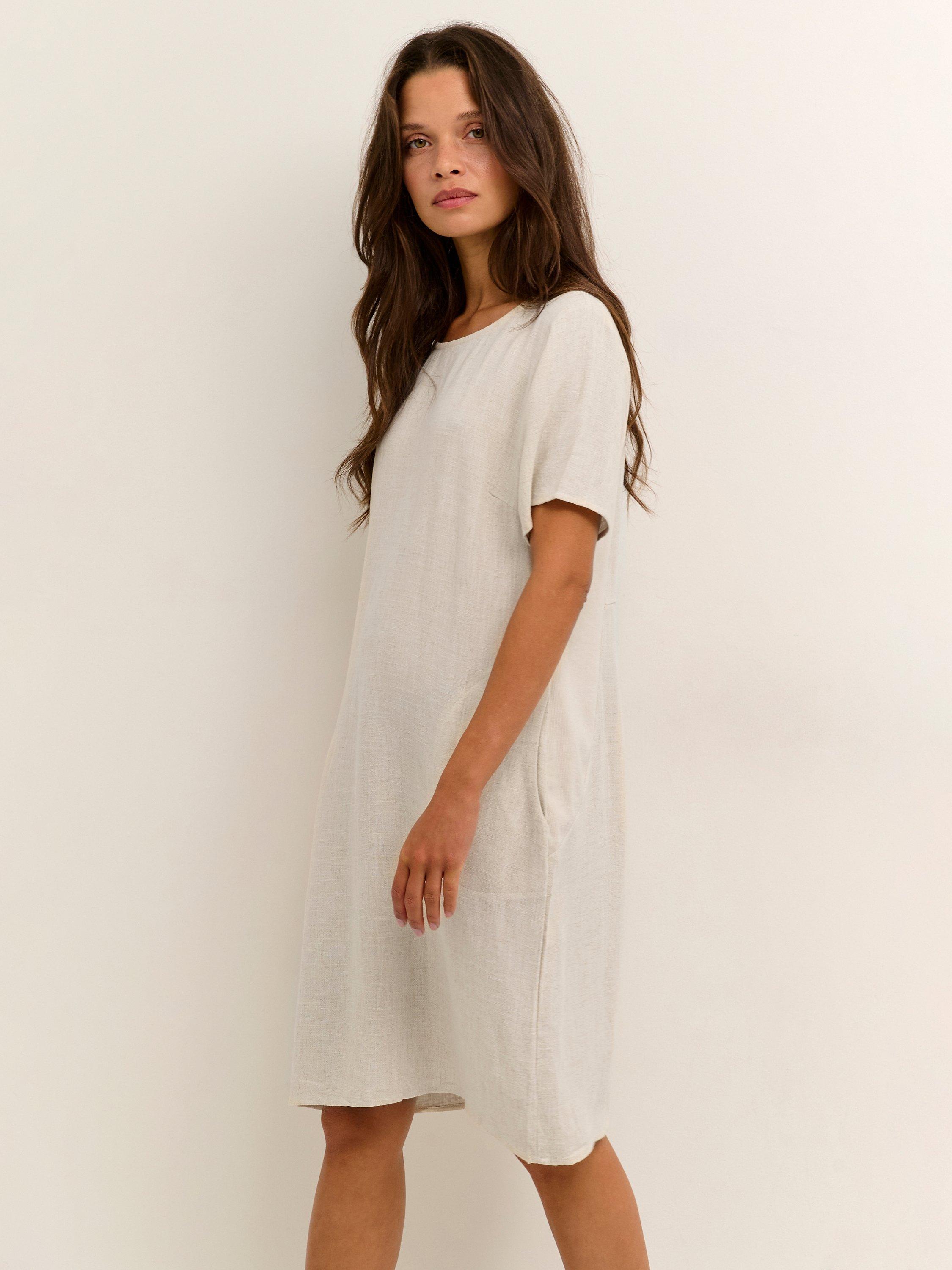 The embodiment of laid-back dressing, this knee length dress from KAFFE is made from a linen blend known for its light, airy quality. With a fuss-free round neckline and short sleeves, it comes without pattern or print so you can set your imagination and creativity free when it comes to accessorising.