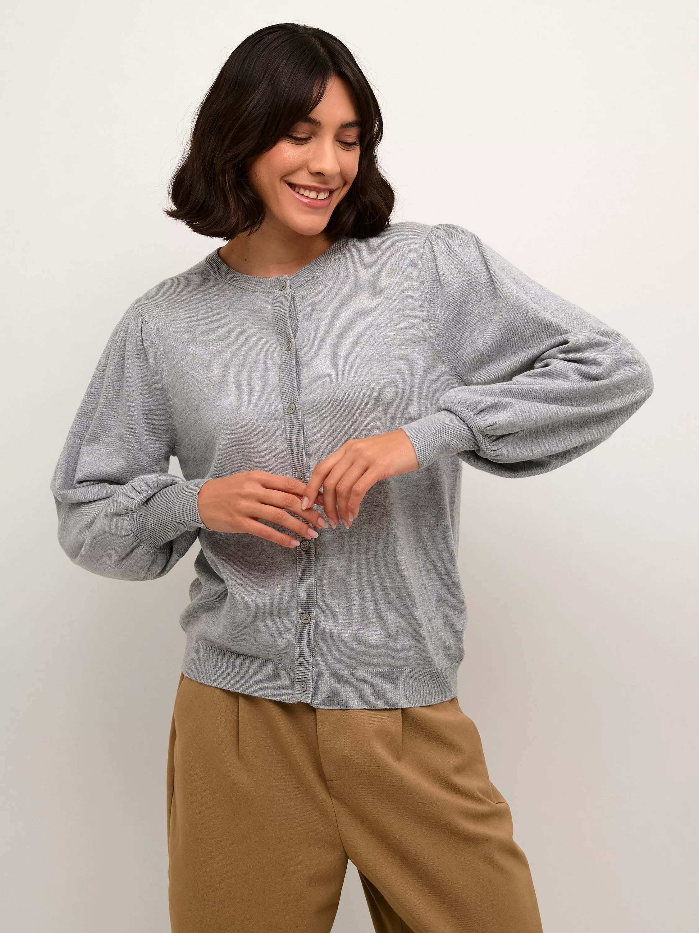 The lizza cardigan is a simple and feminine cardigan in a light knit. It has a round neck and small buttons for fastening. The sleeves are long and voluminous bishop sleeves with knitted cuffs. The cardigan has a regular fit and it is cut at the hips.